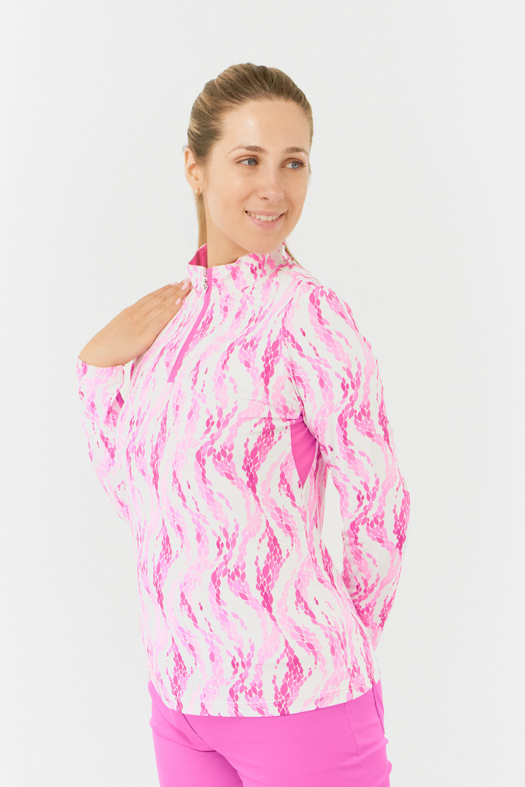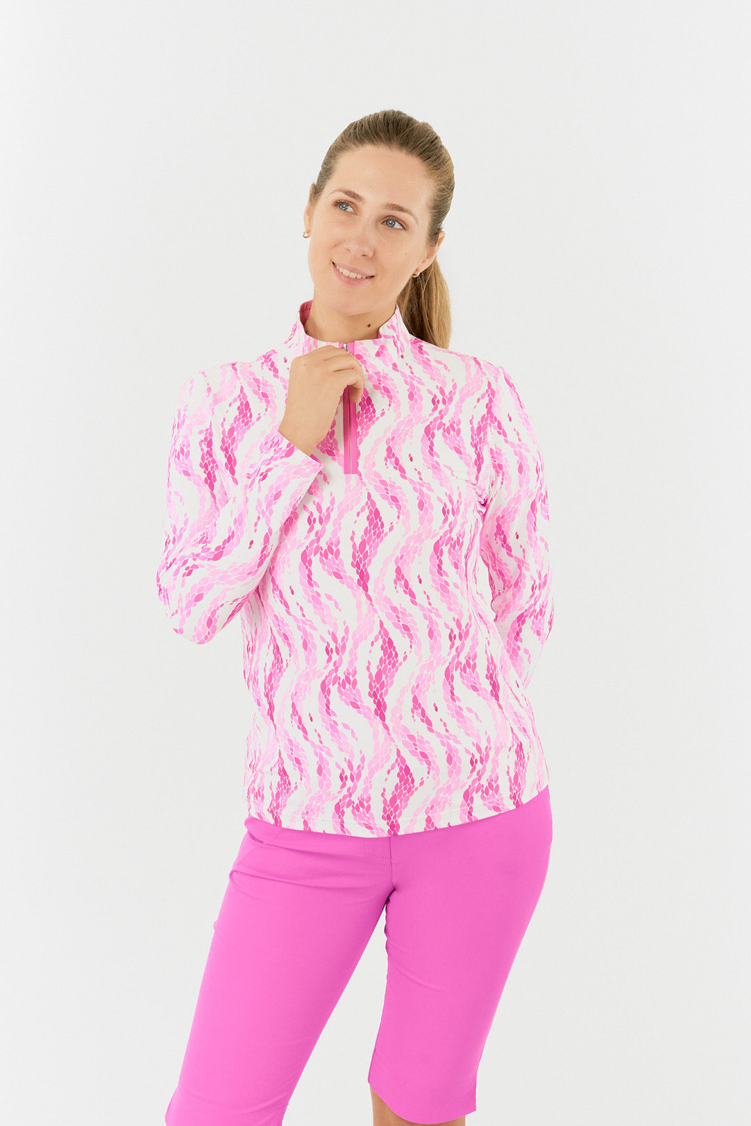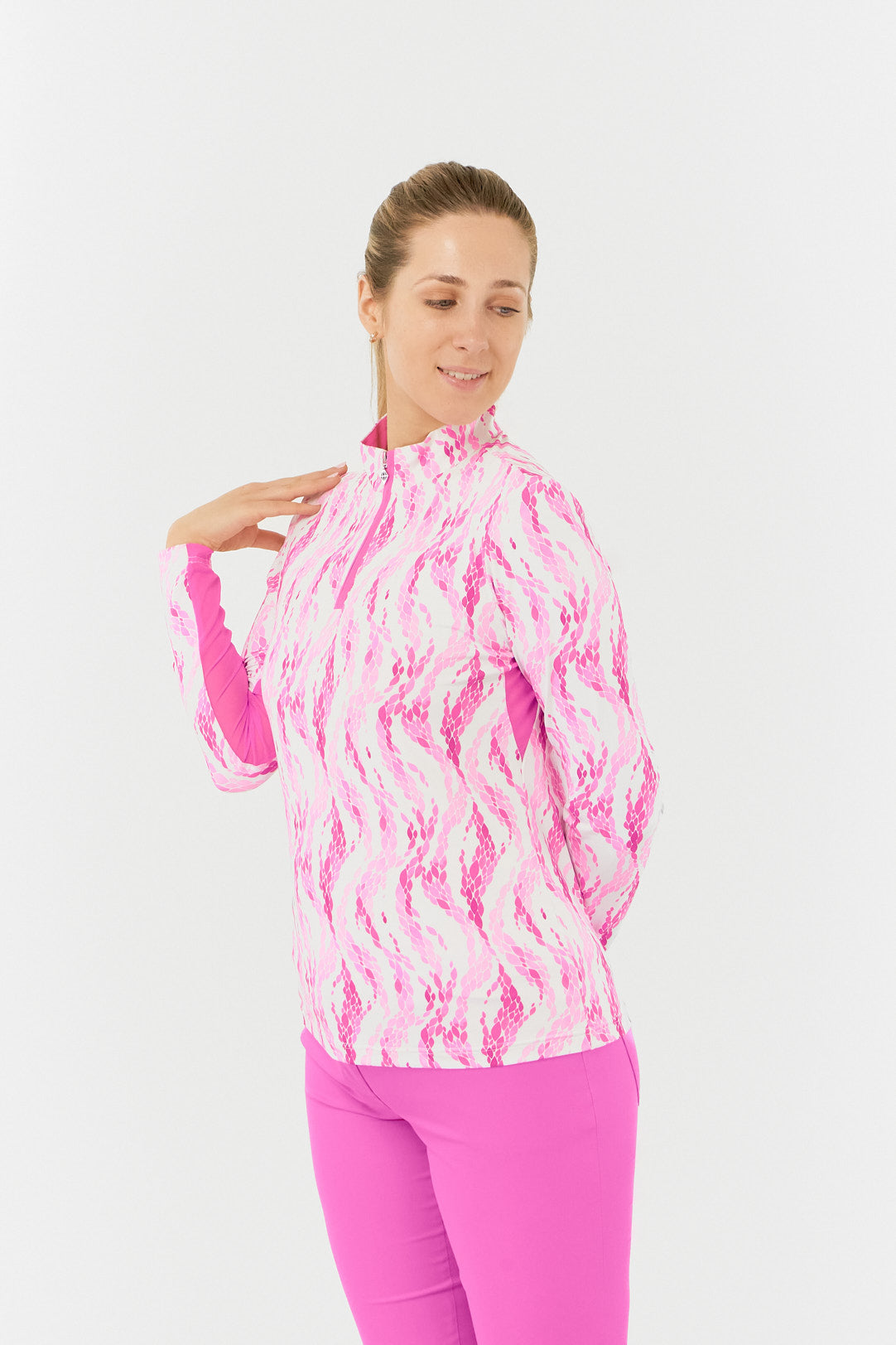 Elevate your golf game with the Rose Water Pure Golf Balance Long Sleeve Zip Top. Designed to blend style and function, this top features a striking print showcasing layers of gentle petals in three shades of pink. Discover the core elements below and see why the must-have Balance top is a game-changing addition to your golf attire.
