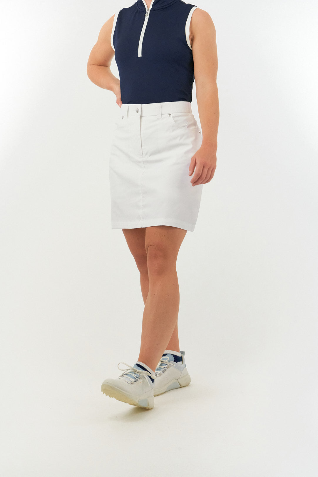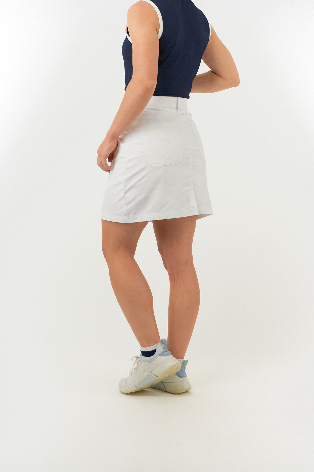 These Pure Golf white skorts are a classic- in a traditional style with zipper and button fastening. They are made from a four-way stretch quick drying fabric. They come with matching attached undershorts. Pure Golf won Brand of the Year 2023/24 for the quality and diversity of its golf apparel for women at all levels of the game.