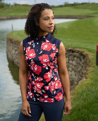 Callaway Golf Ladies Large Scale Floral Print Sleeveless Polo - Peacoat