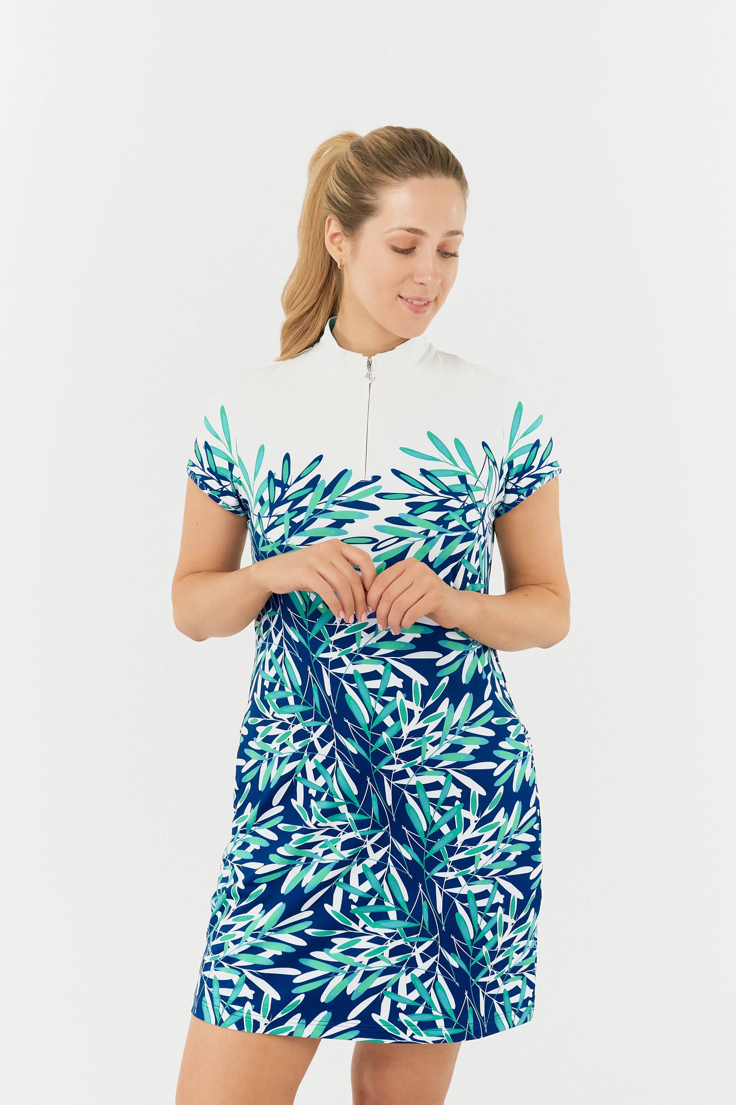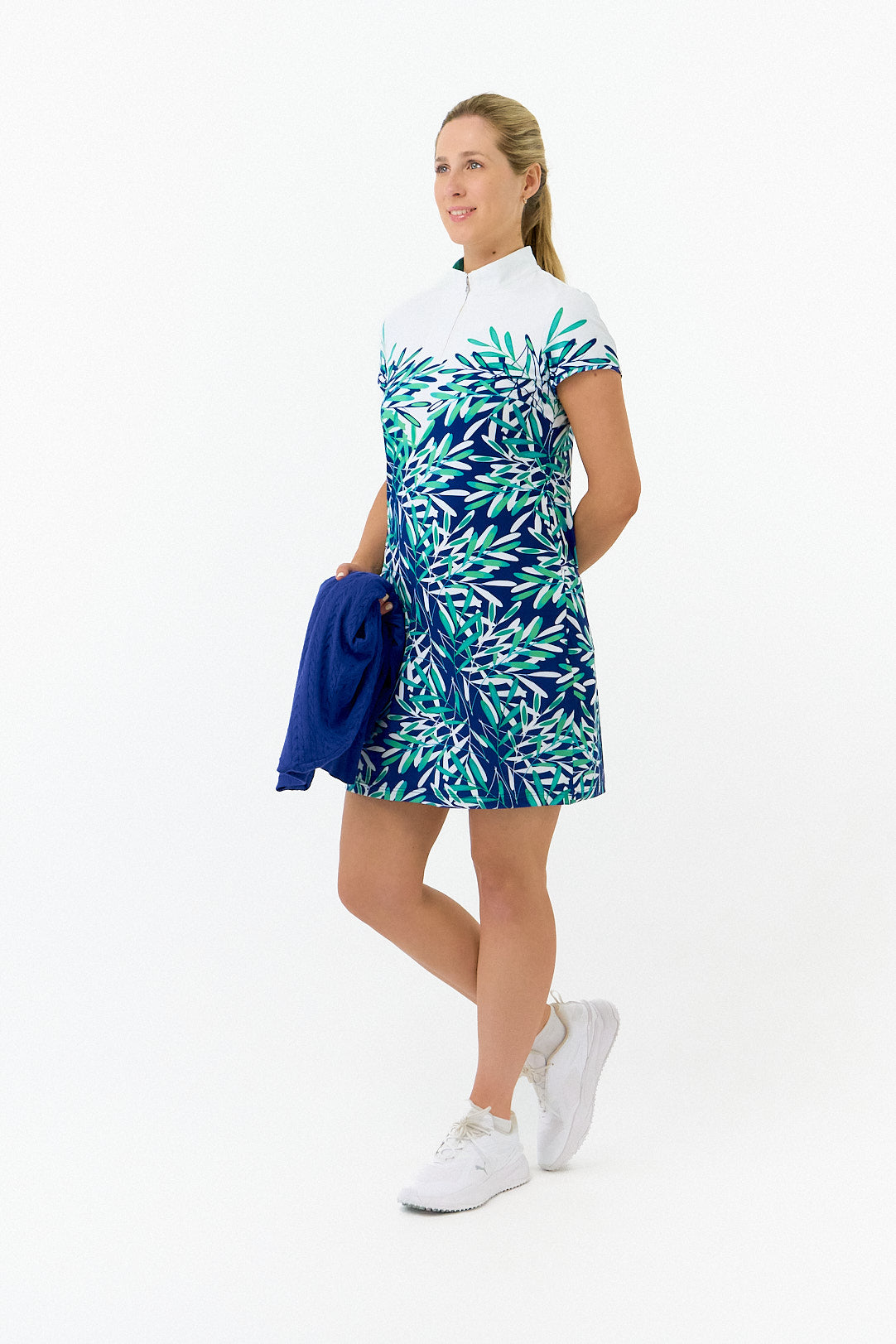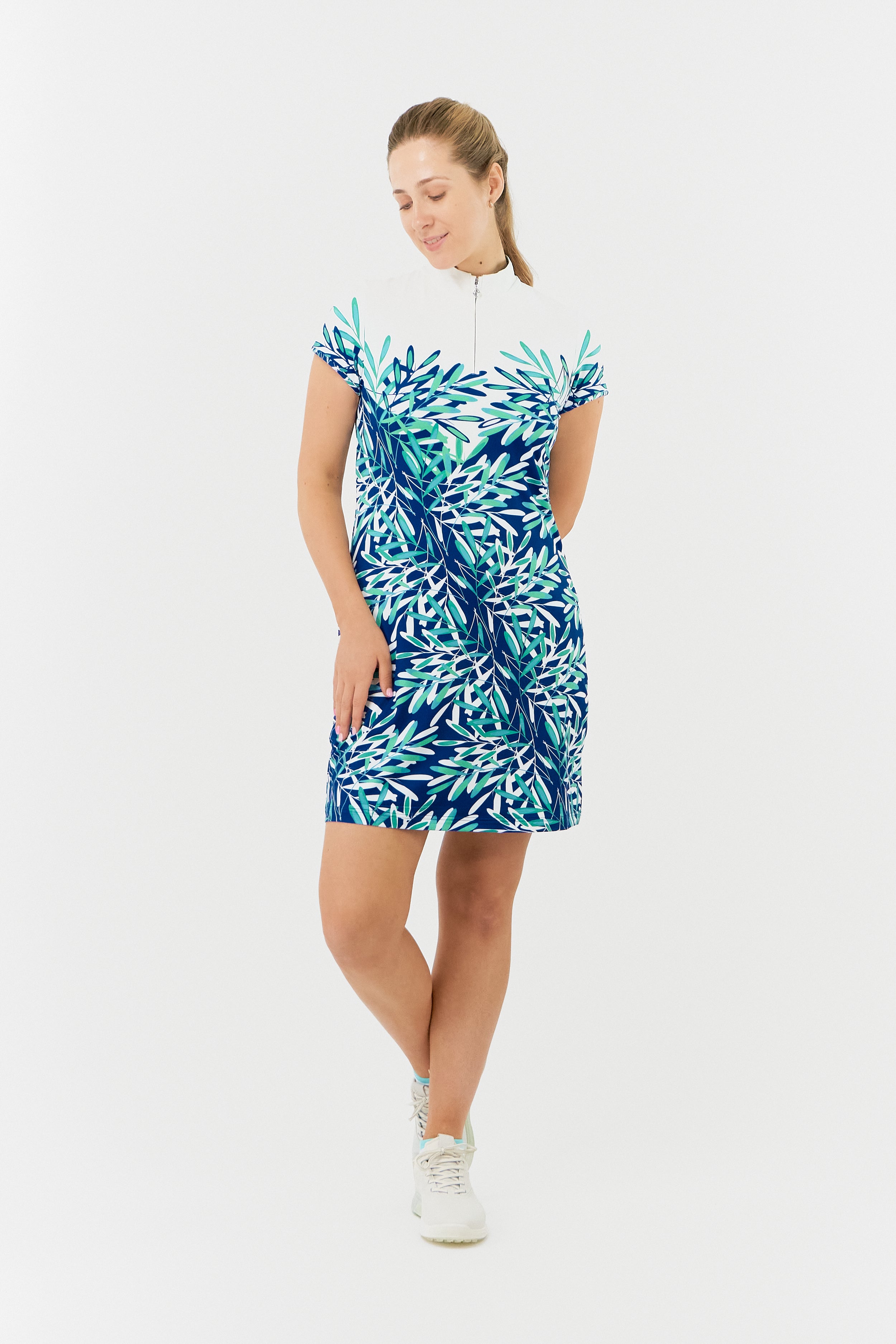Embrace Pure Golf's Carly Cap Sleeve Ladies Golf Dress in Floating Palms, the ultimate elegant and unique piece for your golf wardrobe. This remarkable dress showcases a stunning pattern and a variety of enhancing features, guaranteeing you stand out in both style and play on the green. You won't want to miss out on this essential for any fashionable golfer.