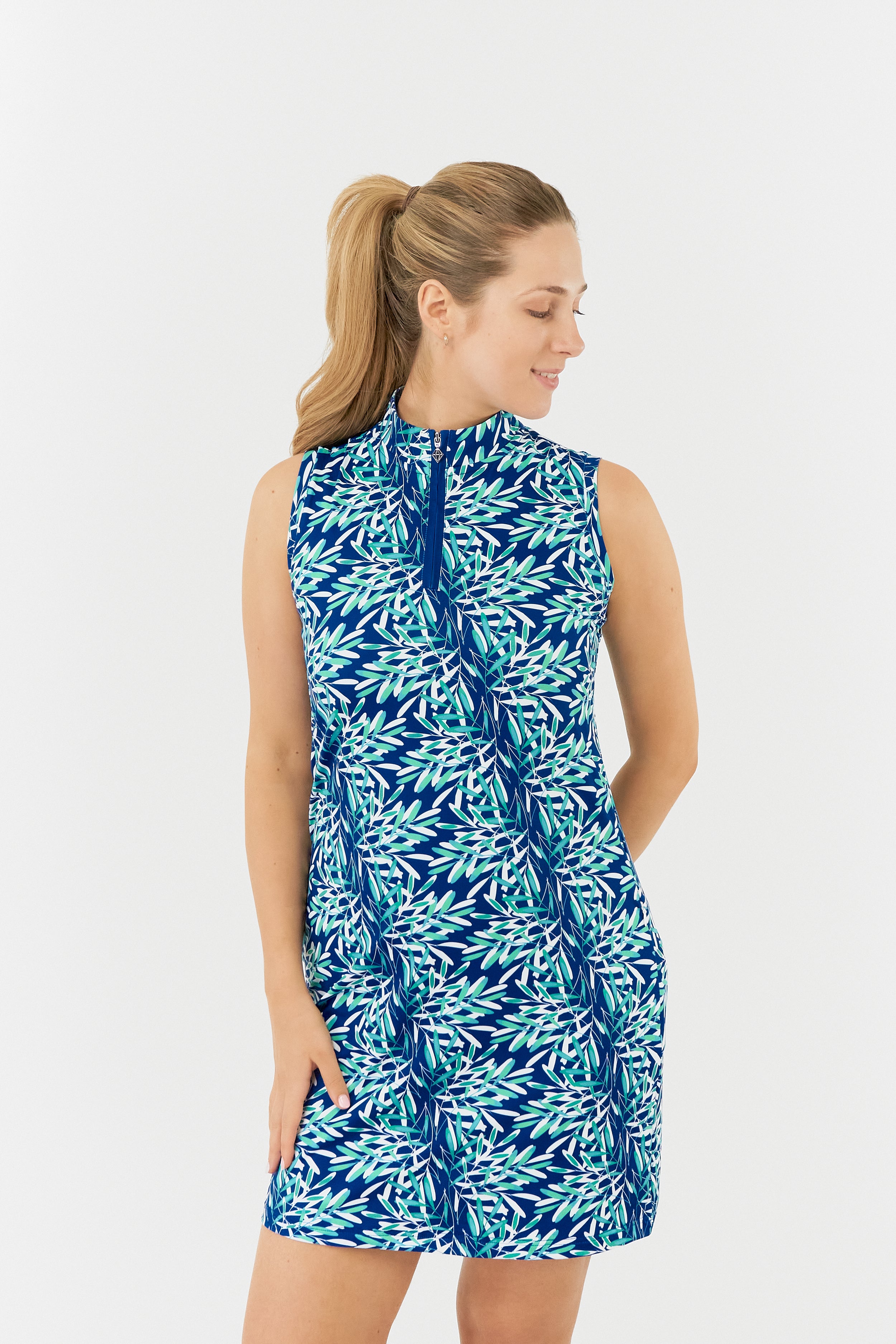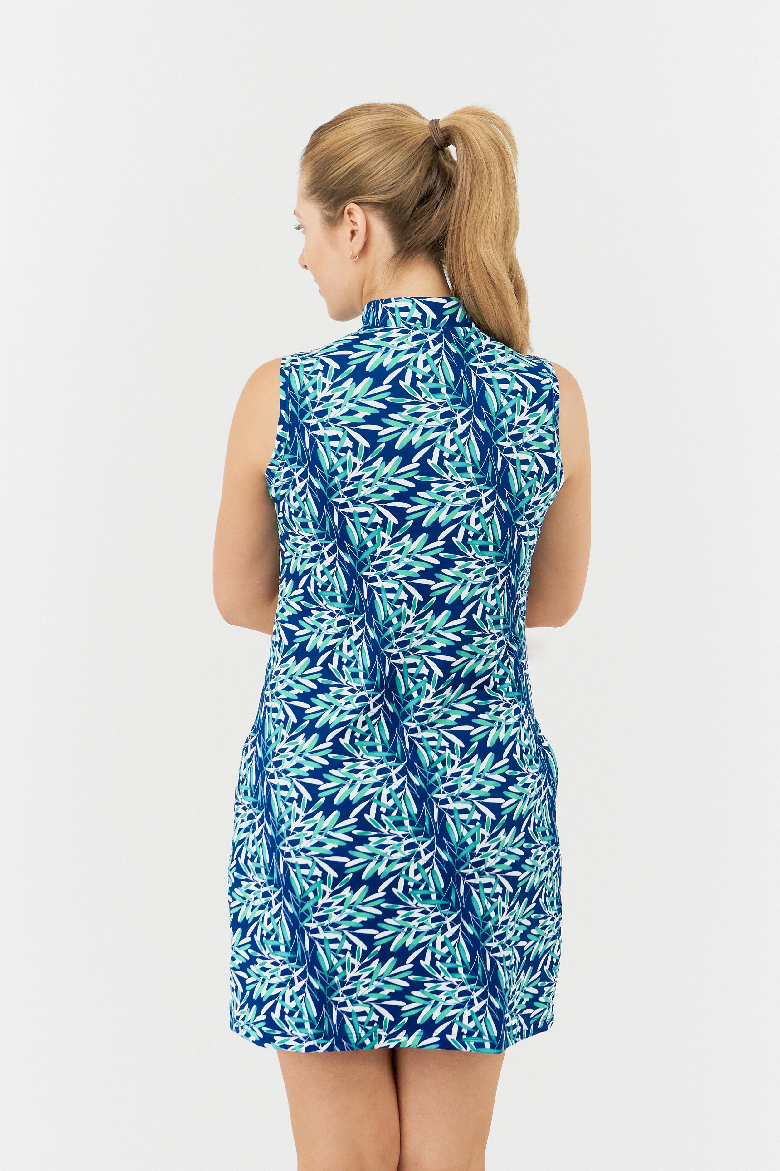 Discover Pure Golf's Miley Sleeveless Ladies Golf Dress in Floating Palms, a truly sophisticated and exclusive addition to your golf collection. This remarkable dress boasts a striking print of summary aquatic of multi-blue and ocean tones with a print of floating palms. and a host of performance-enhancing elements, ensuring you are at the forefront of both fashion and gameplay on the course. Trust us, this is a must-have for any stylish golfer.