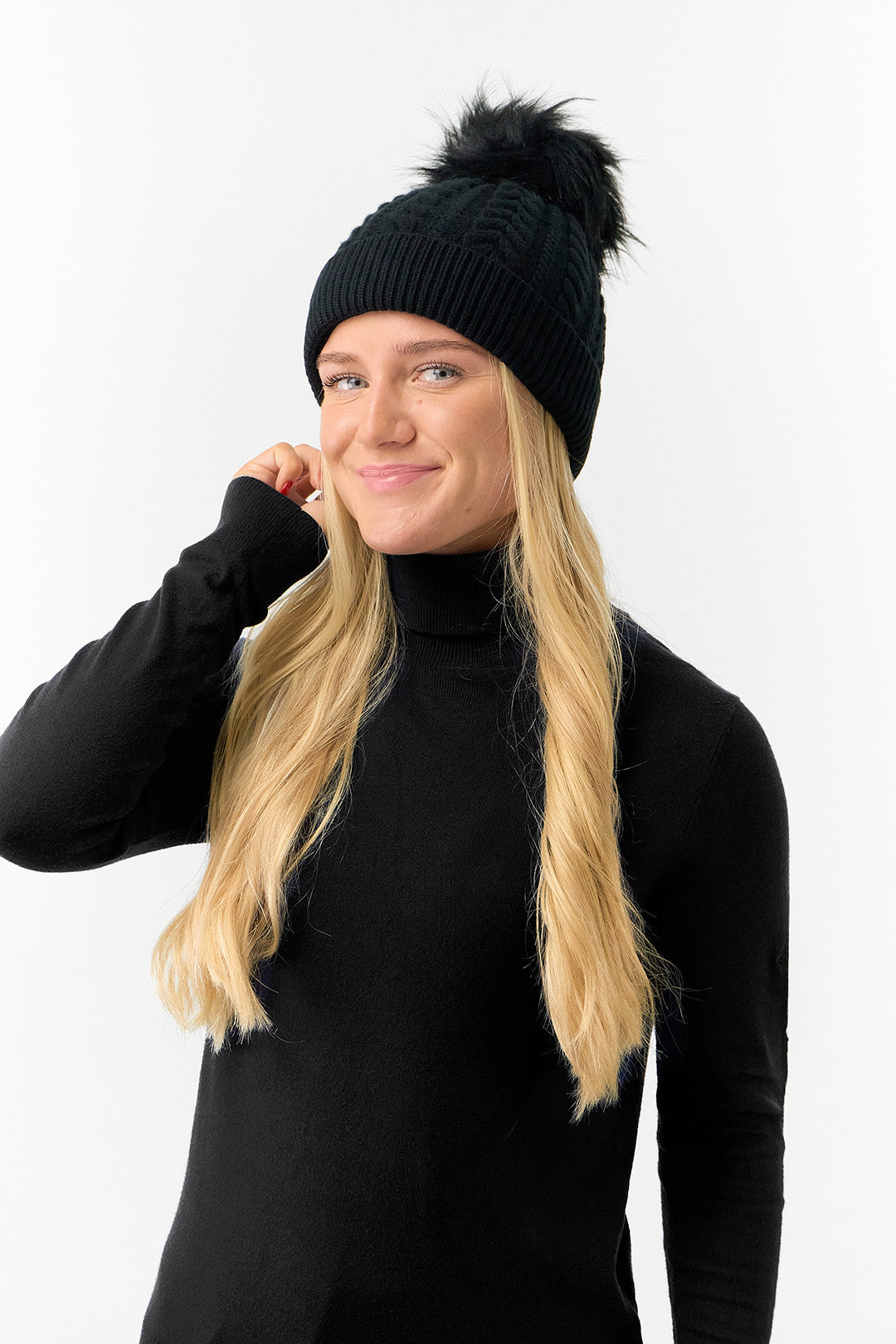 The Surprizeshop waterproof bobble ladies golf hat is perfect for staying dry this Autumn/Winter. In an attractive cable knit design. This hat has three layers - an inner waterproof layer plus a soft fleece lining which makes it warm and comfortable to wear and the knit as the outer layer. Detachable faux fur bobble. Add even more flair with our matching waterproof snood and headband.