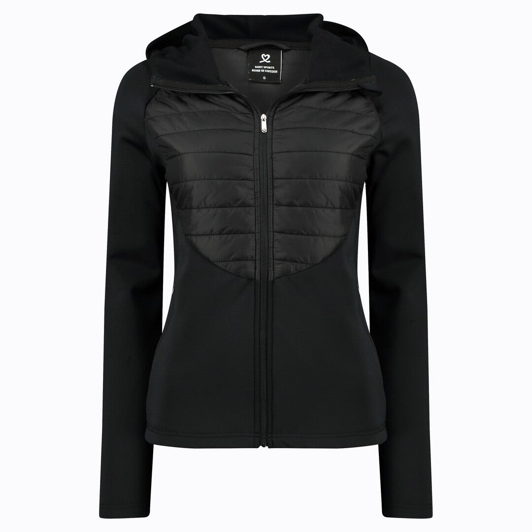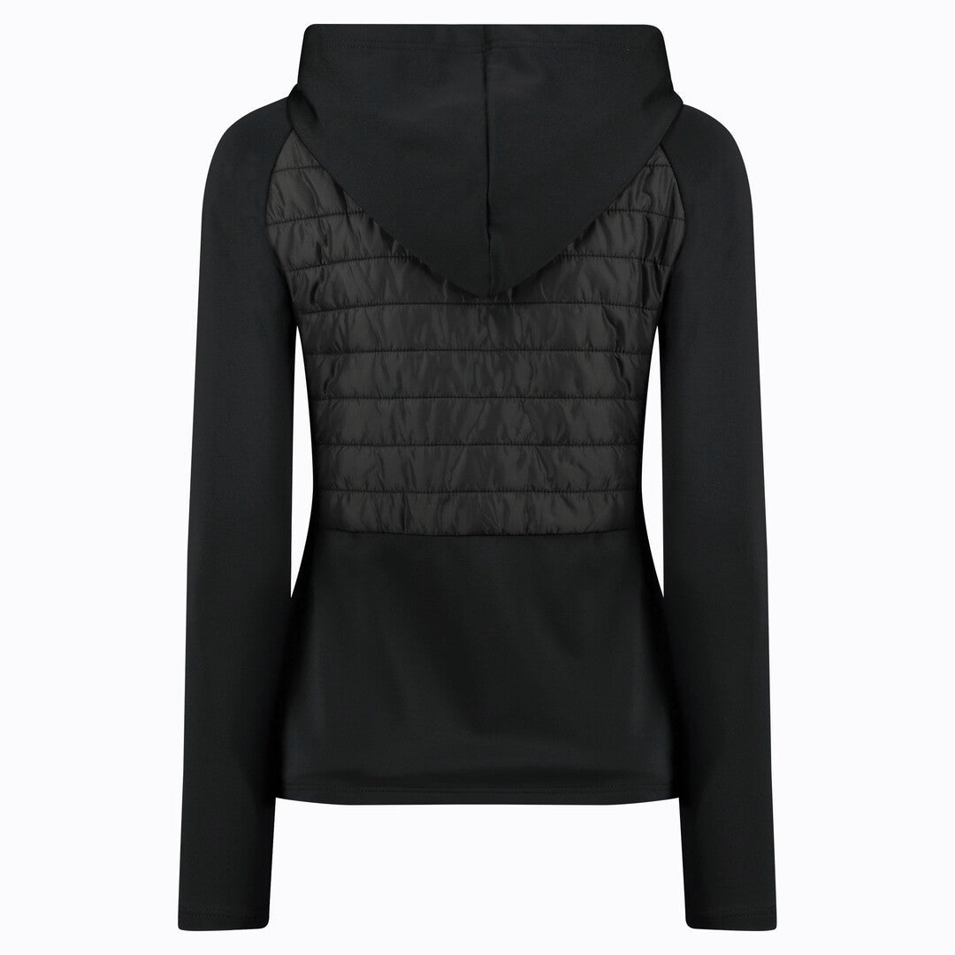 The Daily Sports Allos Hybrid Padded Jacket in Black is designed for both style and functionality. This jacket features a regular fit and is made from a stretch power fleece jersey, providing comfort and flexibility during activities. It incorporates wind-quilted fabric on the chest and back for added protection against the elements.