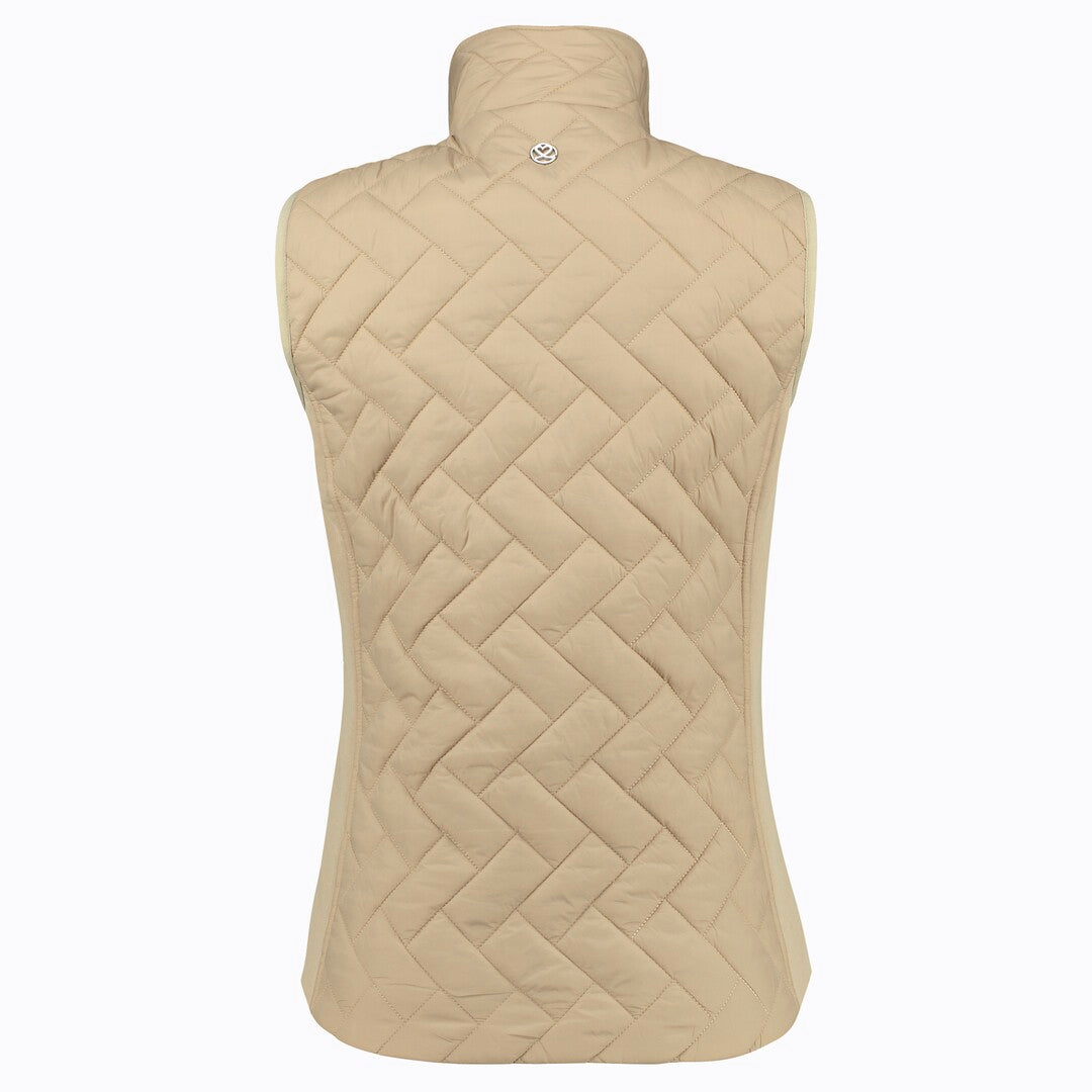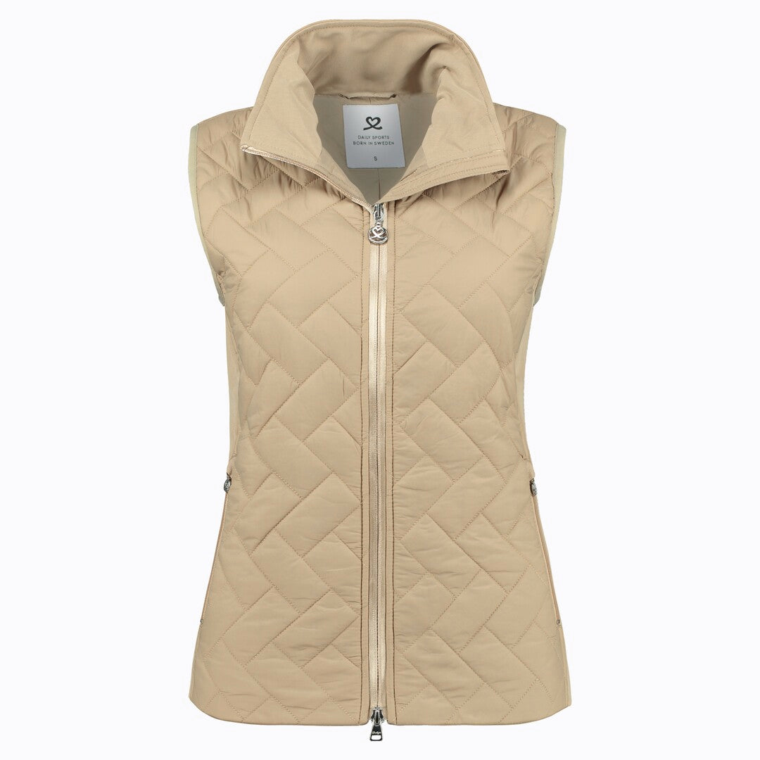 The Daily Sports Bonnie Padded Vest in fudge combines warmth with a stylish, lightweight design. This vest is filled with synthetic down and has block-pattern quilting, which makes it both cozy and visually appealing. Made from a wind- and water-repellent fabric, it is breathable and free from fluorocarbons, adding an environmentally friendly touch. Key features include a stand-up collar, stretch side panels for flexibility, a two-way zipper, and two zippered pockets for storing essentials. Crafted with a regular fit, the outer layer is 100% polyamide, while the lining is 100% polyester