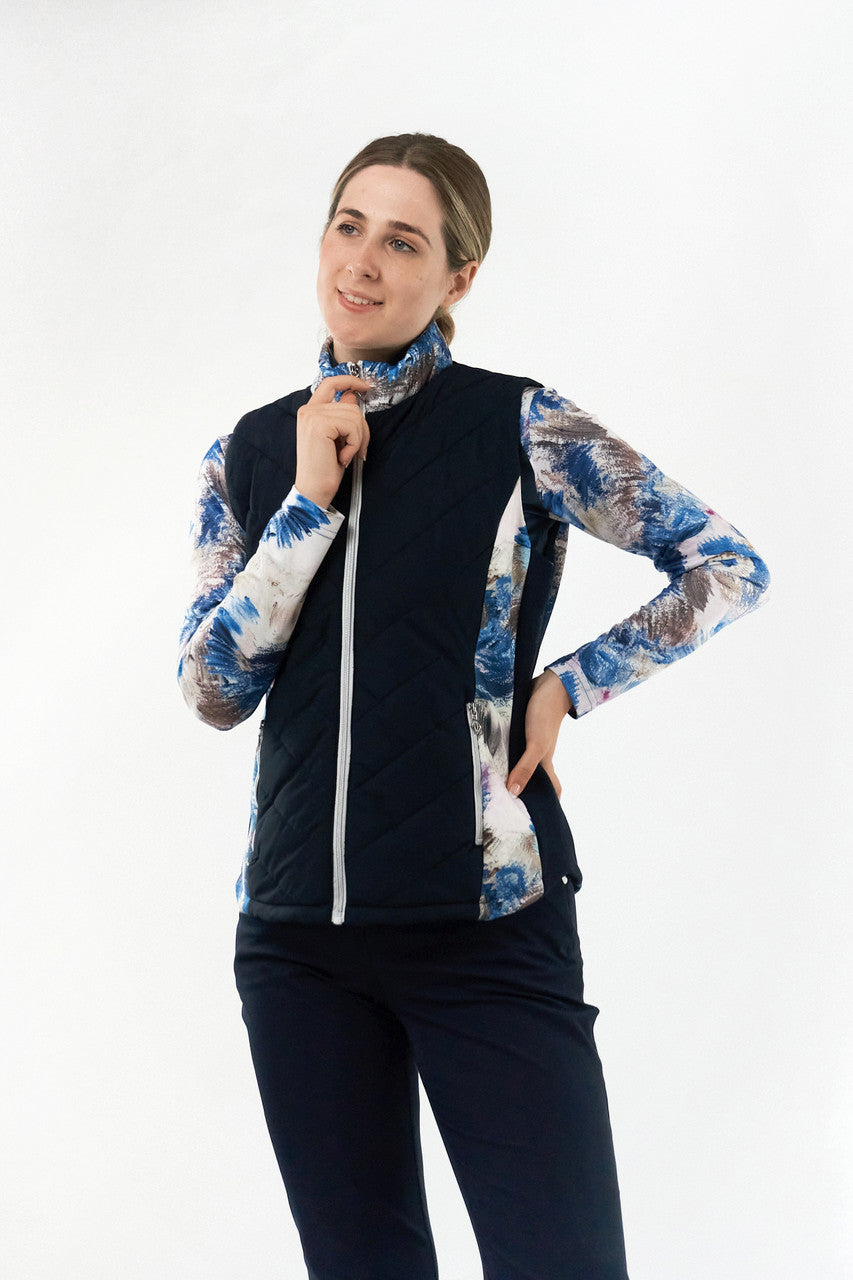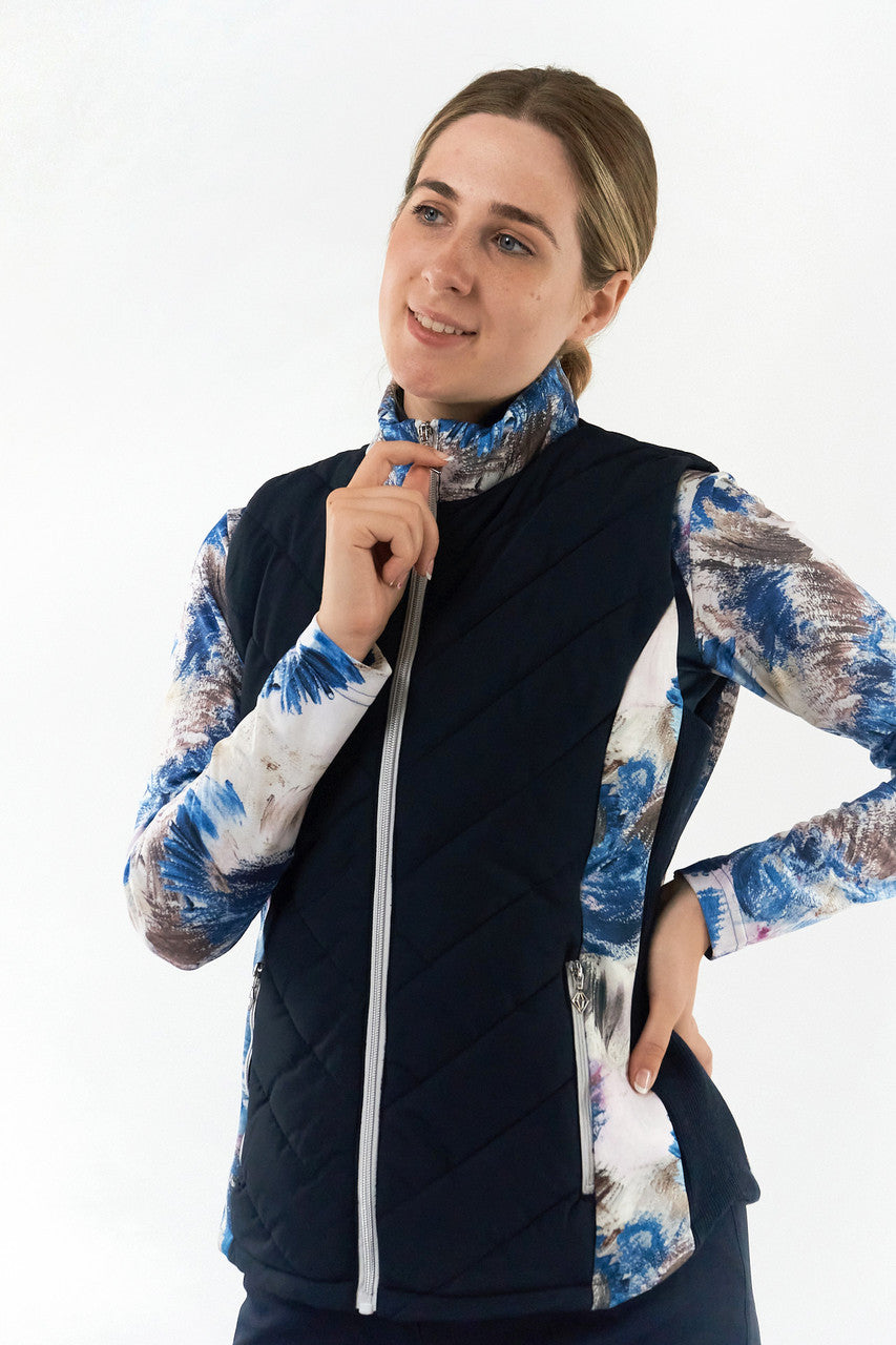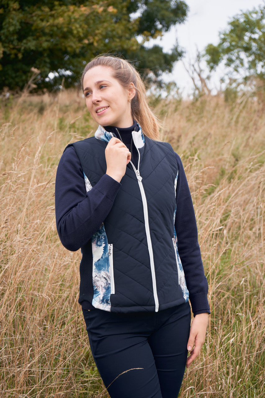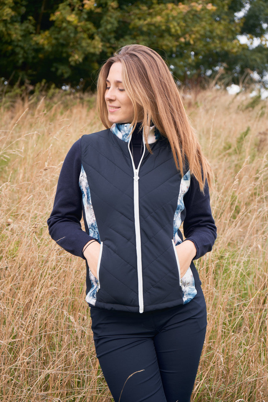 The Amber quilted womens golf gilet is the perfct marriage of style and function. The quilted fabric and high neck gives an added layer of warmth and layering and due to its diagnol stitch is flattering to wear. The printed neck and side panels add personality to this piece to and stylish detailing. It pairs perfectly with other garments in the stone canvas collection to create a fully co-ordinated look. The patterned internal pockets complete this stylish detailing. The navy blue is main body panles enables it to be paired with navy bottoms.
