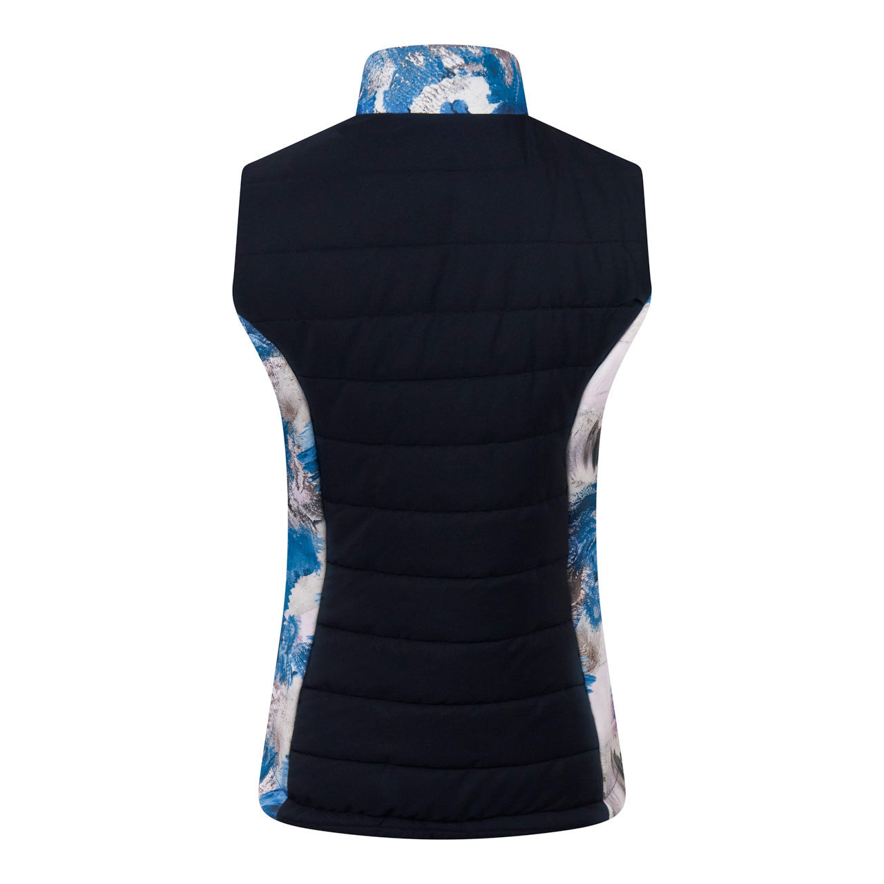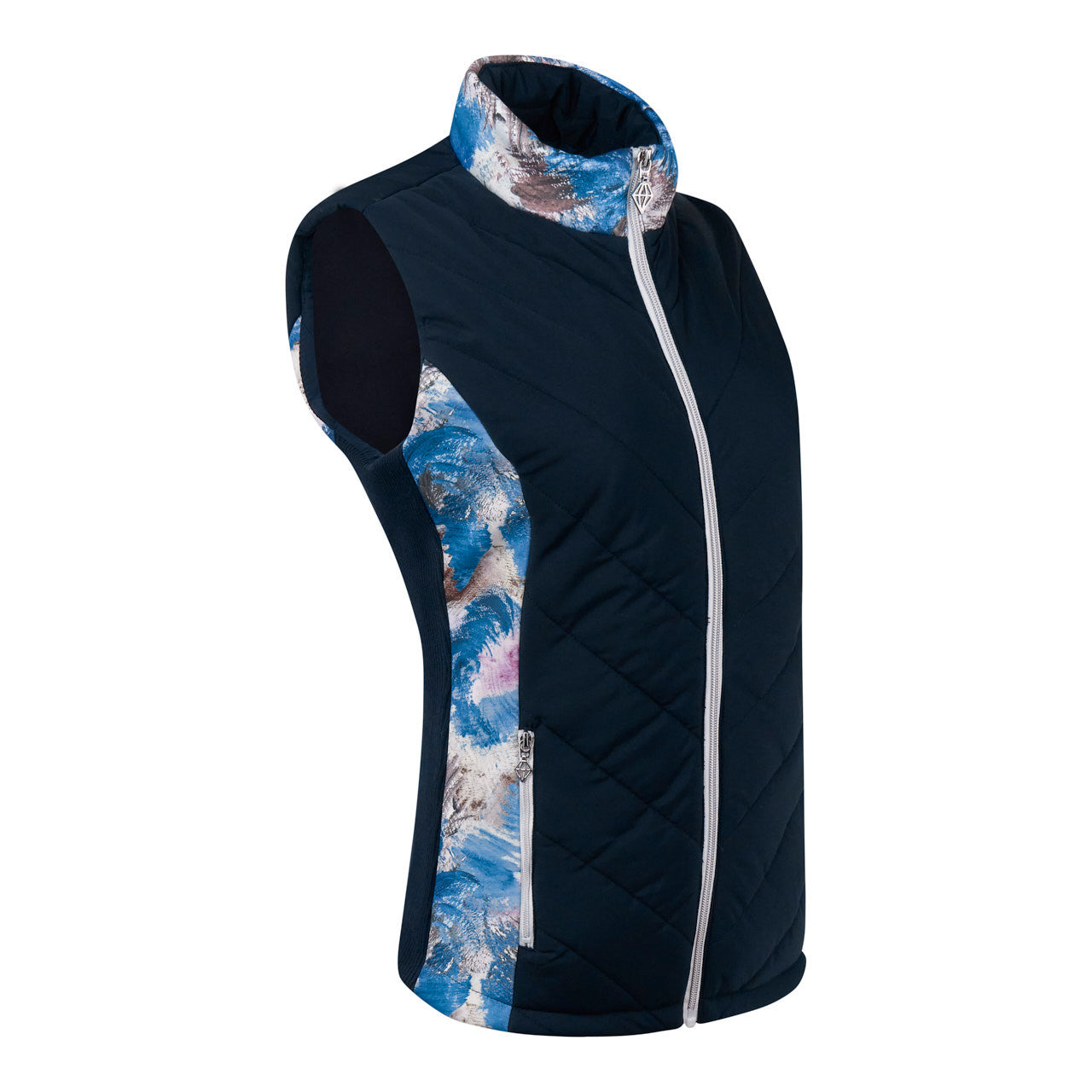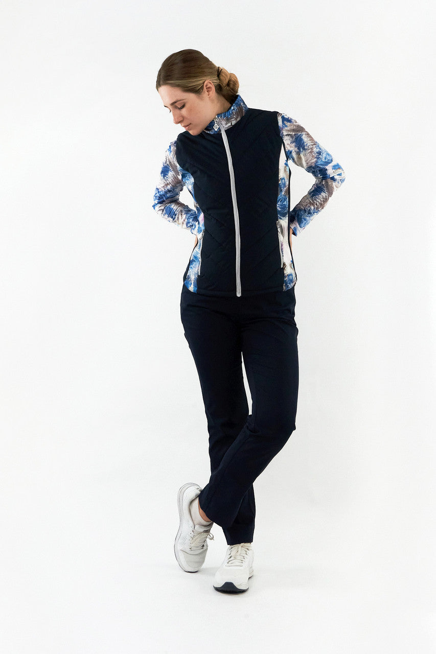 The Amber quilted womens golf gilet is the perfct marriage of style and function. The quilted fabric and high neck gives an added layer of warmth and layering and due to its diagnol stitch is flattering to wear. The printed neck and side panels add personality to this piece to and stylish detailing. It pairs perfectly with other garments in the stone canvas collection to create a fully co-ordinated look. The patterned internal pockets complete this stylish detailing. The navy blue is main body panles enables it to be paired with navy bottoms.