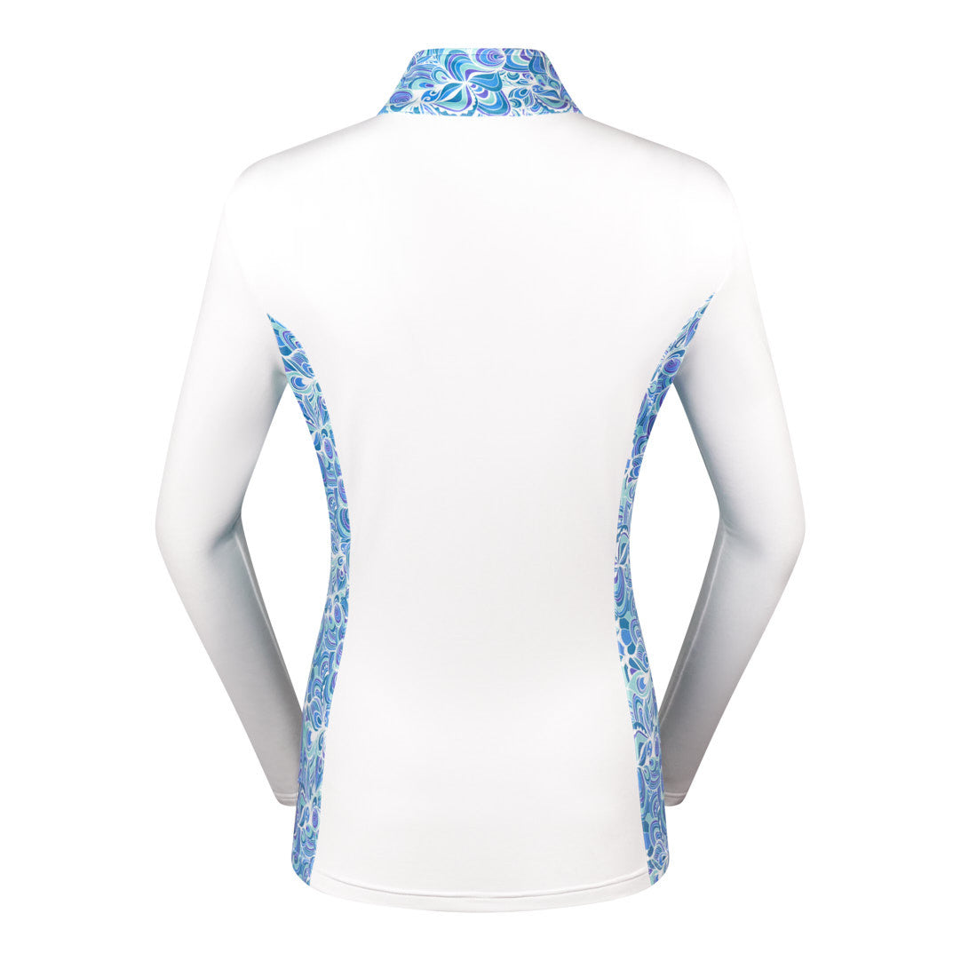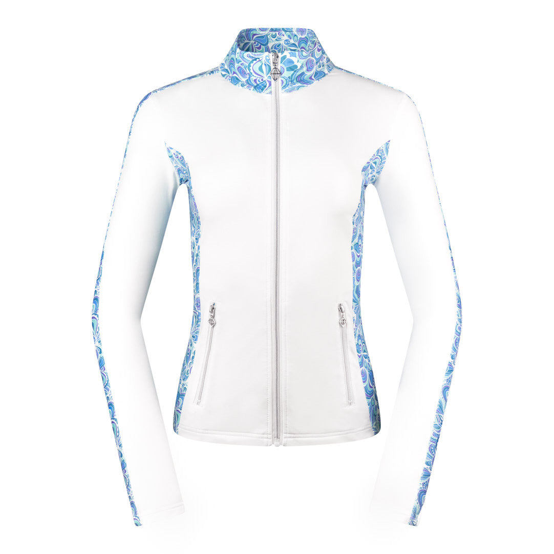 Breeze is a Summerweight mid-layer jacket for those milder Spring days and Summer mornings. The body is a feminine pale blue tone, and the sides and arms are finished with delicate printed panels. The Full-length zip makes it easy to take on and off and the stretch fabric is easy to swing in so you are not restricted while playing.  Co-ordinates well with white and a variety of blue Essentials for a look with longevity!