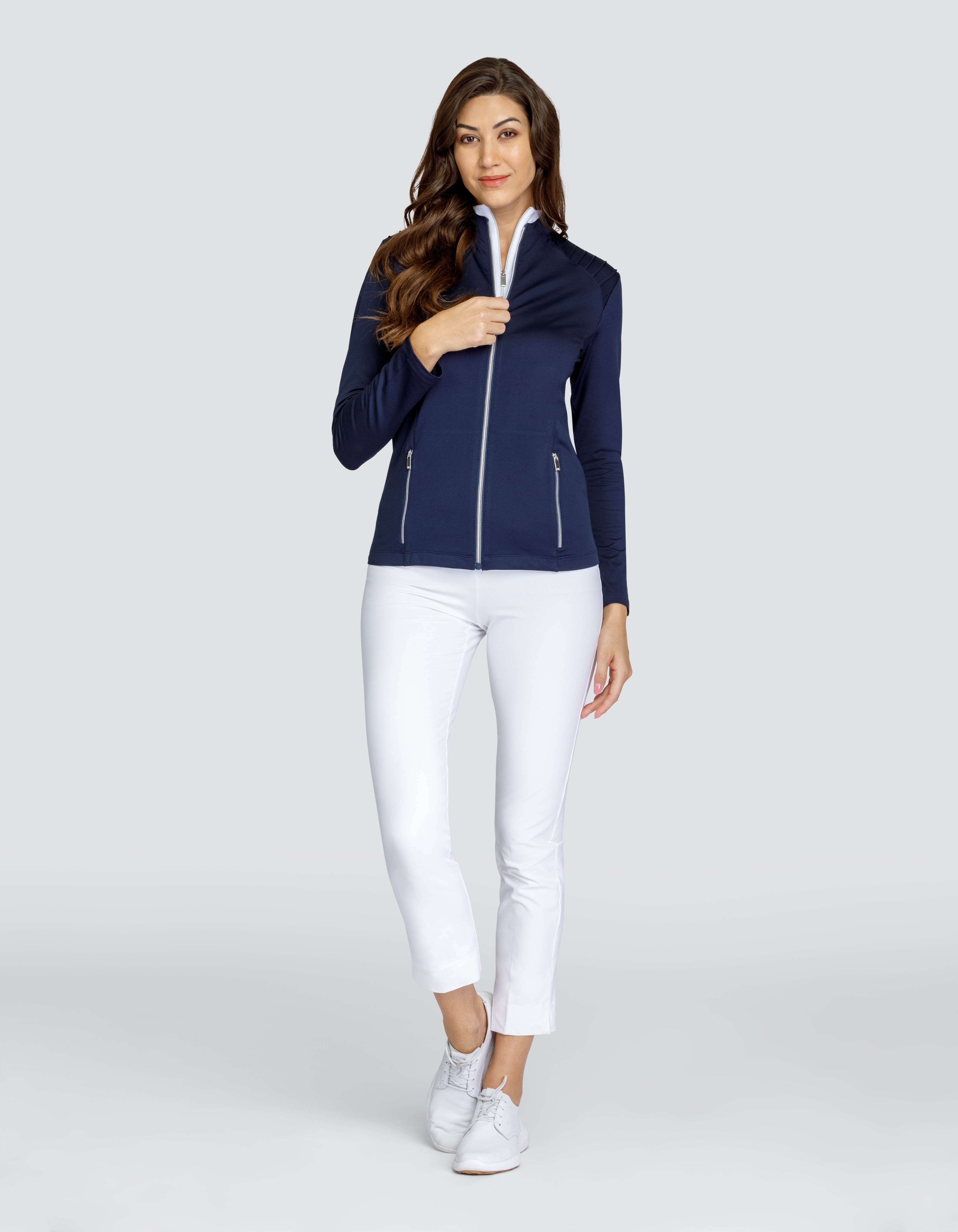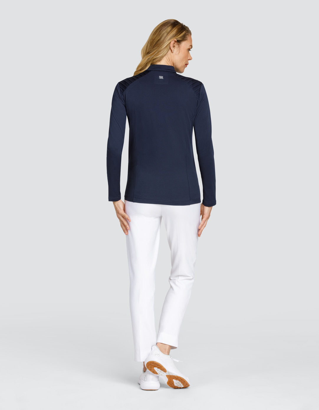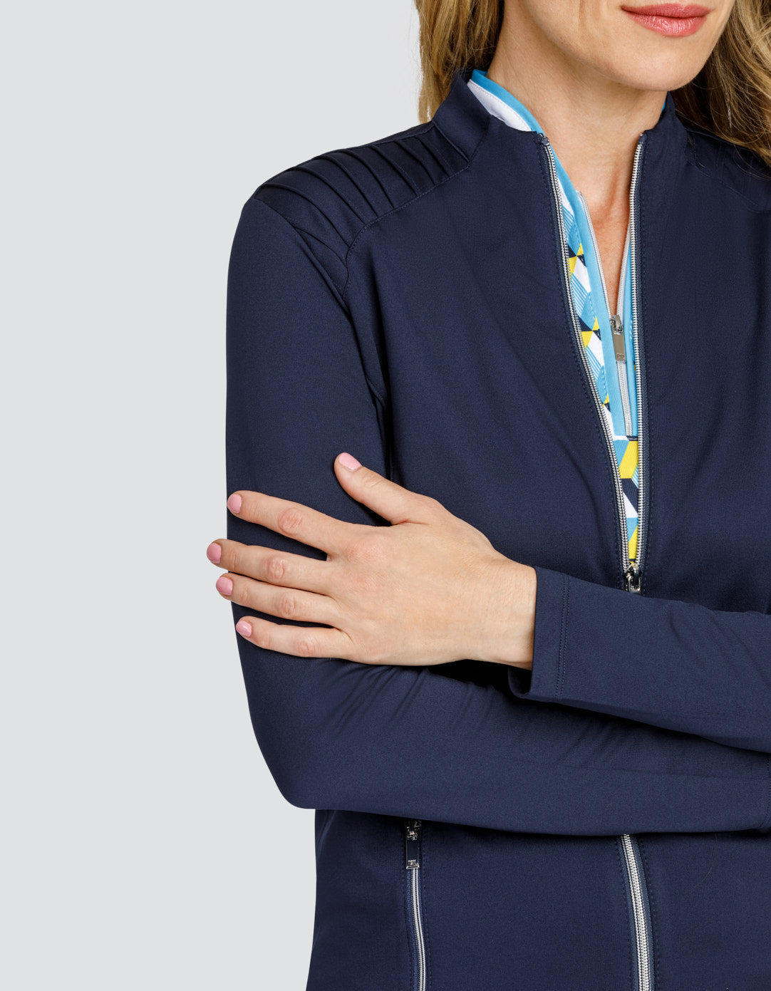 Enhance your golf wardrobe with the stylish and versatile Tail Women's Golf Jacket. This long sleeve jacket, featuring a sophisticated funnel neck and pintuck inserts, offers both warmth and elegance. Crafted from plush jersey fabric, a blend of 87% Polyester and 13% Spandex, it provides superior comfort and flexibility, allowing for a full range of motion during your game.