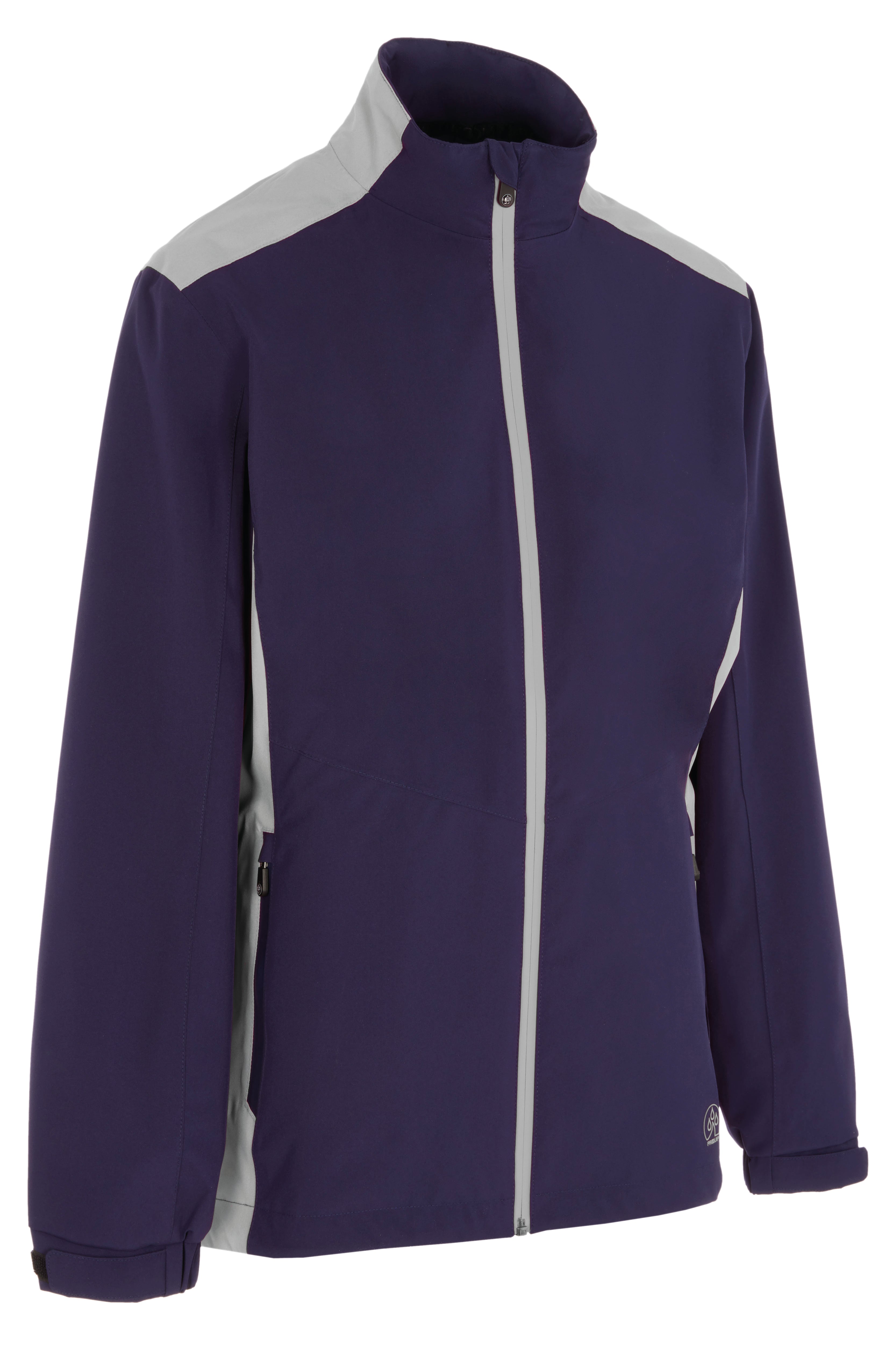 The jacket features a stretch outer fabric for optimal freedom of movement, while the noise-limiting 'Swing-Silent Technology' ensures you can focus on your game. A stylish pop of lilac contrast against the classic navy and silver design adds a vibrant touch to your golf wardrobe. It’s also easy to adjust for a tailored fit, thanks to the side adjustor tabs and shockcord drawstring at the waist.