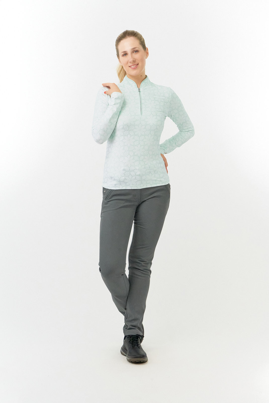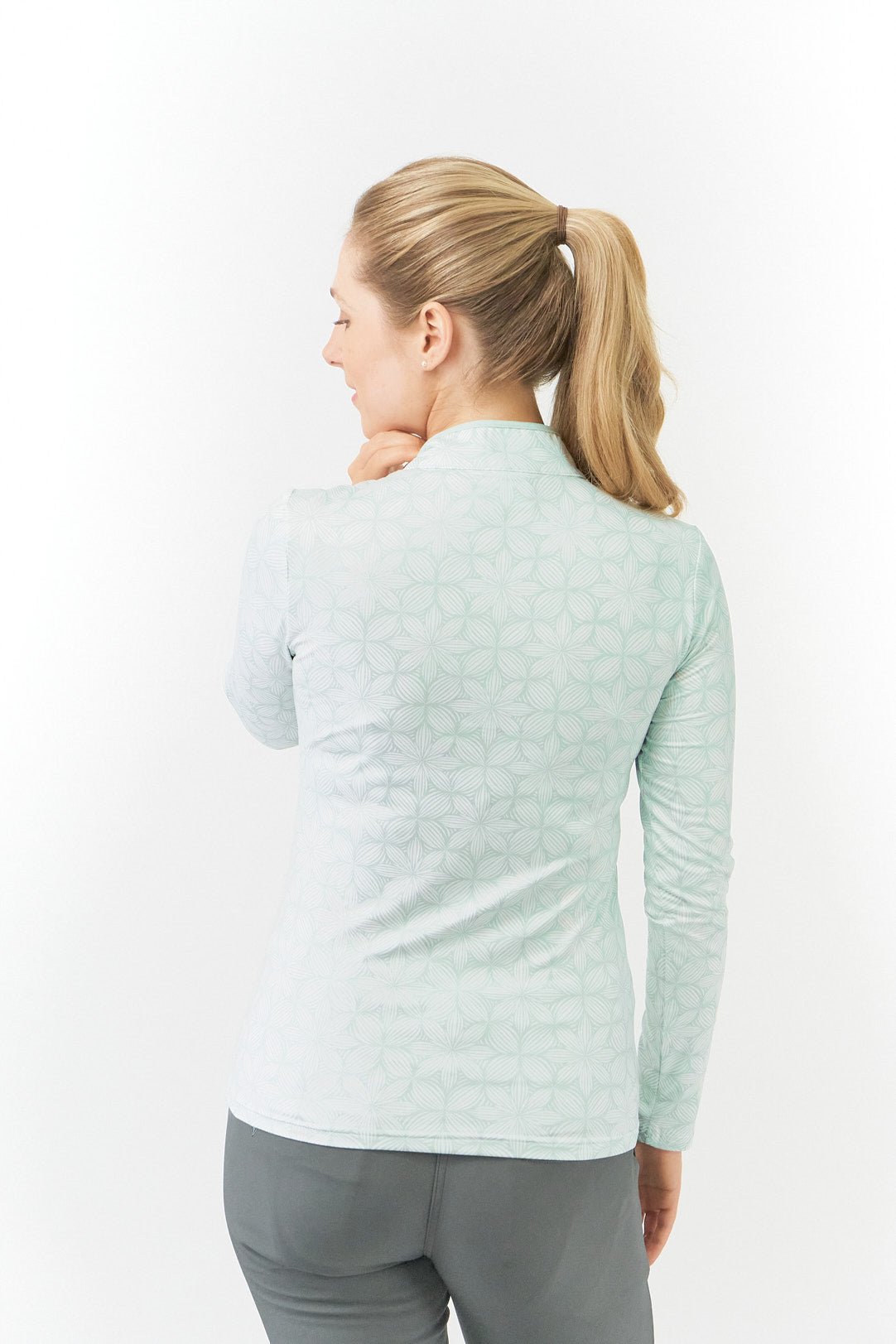 Ashlea by Pure Golf is a long-sleeved golf top made from brushed, winterweight fabric. The "Frosted Field" print is of frost-kissed leaves arranged in a harmonious geometric design. Ashlea has a mandarin collar adding extra protection from the elements and a quarter zip with a diamond logo zipper puller.