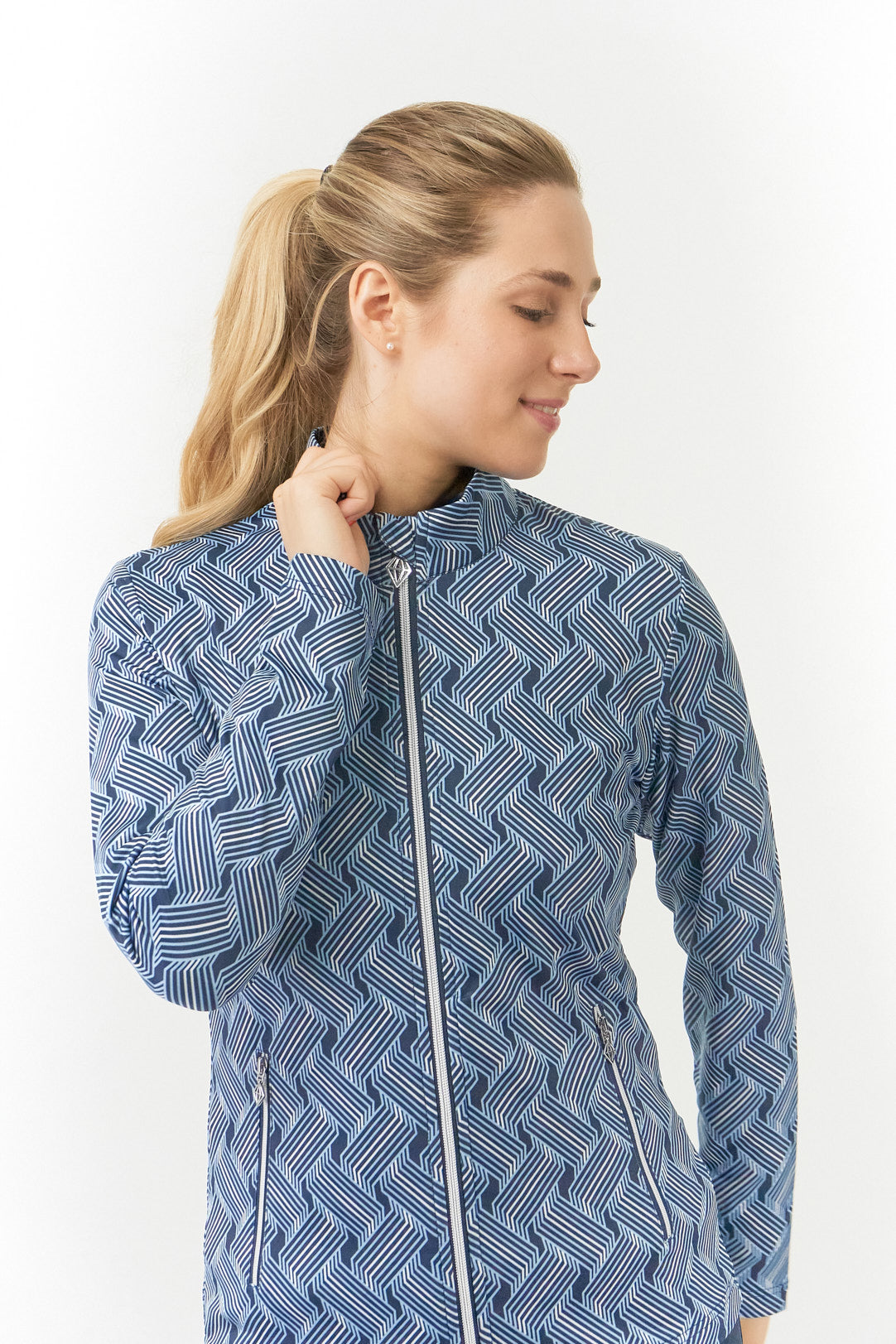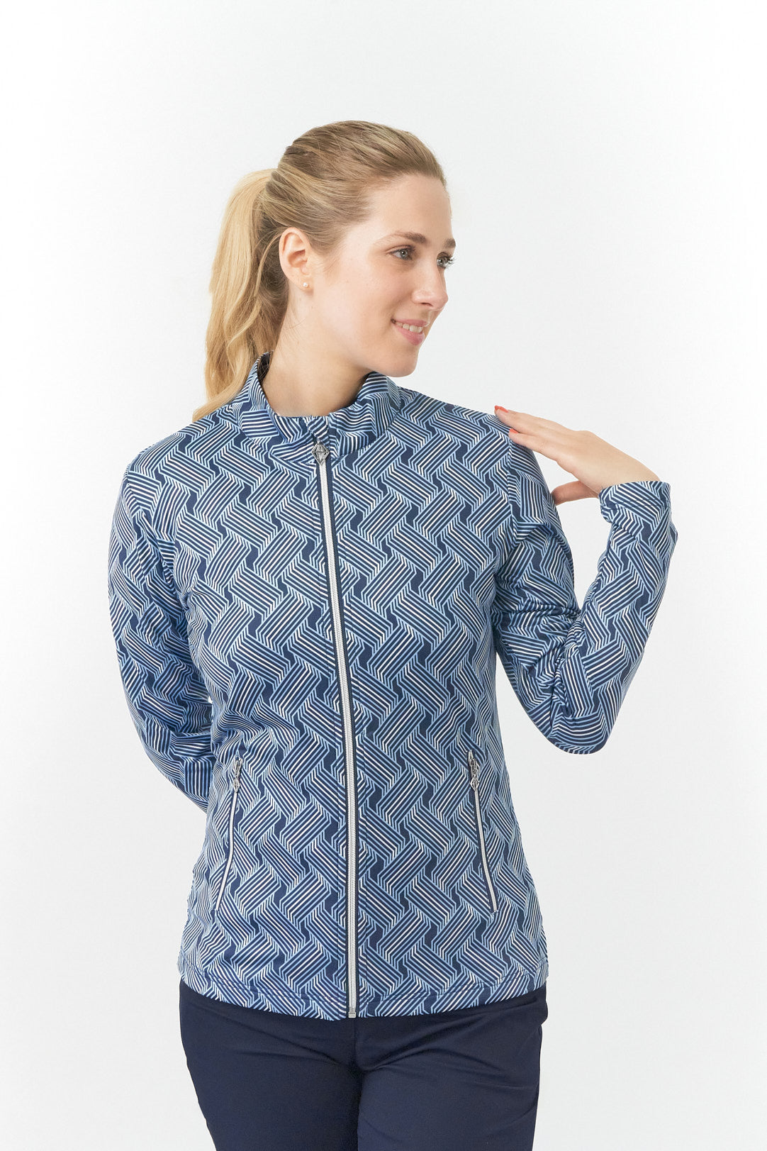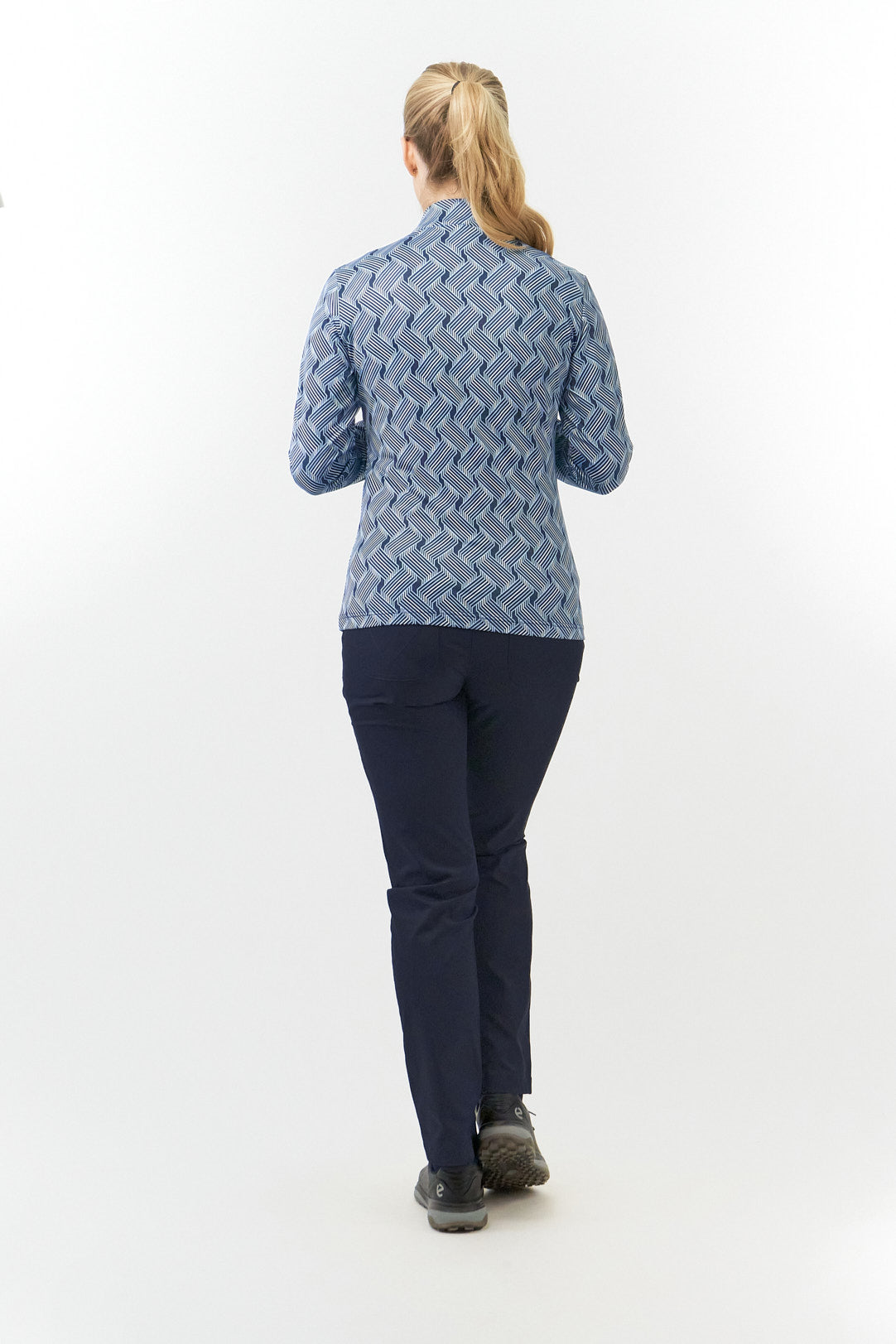 The "Optical Weave" print features an engaging geometric pattern of interwoven lines in shades of blue and white, creating a mesmerizing optical illusion. This bold, dynamic design stands out against a navy background, bringing a modern and energetic flair to ladies' golf apparel. Perfect for those who seek to combine contemporary style with visual intrigue on the course.
