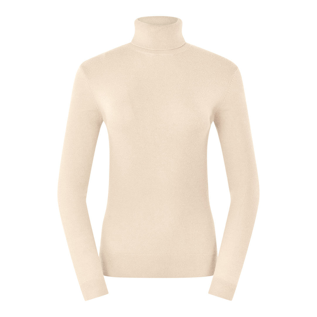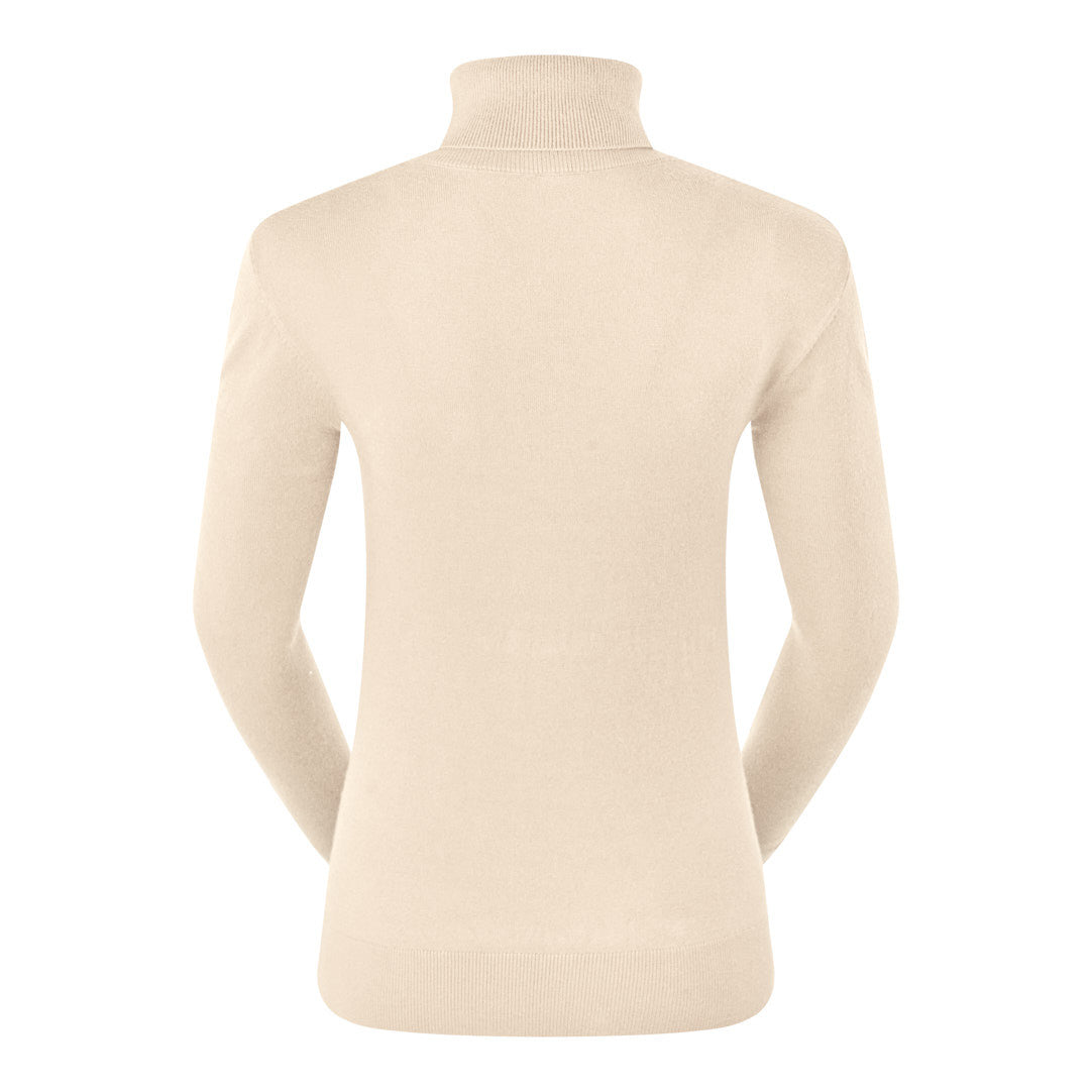 Simone is a super soft women's golf roll neck jumper that will look just as elegant on as off the course. The beautifully soft yarn will keep you warm whilst the ribbed cuff and hem provide extra insulation. The rolled neckline gives you much-needed extra warmth and protection from the weather. This is the perfect staple layering piece to adjust to on-course temperature changes. In stunning champagne. Other coordinating items available.