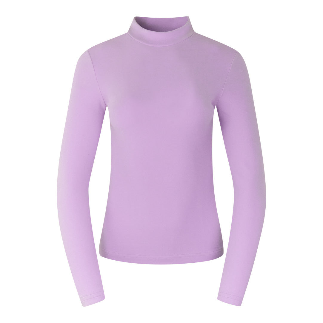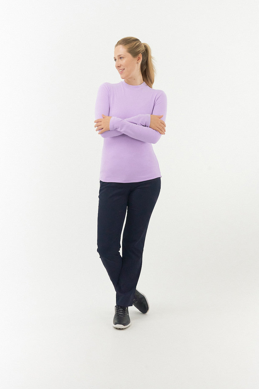 Fern may be our softest golf top yet. Fern is our brand new super soft base layer top with a mock neck collar. Ever wanted to experience the comfort of Pyjamas on the golf course? Now you can while still looking presentable. Fern is perfect for wearing as a base underneath a polo shirt to keep the cool winds off or simply wear as a top with a jacket or gilet layered on top. Try it to believe it! The lilac colourway is ideal to style with the Lavender Flurry fashion collection.