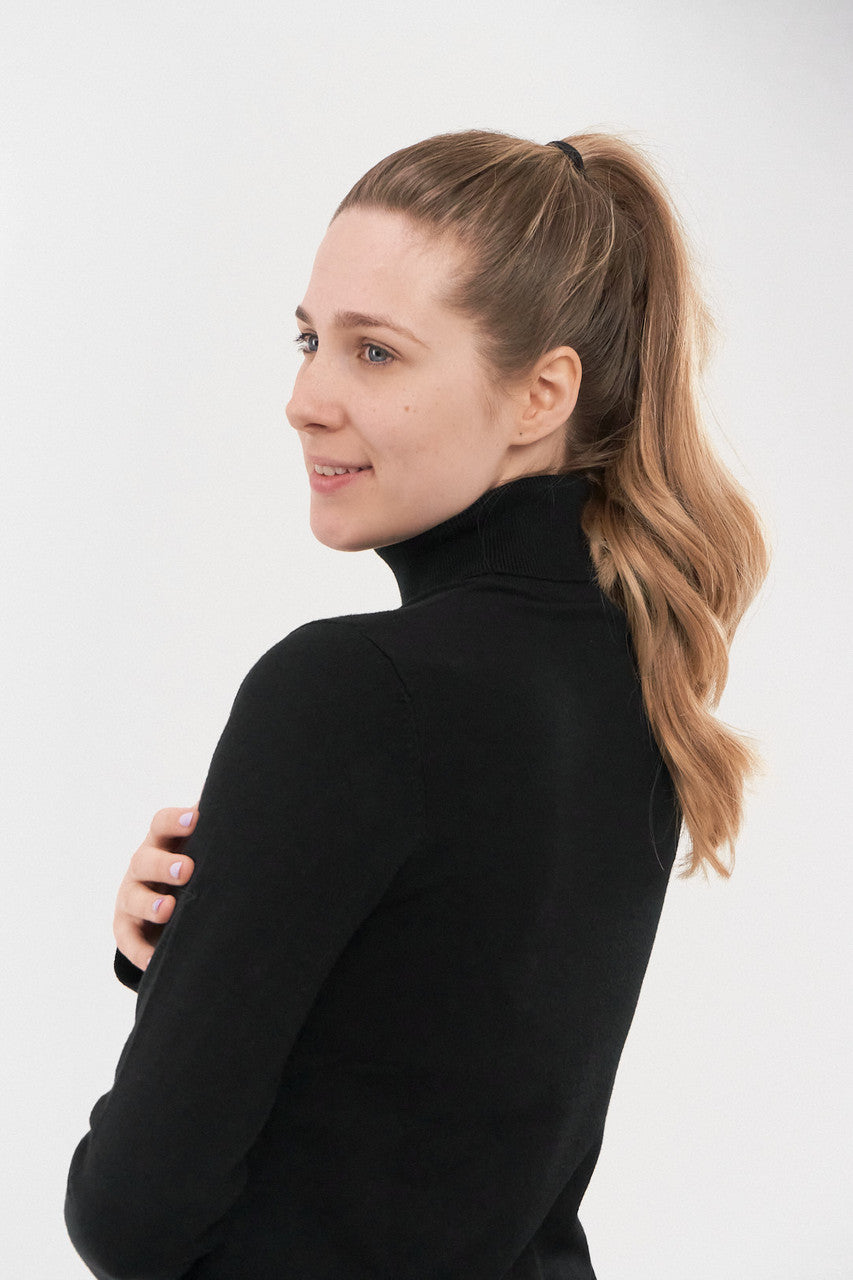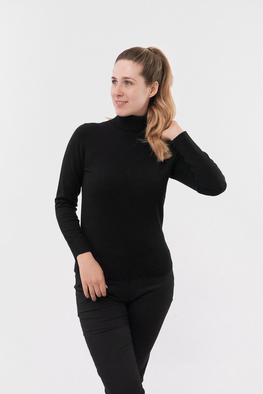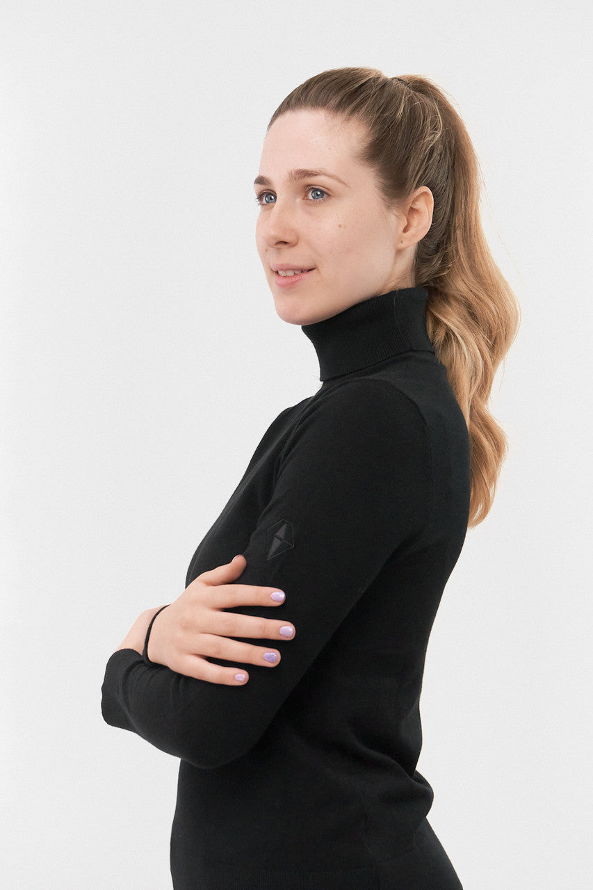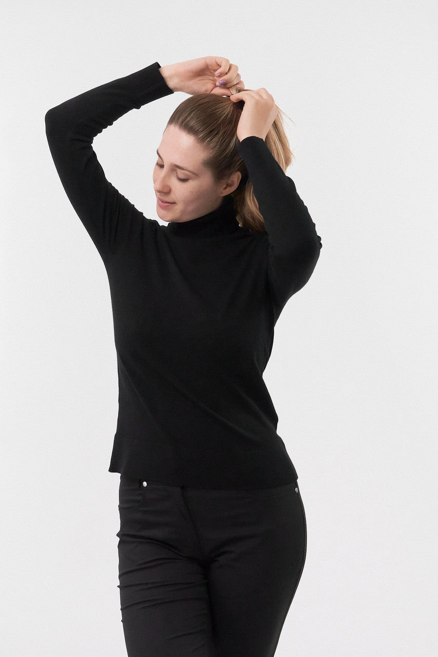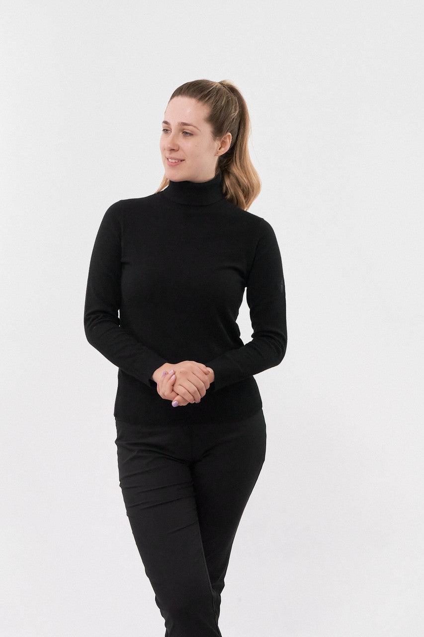 Glow is a super soft roll-neck ladies golf jumper, that will look just as elegant on as off the course. The beautifully soft yarn will keep you warm whilst the ribbed cuff and hem provide extra insulation. The rolled neckline gives you much needed extra warmth and protection from the elements. This is the perfect layering piece to adjust to on course temperature changes. With subtle tonal logo on the arm. A classic staple for this season.
