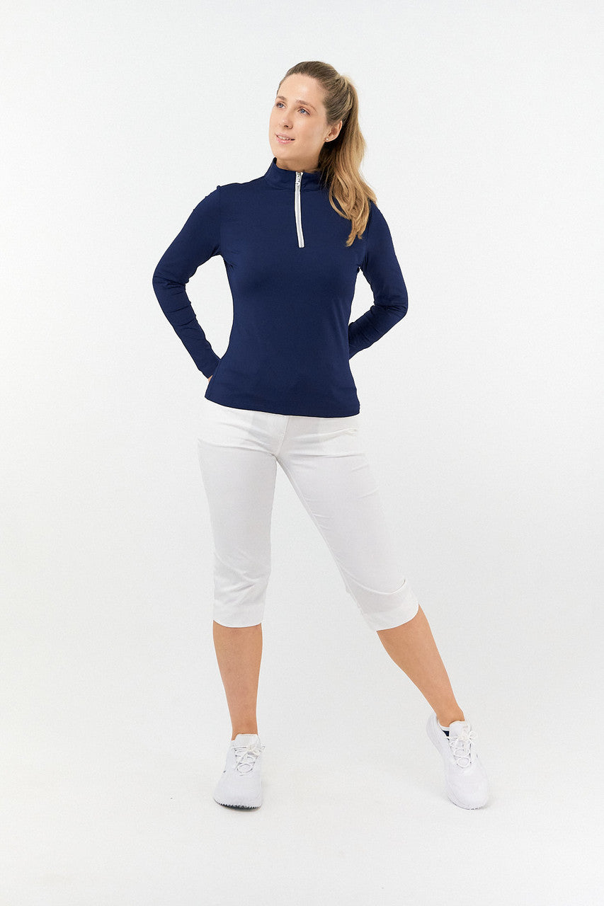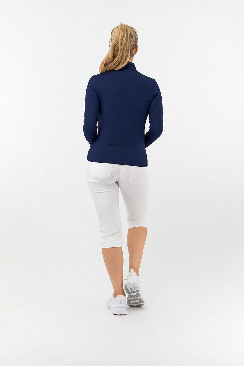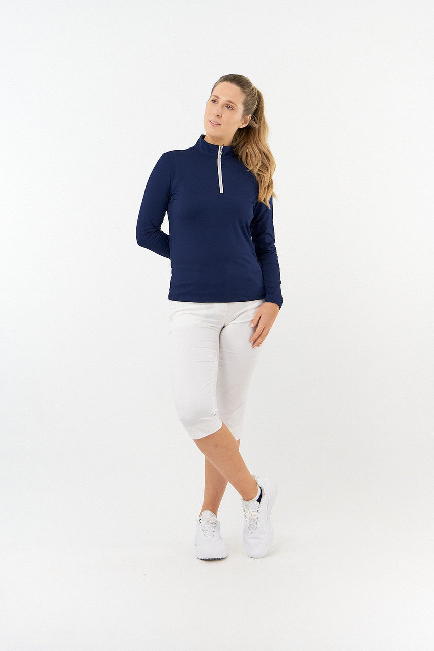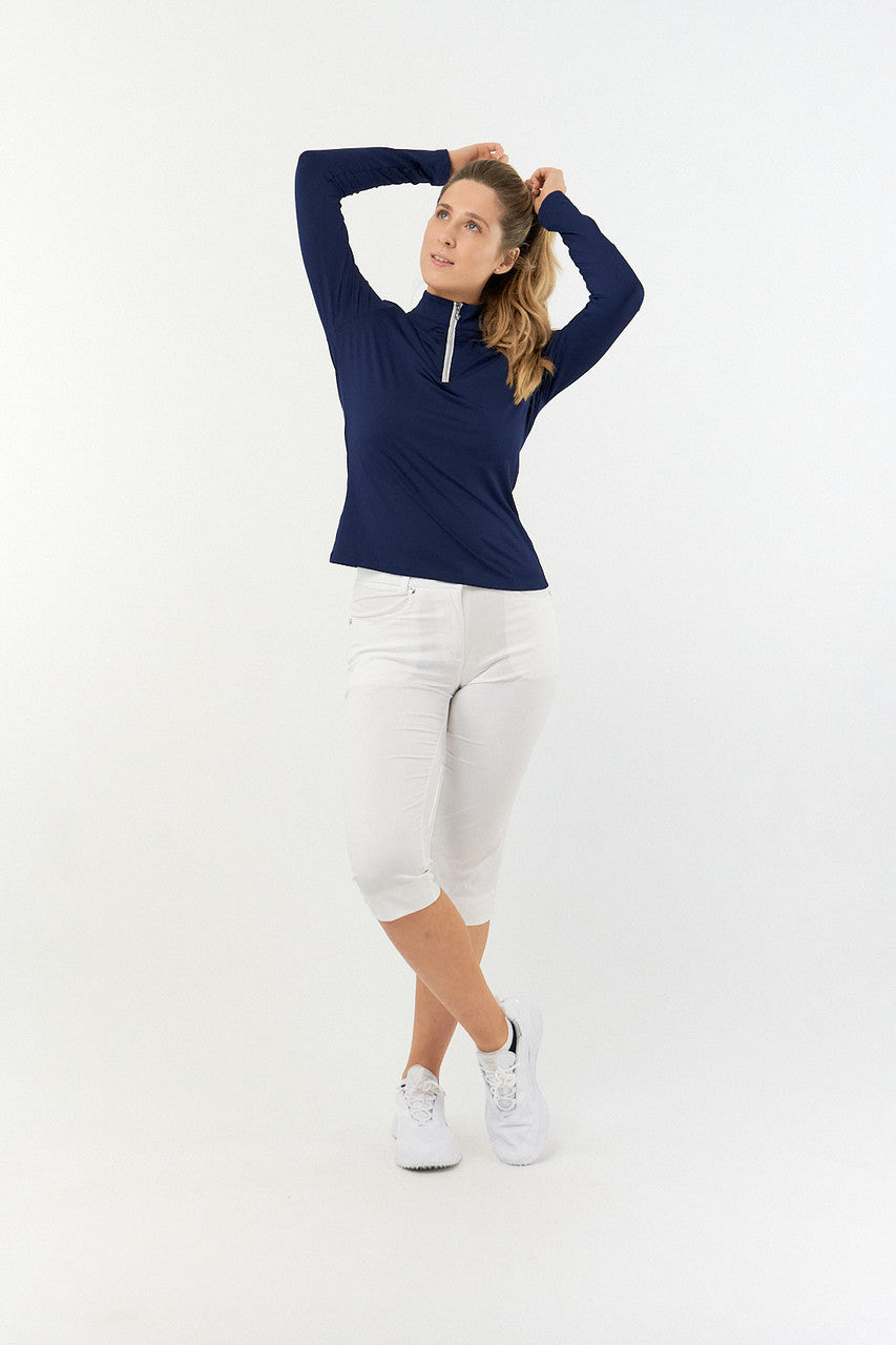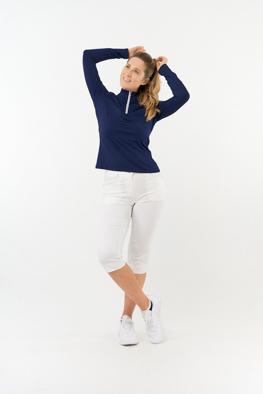 Tranquility is a versatile long sleeved mid/base layer top with a quarter zip in Essential White, Navy and Ocean Blue. Made from our signature anti static, anti-crease, 4 way stretch & quick drying fabric with built in UVA+UVB sun protection to keep harmful rays away. Can be worn as a base layer by those looking for extra coverage or thrown on as a mid-layer on breezy Summer golf days - the choice is entirely yours! Our Tranquility mid-layer co-ordinates perfectly with the entire SS23 Fashion collection and Essentials range.