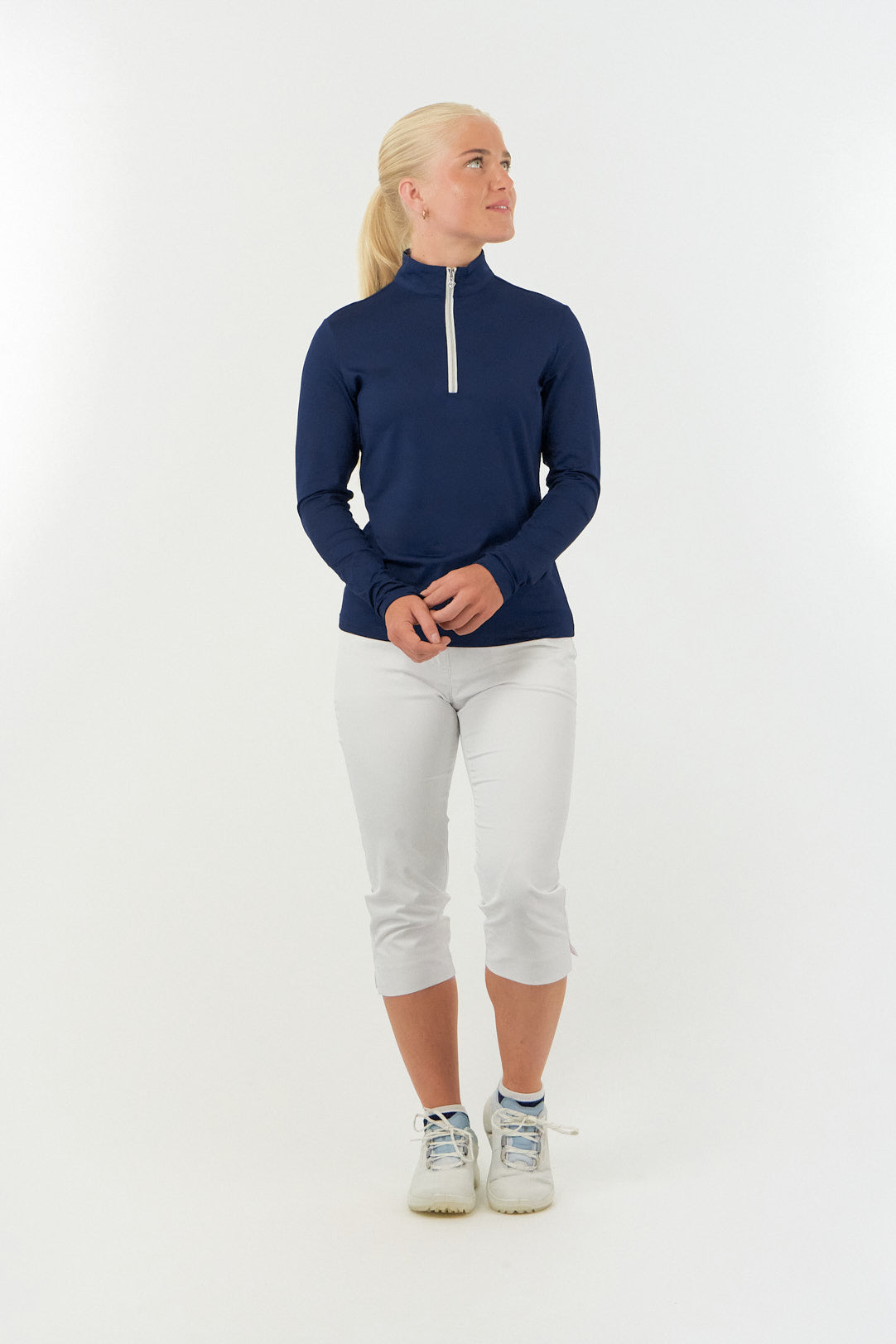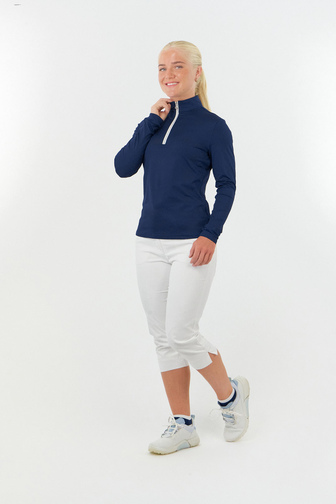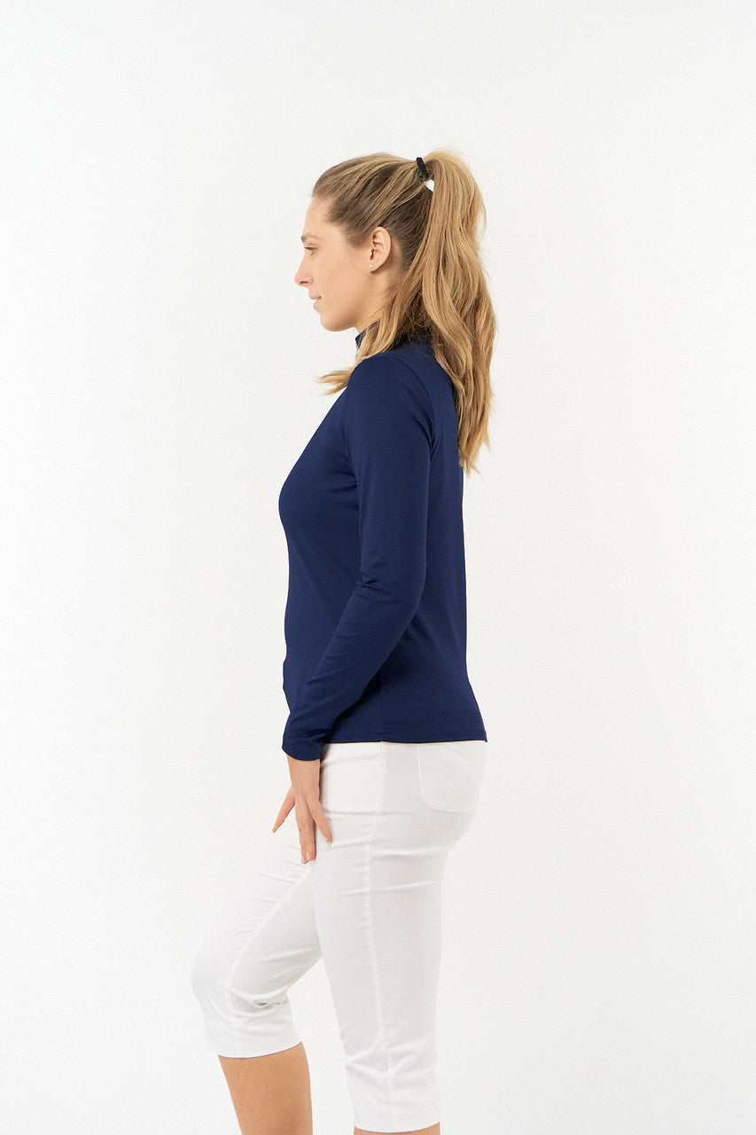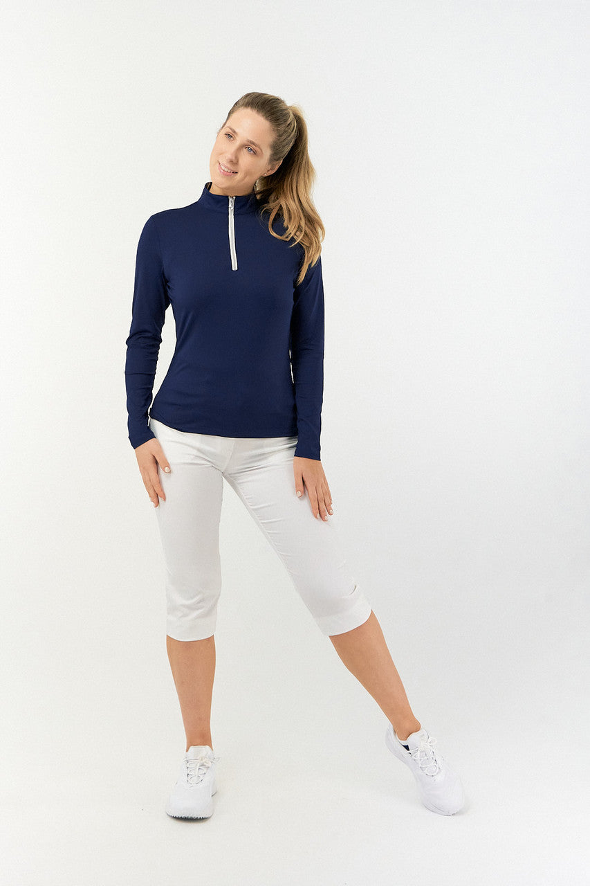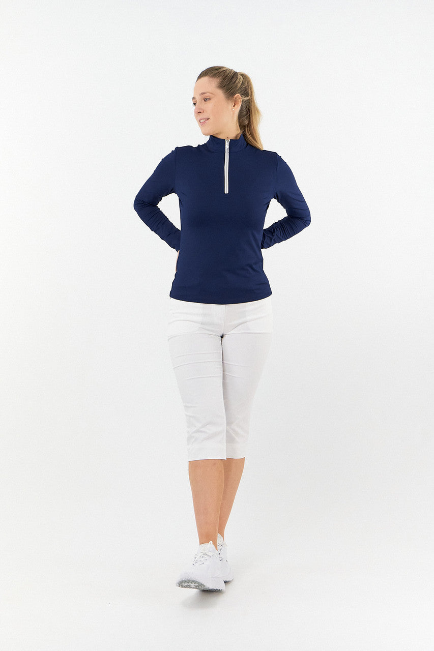 Tranquility is a versatile long sleeved mid/base layer top with a quarter zip in Essential White, Navy and Ocean Blue. Made from our signature anti static, anti-crease, 4 way stretch & quick drying fabric with built in UVA+UVB sun protection to keep harmful rays away. Can be worn as a base layer by those looking for extra coverage or thrown on as a mid-layer on breezy Summer golf days - the choice is entirely yours! Our Tranquility mid-layer co-ordinates perfectly with the entire SS23 Fashion collection and Essentials range.