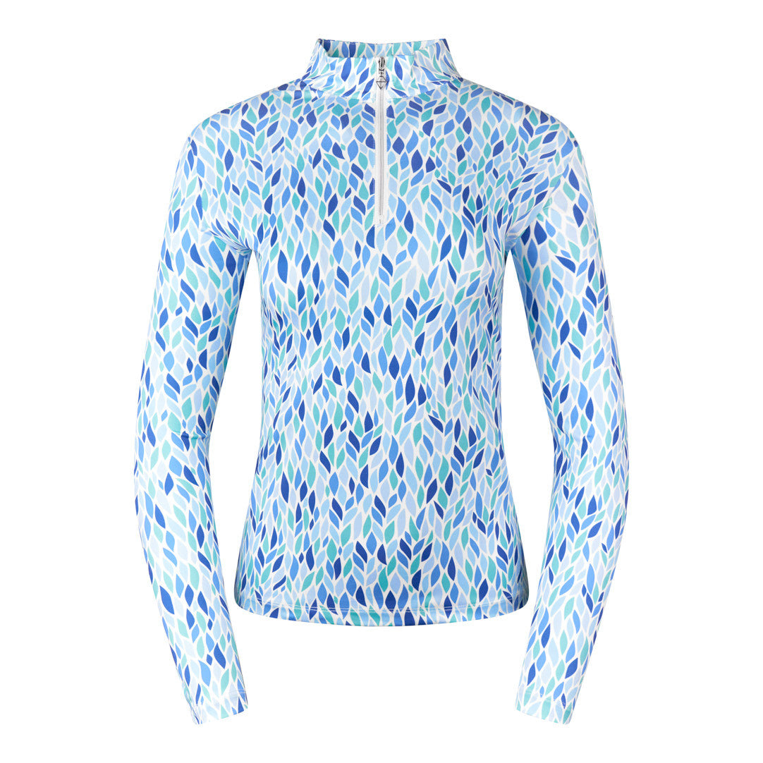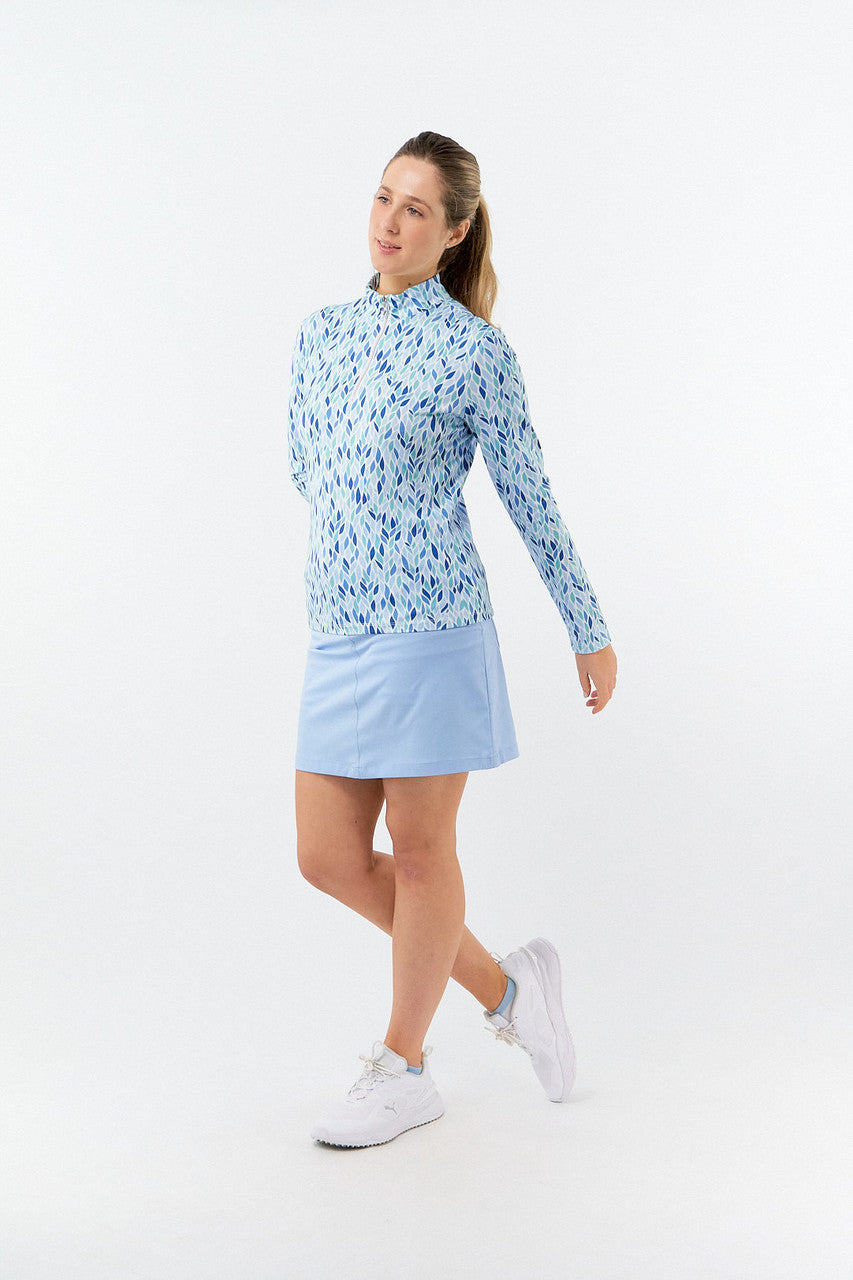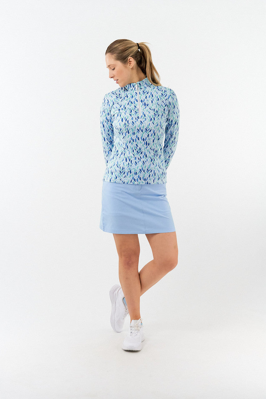 Serenity is a versatile full print long sleeved mid/baselayer top with a quarter zip from our Willow fashion collection. Made from our signature anti static, anti-crease, 4 way stretch & quick drying fabric with built in UVA+UVB sun protection to keep harmful rays away. Can be worn as a base layer by those looking for extra coverage or thrown on as a mid-layer on breezy Summer golf days - the choice is entirely yours! Our serenity mid-layer co-ordinates perfectly with the rest of our Willow fashion collection and pale blue, royal blue, navy and white pieces from our Essentials range.
