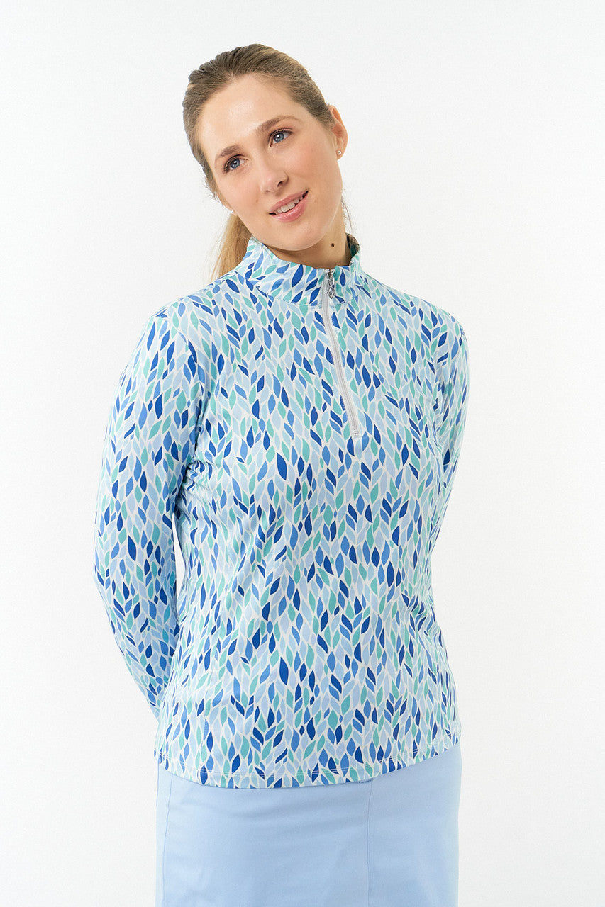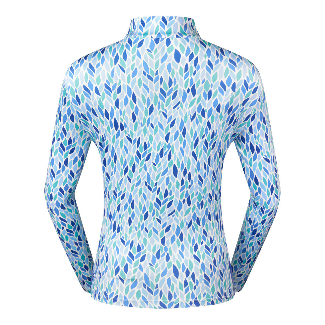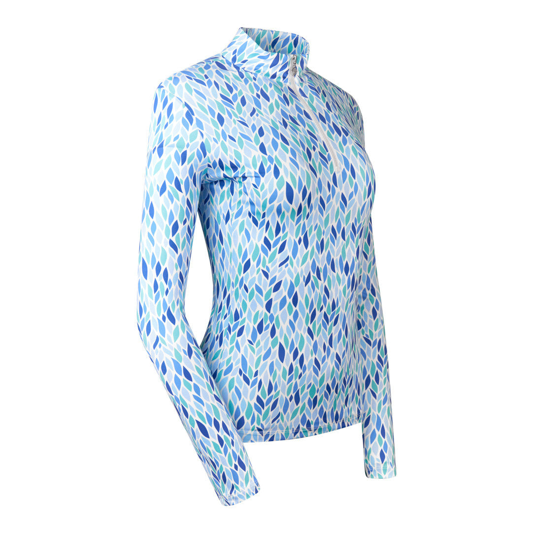 Serenity is a versatile full print long sleeved mid/baselayer top with a quarter zip from our Willow fashion collection. Made from our signature anti static, anti-crease, 4 way stretch & quick drying fabric with built in UVA+UVB sun protection to keep harmful rays away. Can be worn as a base layer by those looking for extra coverage or thrown on as a mid-layer on breezy Summer golf days - the choice is entirely yours! Our serenity mid-layer co-ordinates perfectly with the rest of our Willow fashion collection and pale blue, royal blue, navy and white pieces from our Essentials range.