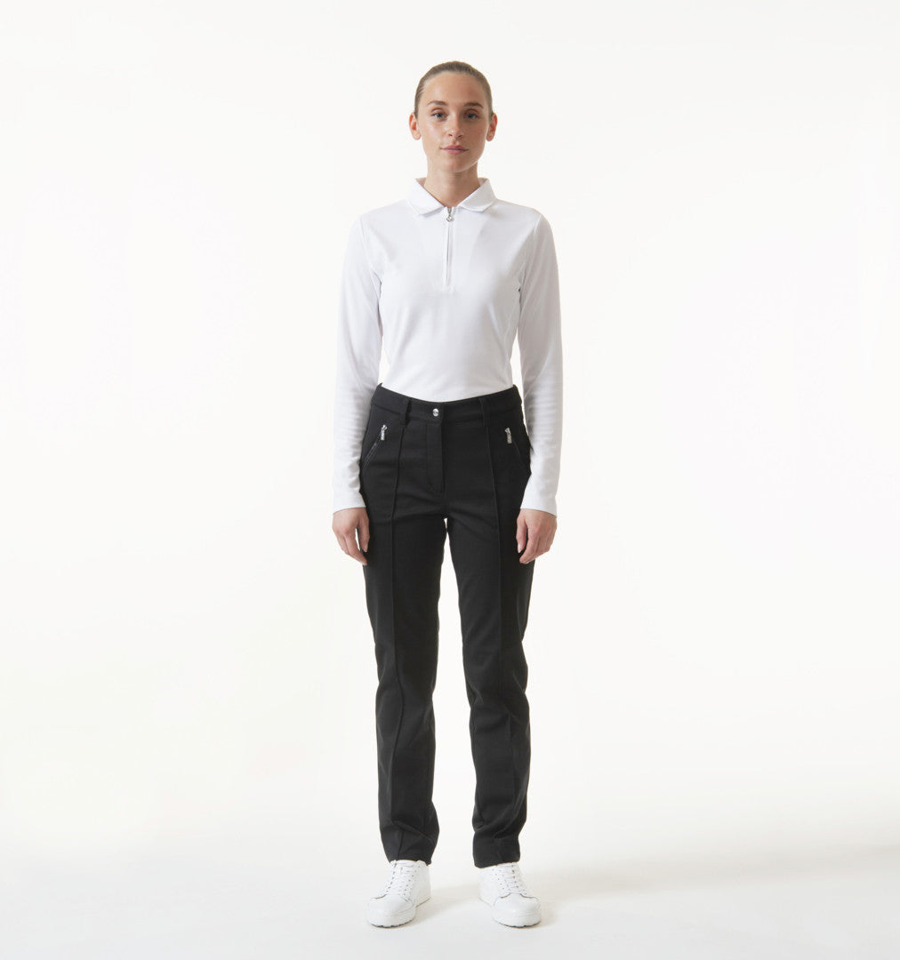 The softshell fabric allows for free movement, and the elegant design features a high waist, stitched creases, and three pockets. Tackle the course with confidence and style.
