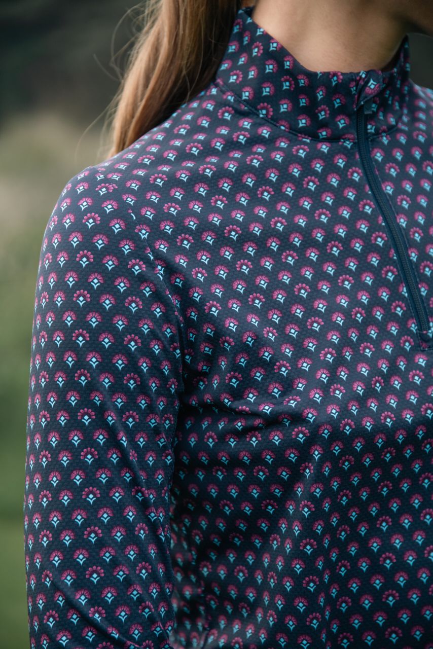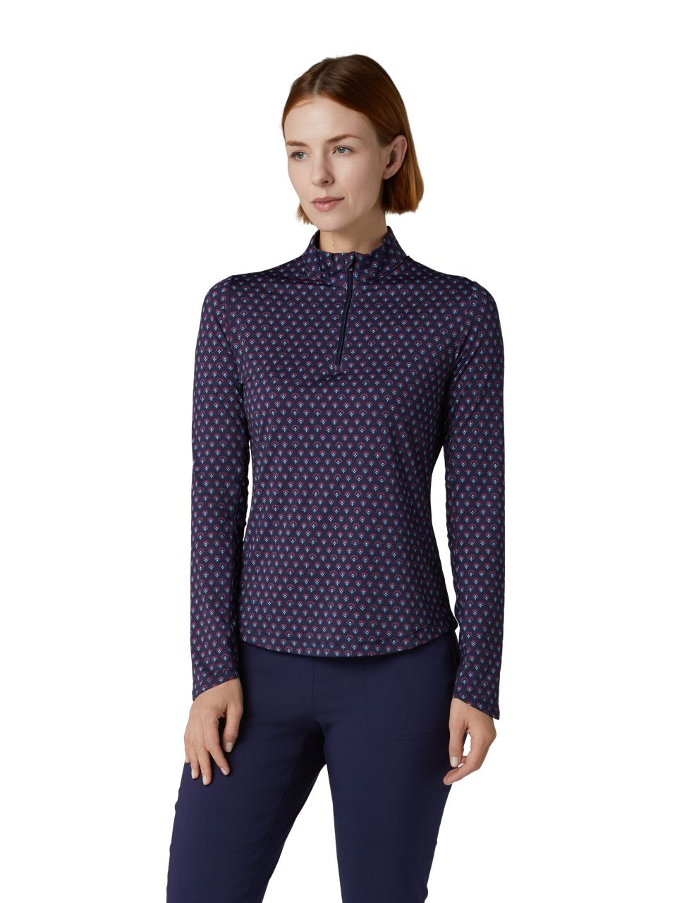 This Callaway women's long sleeve golf top makes a practical addition to your golf wear wardrobe. Stretch technology makes it easy to move in while sun protection blocks harsh UV rays during your game. This long sleeve golf shirt includes a quarter zipper closure, so you can customize your look while the geo print adds stylish flair.
