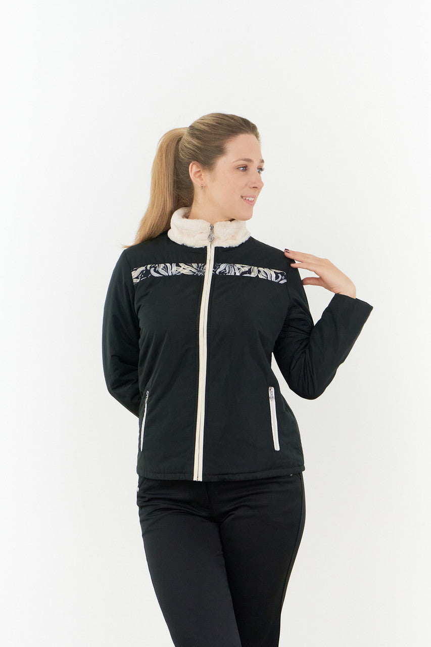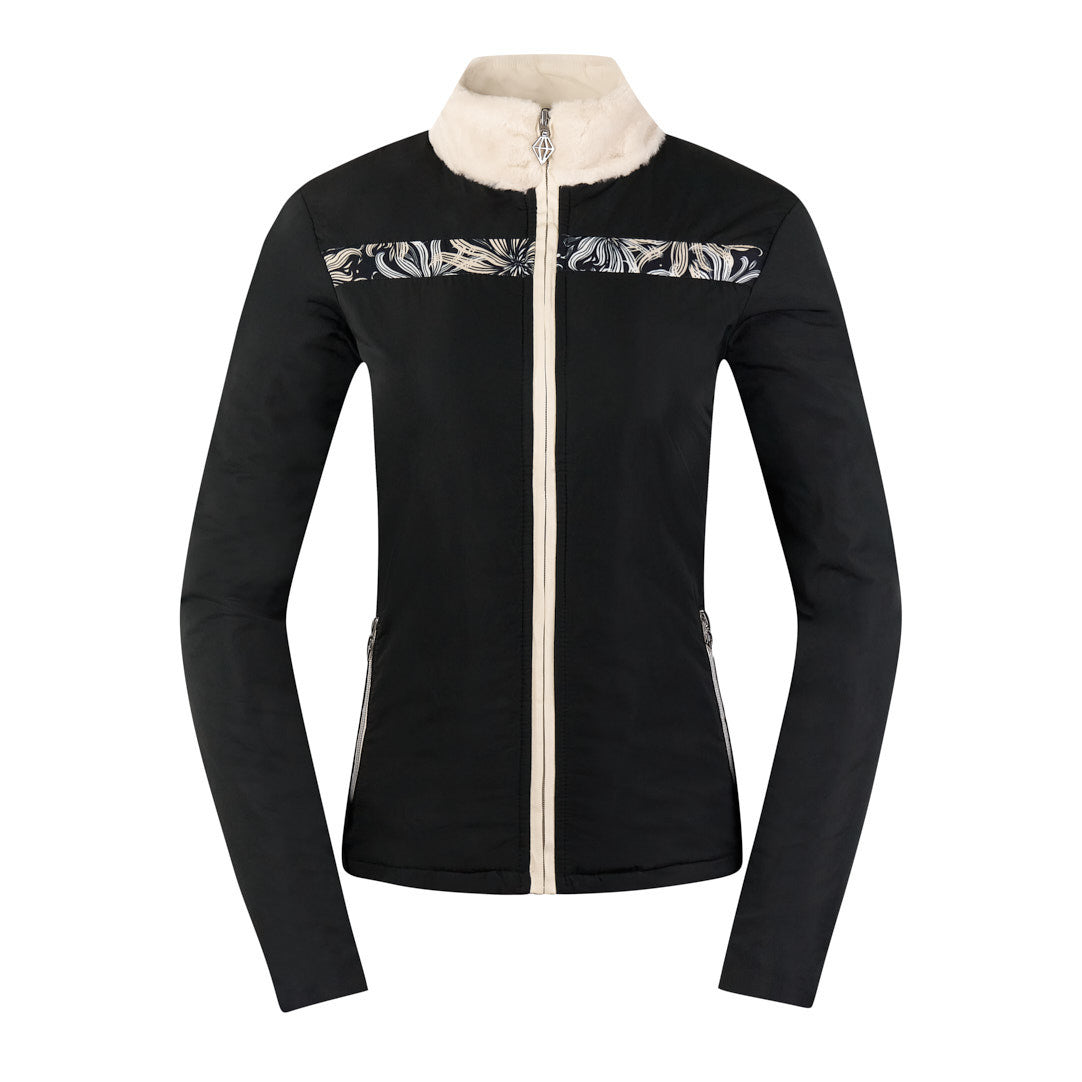 Keira is an insulated, padded ladies' golf jacket in synthetic down fabric, the same wind-repellent winterweight fabric as our gilet range. Featuring a feminine print panel insert on the front chest, a concealed full zip, and faux fur neck for additional warmth. Two zipped side pockets. Part of the Champagne Orchid fashion collection.
