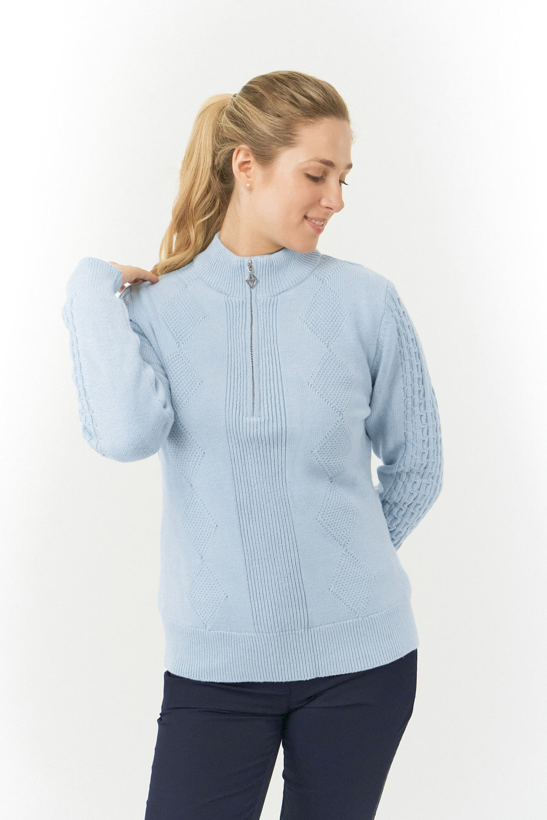The Sorrell Cable Knit Lined Quarter Zip Women's golf Jumper is back in new fashion colours for this season. This extra warm, knitted pullover from Pure Golf has cable knit sleeves & a unique diamond knit pattern on the front and back torso. Sorrell has a true-to-size fit, with ribbed cuffs and hem and an inside lining for additional insulation. Perfect for throwing on over your outfit on those freezing Winter days, from course to clubhouse! This delicate powder blue colour is easy and flattering to wear and has a matching collection for a fully coordinated look.