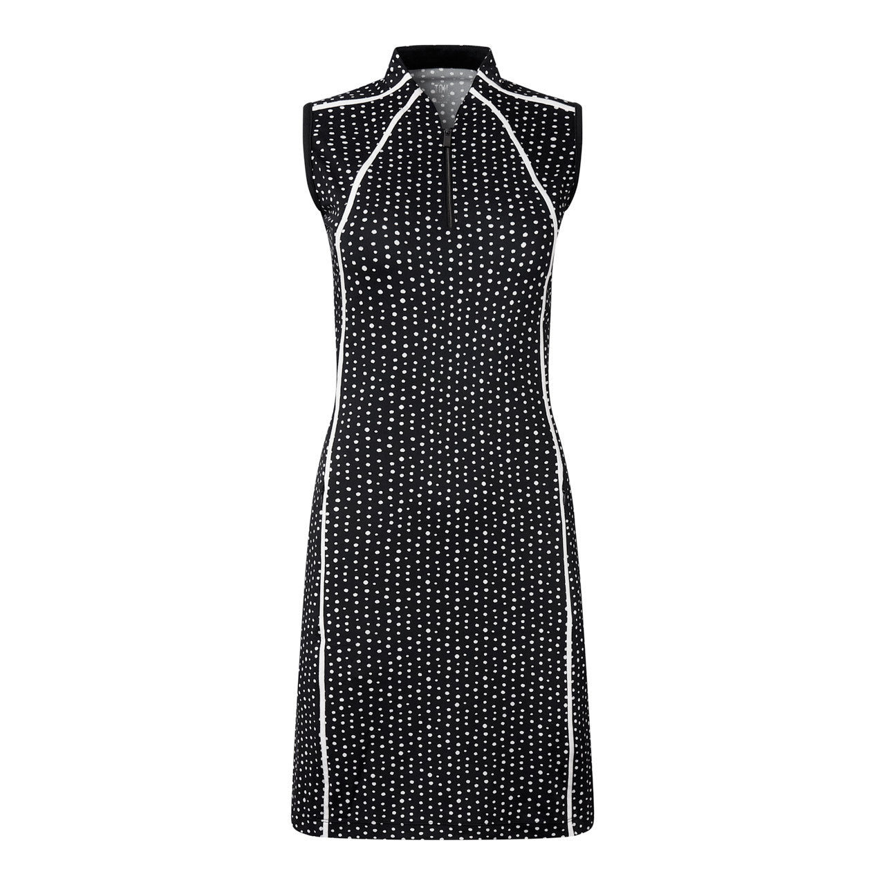 The straight, sleeveless Mika dress has a clean front that seamlessly transitions to a novelty collar and quarter zipper panel. With vertical piping details that lend to a very slimming look with 2 side zipper pockets. This dress includes shorties.