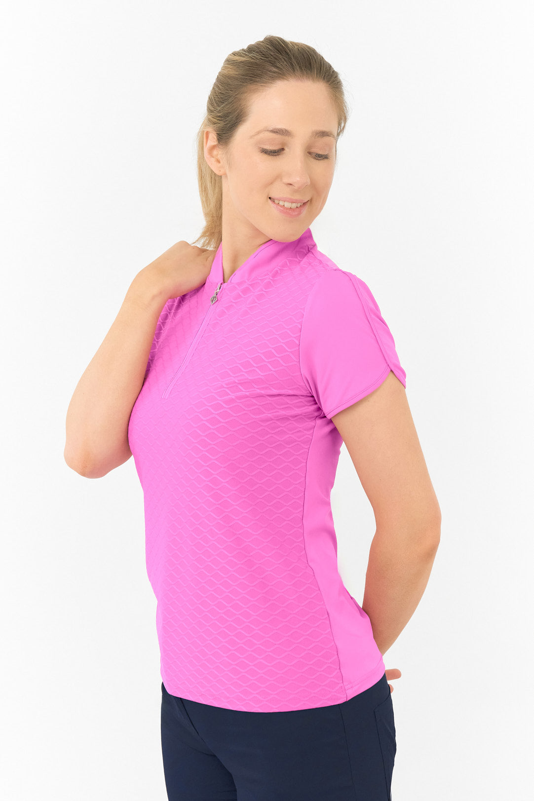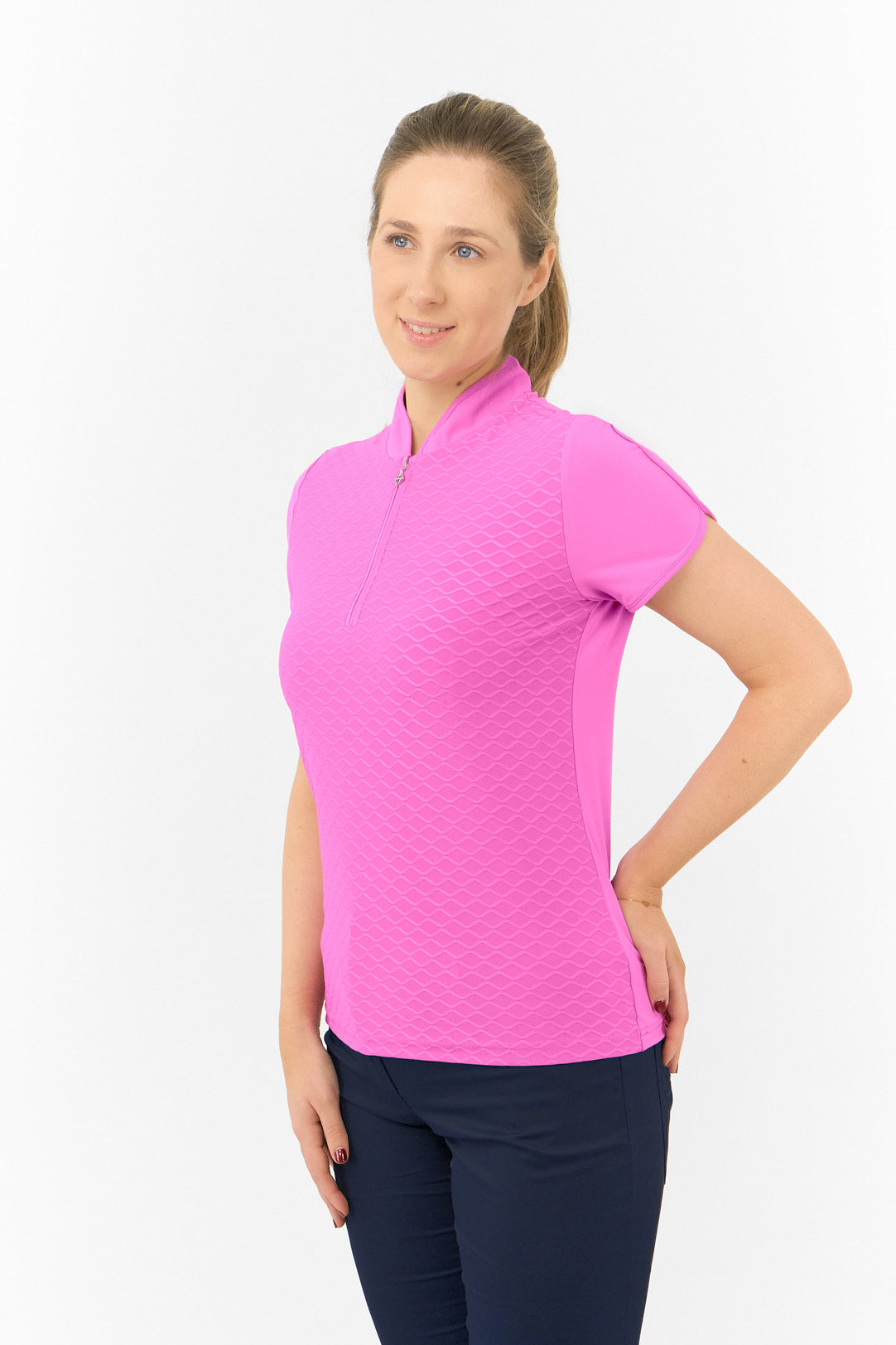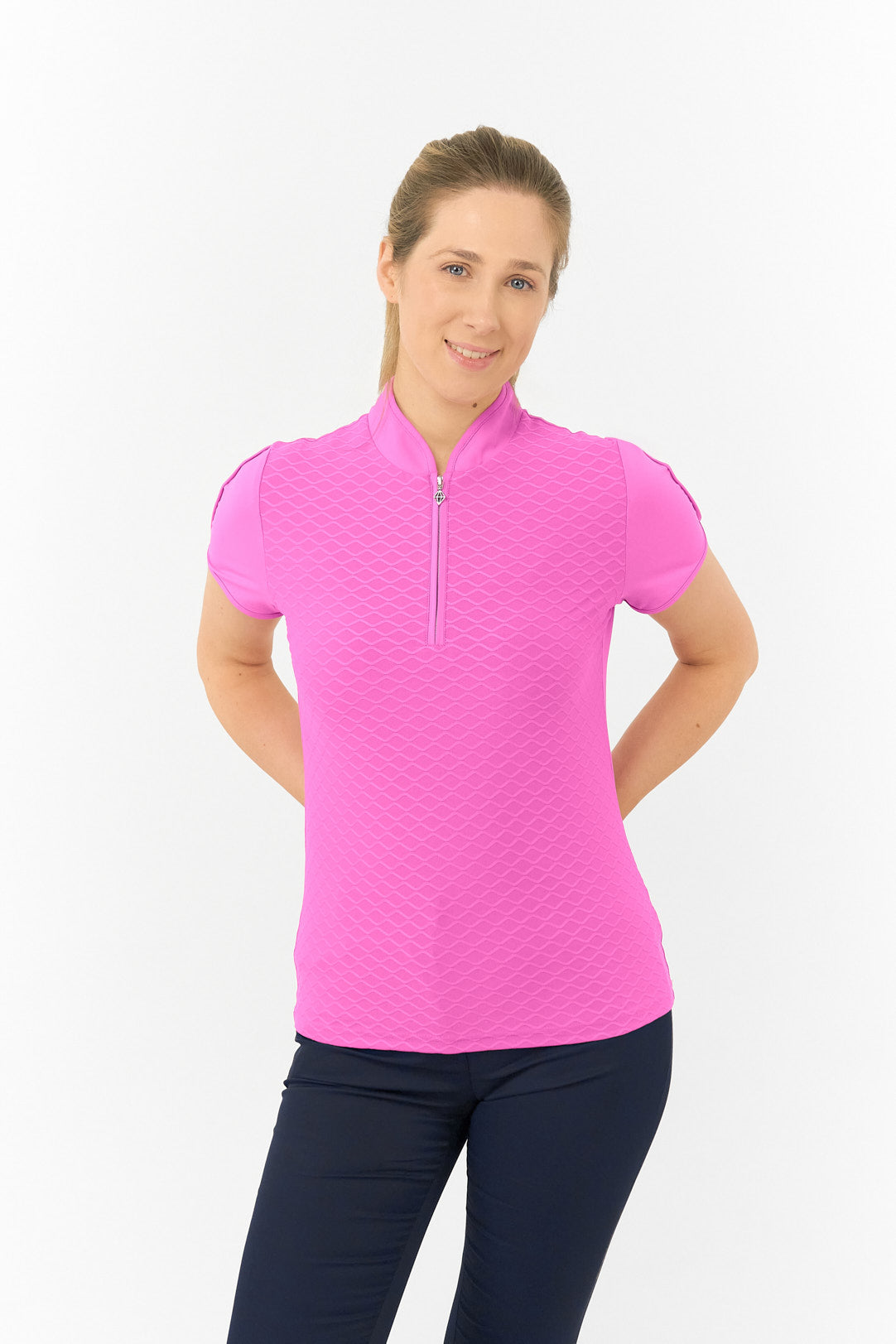 The Pure Golf Valley Cap Sleeve Azalea Pink Ladies Short Sleeve Polo Shirt is a stunning shade of pink that perfectly complements the rest of the Pure Golf Essentials Collection, allowing you to coordinate your look from head to toe. A must-have piece for women golfers, don’t miss out on adding this essential garment to your wardrobe.