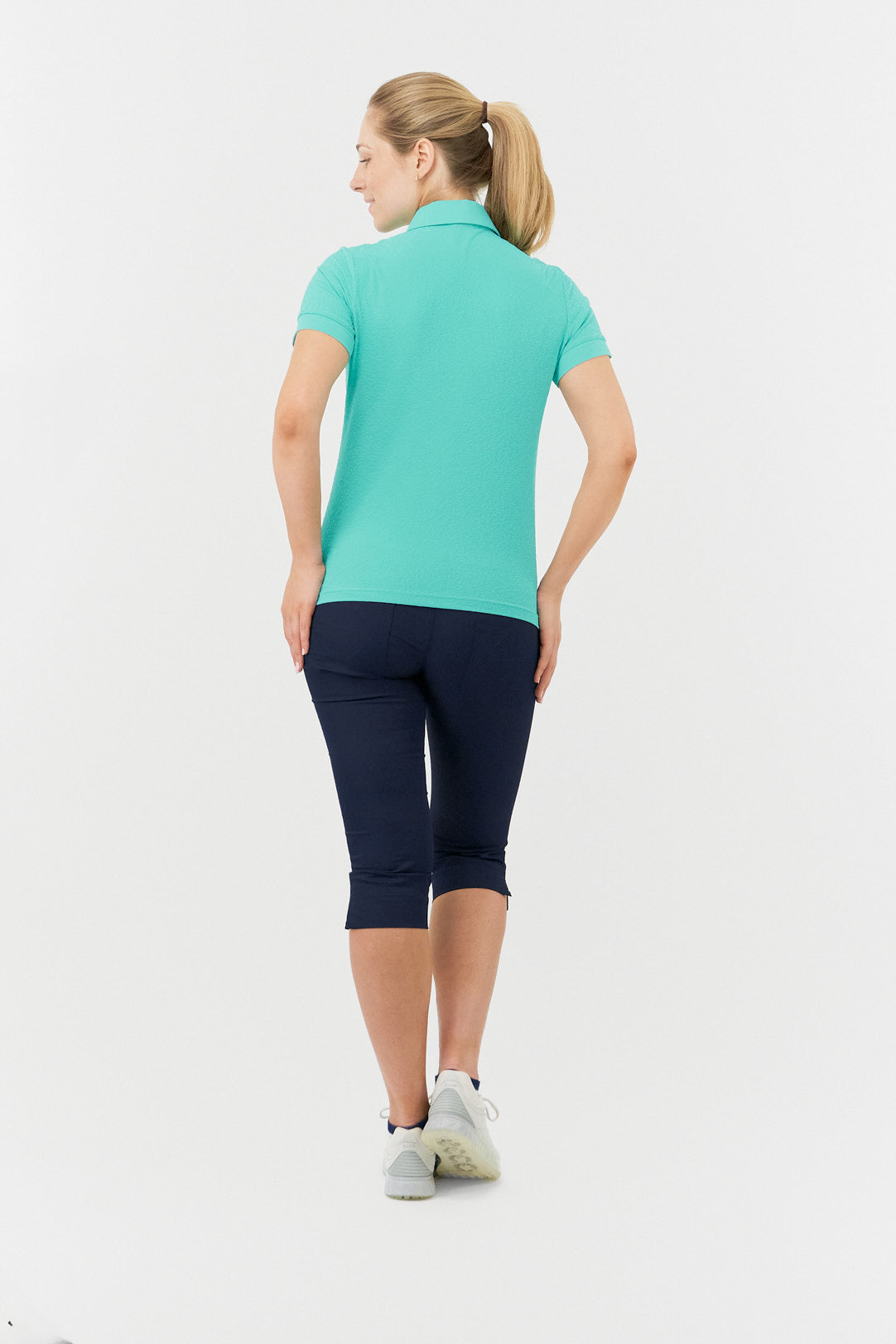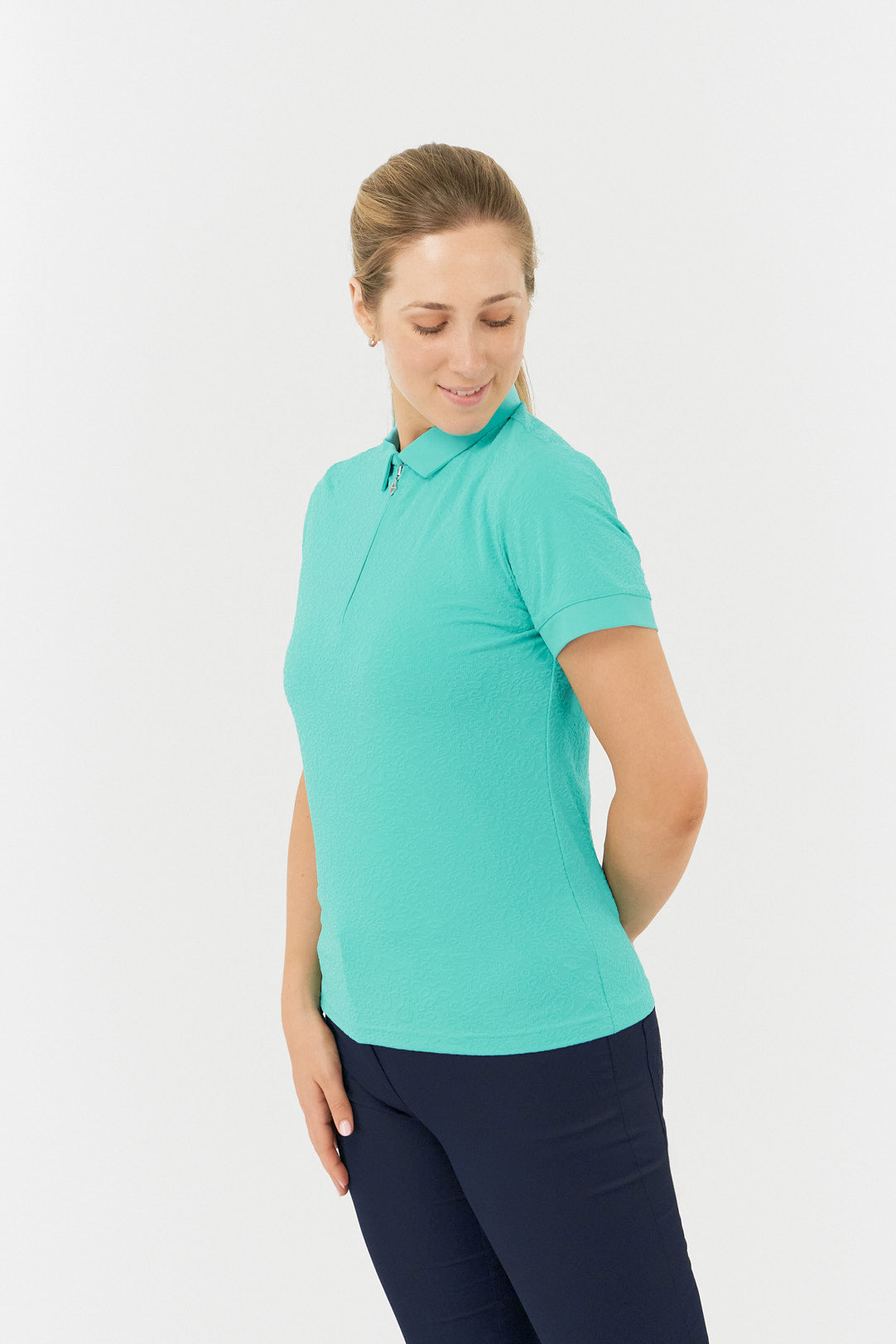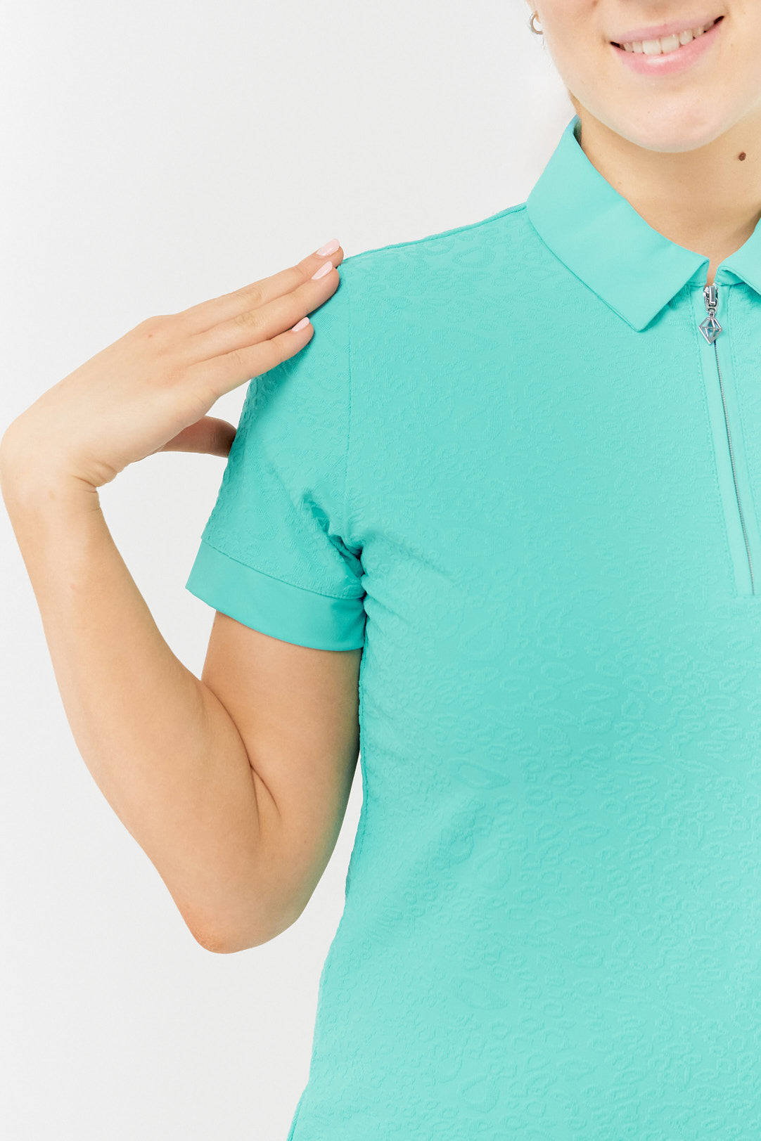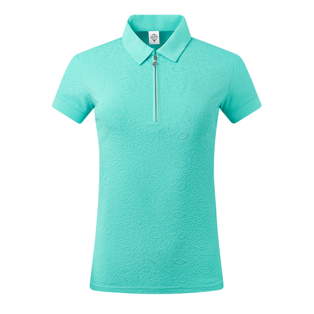 Refresh your look on the green with our Pure Golf Rebecca-Jacquard Textured Ocean Women's Golf Top. This short-sleeve polo from our Pure Golf With Personality Collection seamlessly blends cutting-edge technology with a striking design, ensuring a flawless, head-to-toe style. With its innovative, eye-catching details, this essential piece is ready to elevate your wardrobe. Don’t miss your chance to make this yours today!