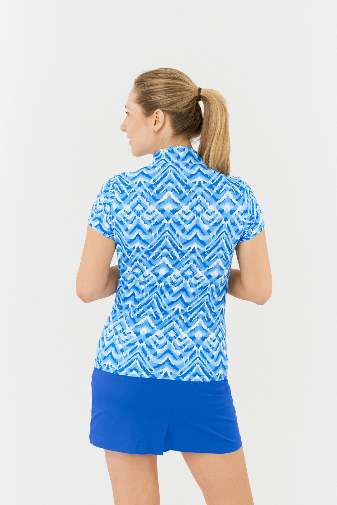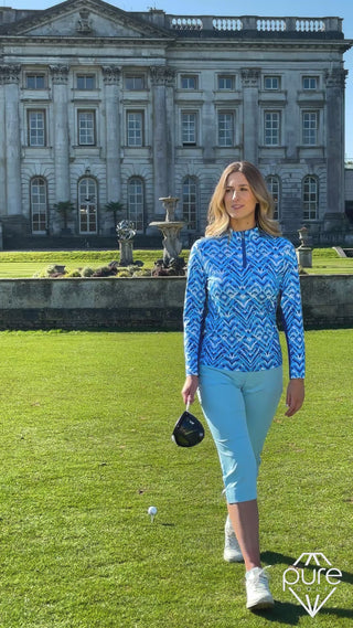Transform your golf experience with Pure Golf Rise Ladies Golf Cap Sleeve Polo Shirt - Santorini Skies. Its enchanting Ikat-inspired pattern in shades of blue and white is reminiscent of the breathtaking views of a Greek Summer. Don't let this essential garment for golfers slip away and add it to your wardrobe.