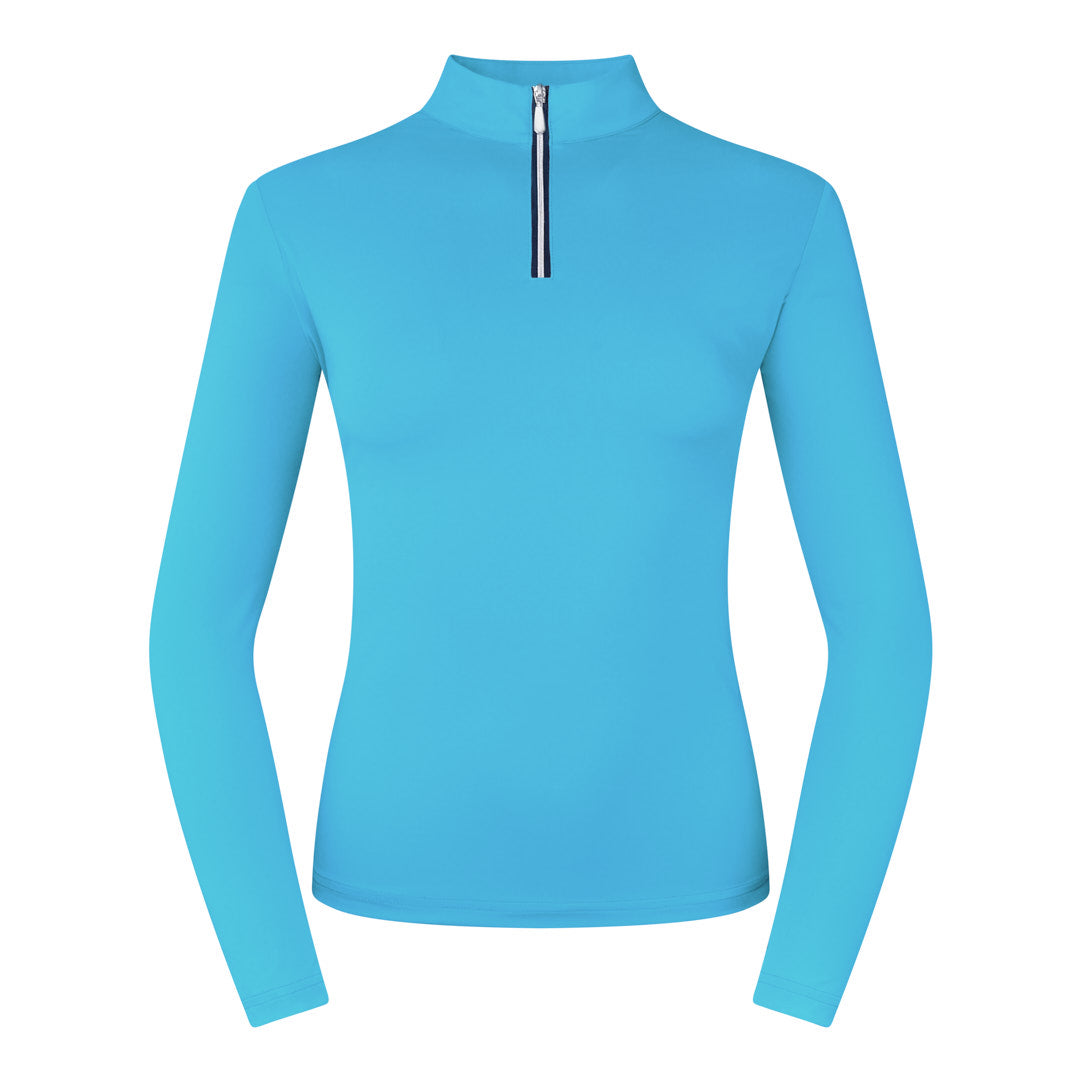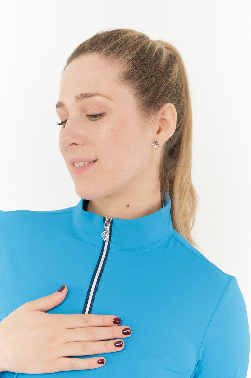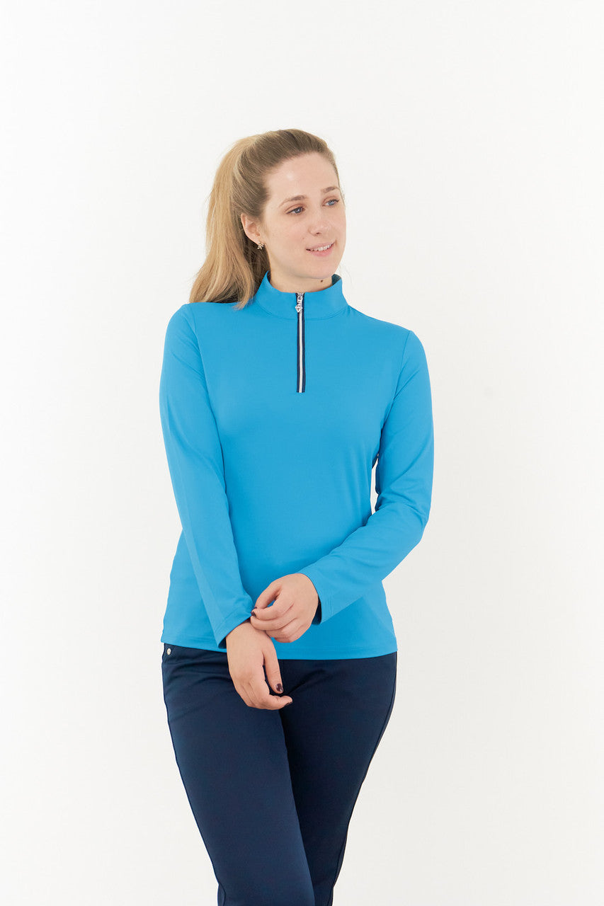 Tranquility is a lightweight quarter zip top made from a 4-way stretch, UPF35 sun protective fabric. In tonal colours with a tourmaline blue body and contrasting navy zip, this top makes a great alternative if you are a fan of the blue tones featured in the tourmaline leopard collection but pattern is not your style. We recommend staying true to size to wear as a base layer, or sizing up to wear as a mid-layer.