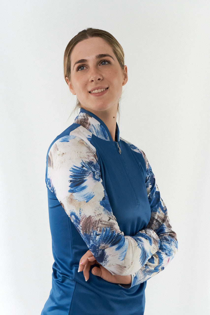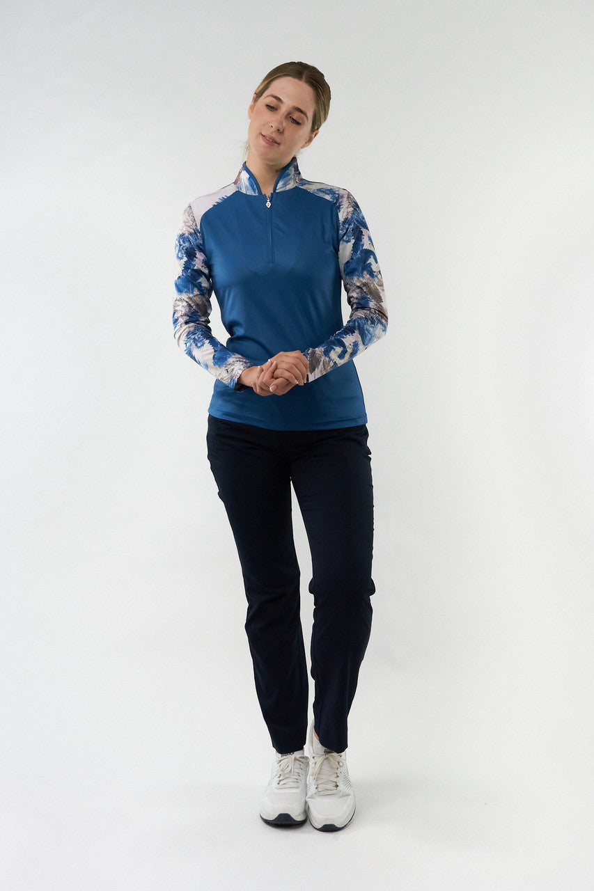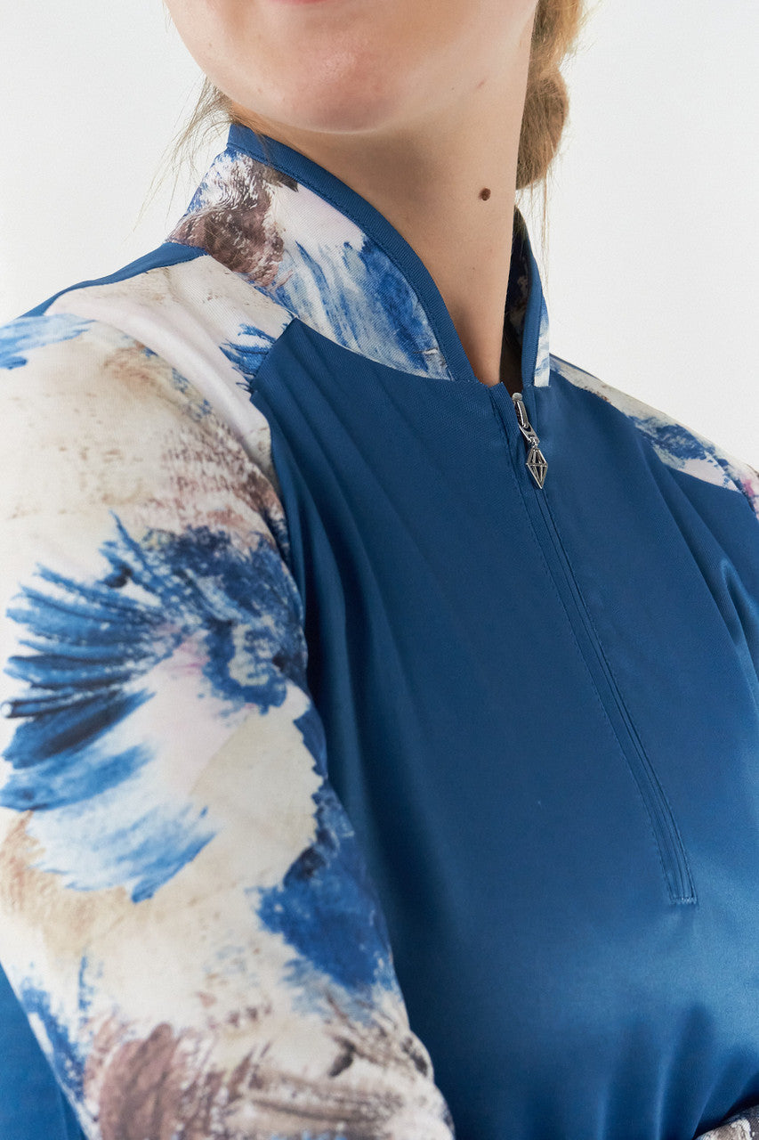 Hazel is a partially printed long-sleeve golf polo shirt made from anti-static, anti-crease, 4 way stretch and quick drying fabric with built in UVA+UVB sun protection with UPF 35 to block harmful rays on the course.