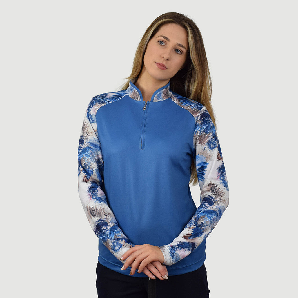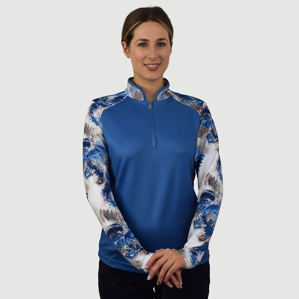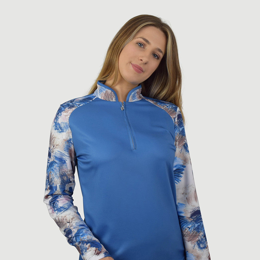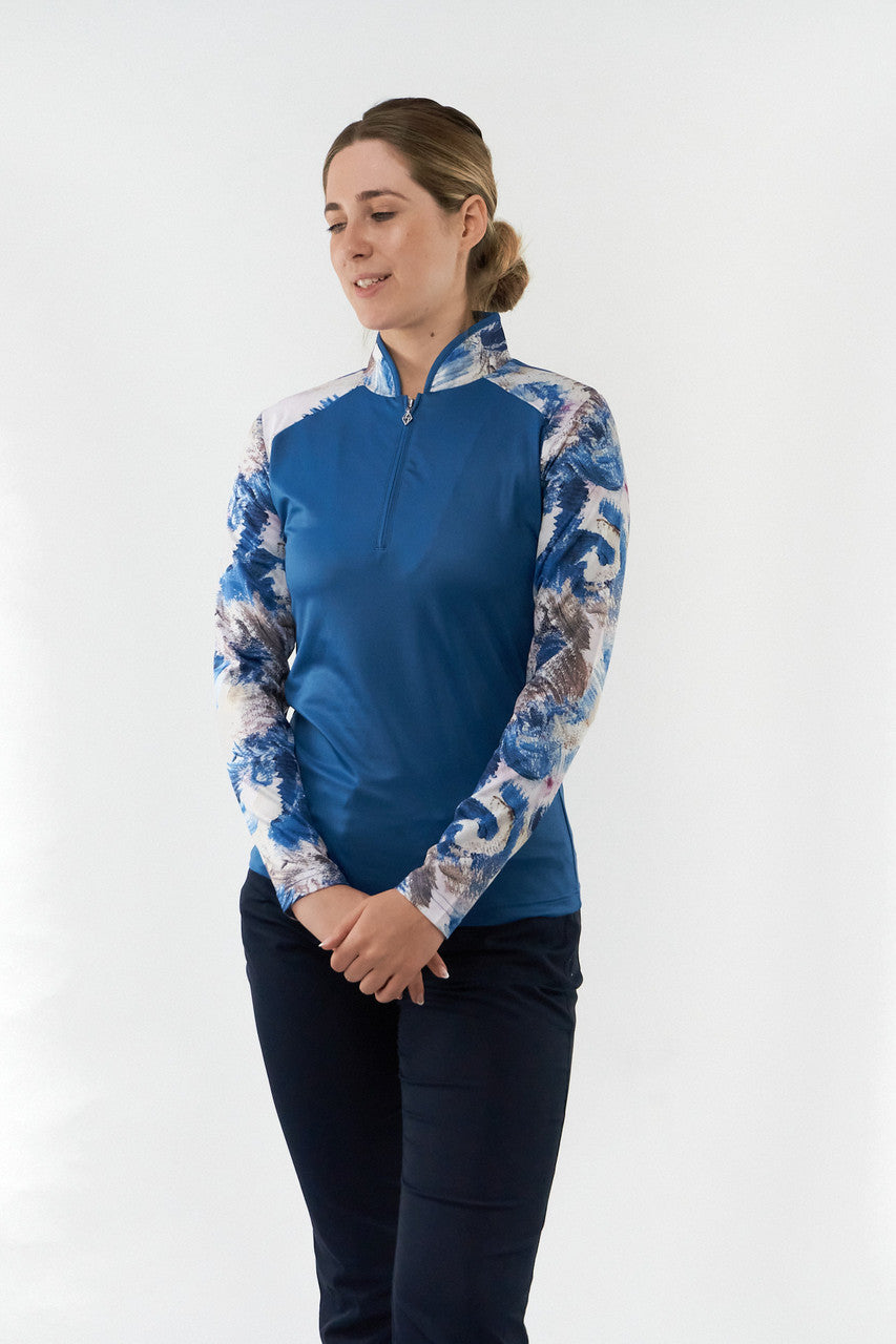 Hazel is a partially printed long-sleeve golf polo shirt made from anti-static, anti-crease, 4 way stretch and quick drying fabric with built in UVA+UVB sun protection with UPF 35 to block harmful rays on the course.
