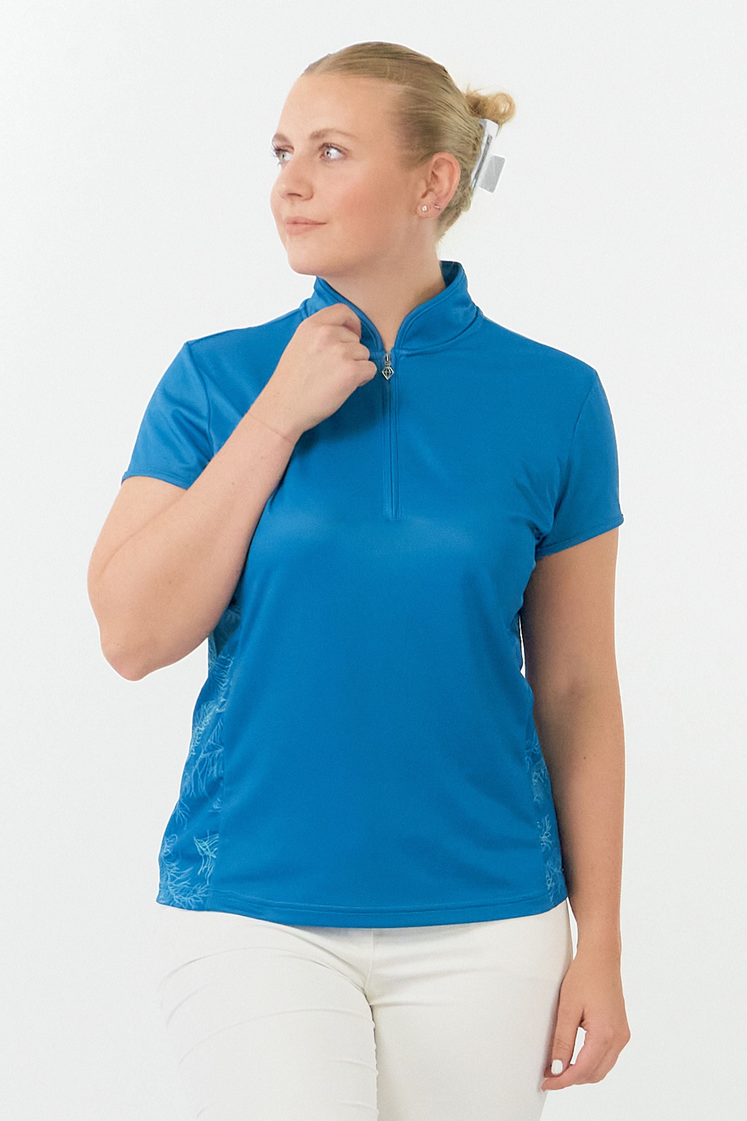 Holly is a partially printed cap sleeve polo shirt made from anti-static, anti-crease, 4 way stretch and quick drying fabric with built in UVA+UVB sun protection with UPF 35 to block harmful rays on the course.