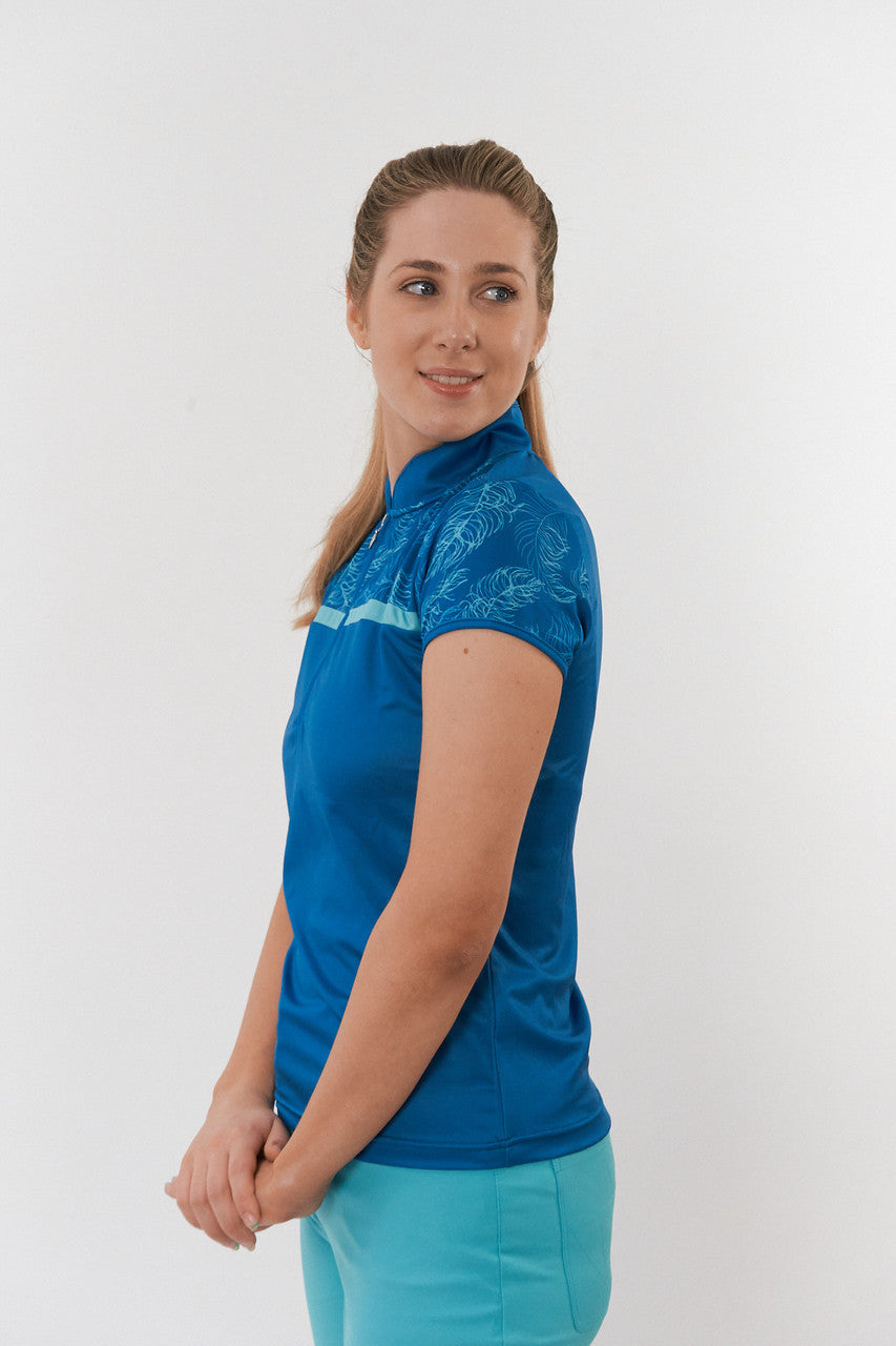 Lilianna is a stylish partially printed cap sleeve polo shirt made from anti-static, anti-crease, 4-way stretch, and quick drying fabric with built in UVA+UVB sun protection with UPF 35 to block harmful rays on the course.