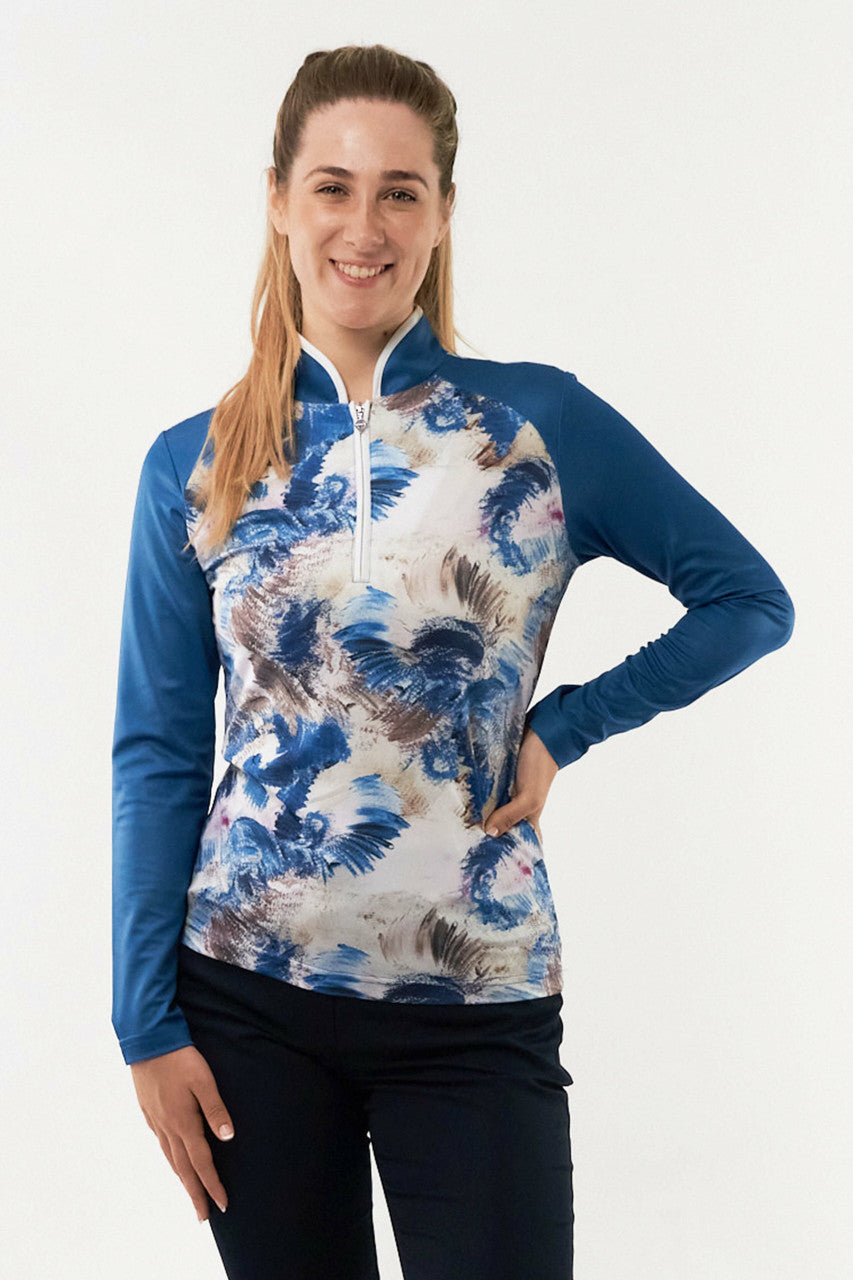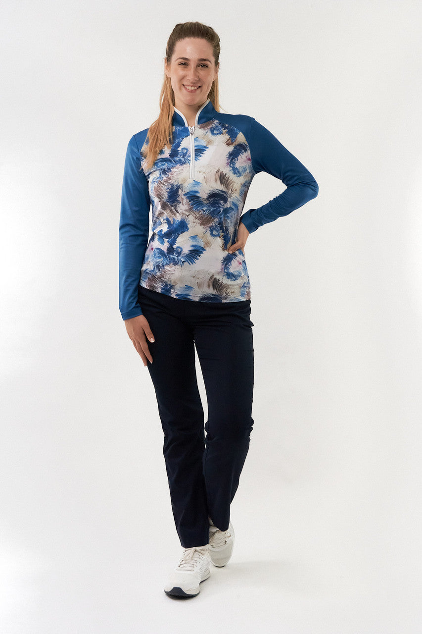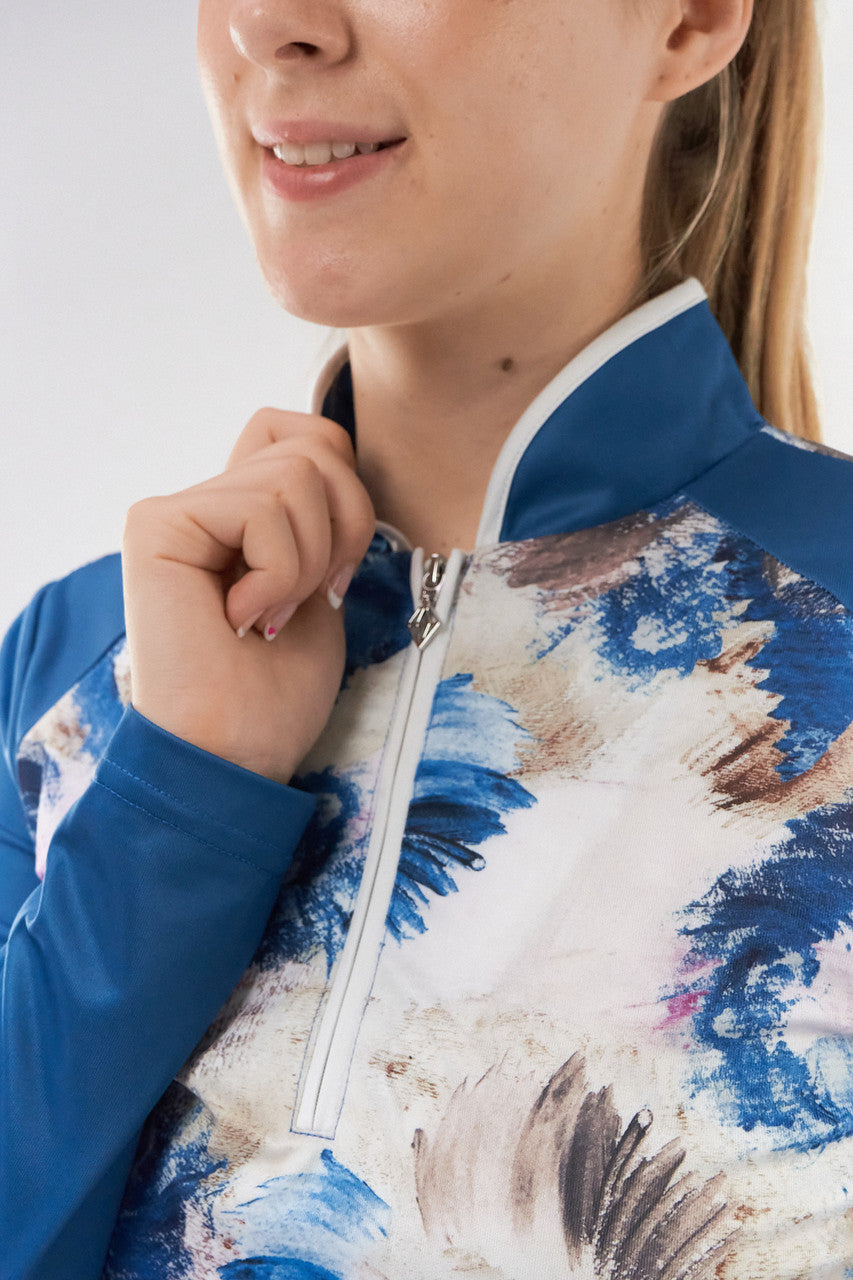 Pure Golf Sienna Long Sleeve Zip Neck Top - Stone Canvas Collection - Vallarta Blue
