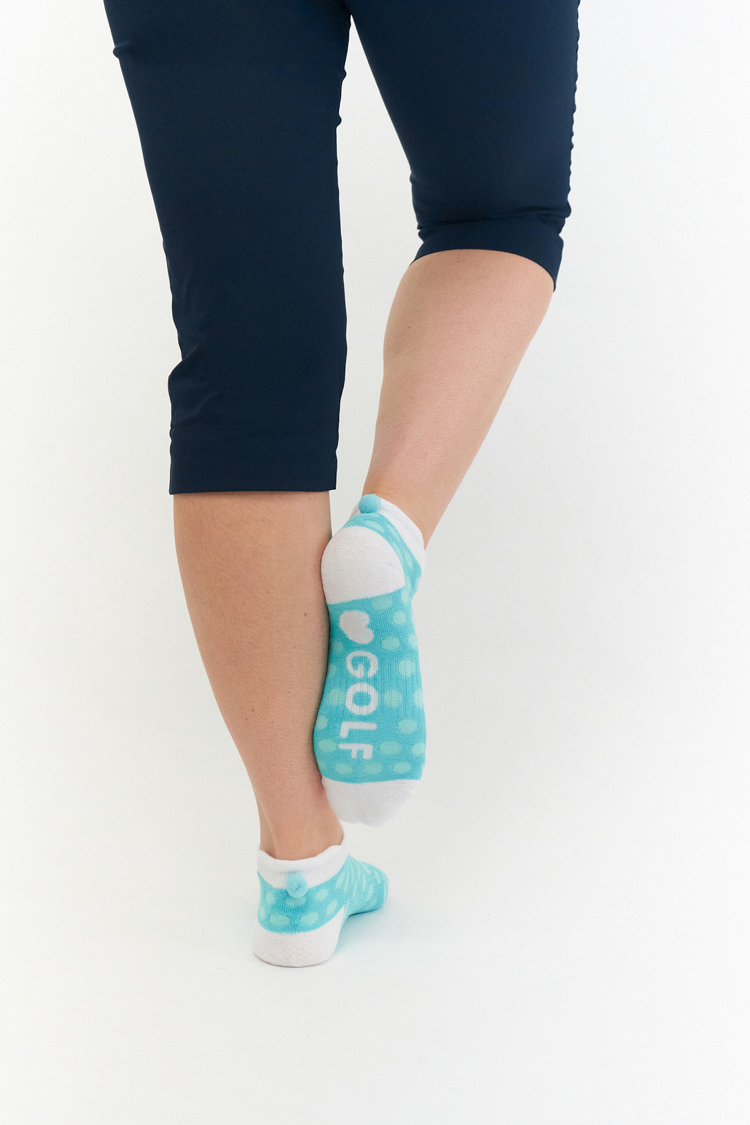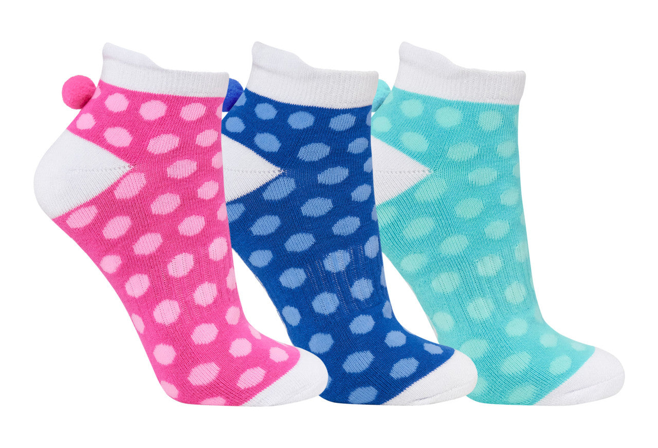 This 3 pack of ankle ladies golf socks have a coordinating colour pom pom on the heel to help the socks hold their position. With a cushioned sole and compression fit, for maximum comfort as you play golf or around town! Made from a soft, stretchy cotton blend fabric that gives you improved support for your foot. This fabric blend also has great breathability, allowing air to circulate so your feet will feel dry and comfortable whilst not getting sweaty. These Golf Socks won't lose there shape even after many washes. Perfect for the summer months. They are suited to UK sizes between 4 and 7.