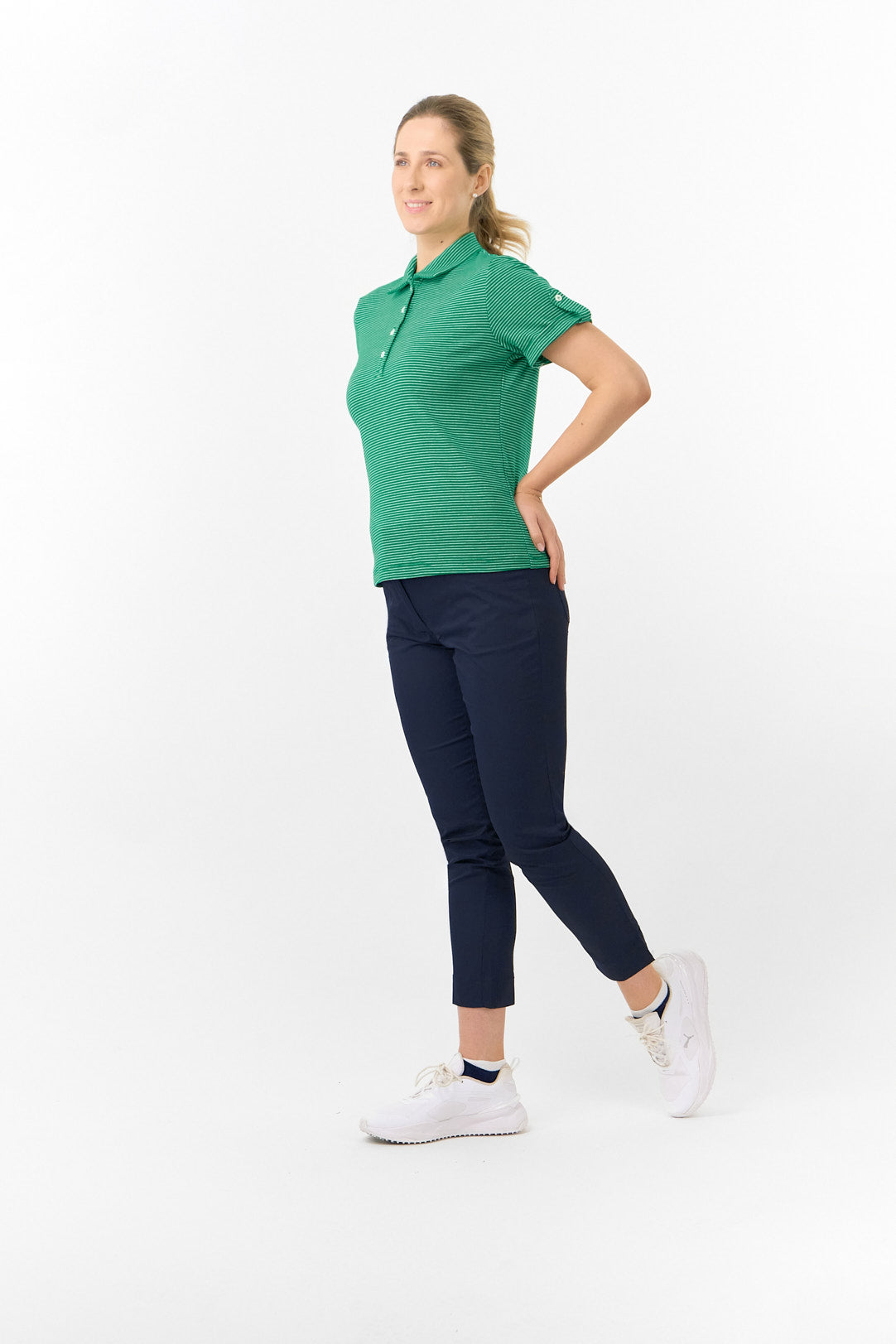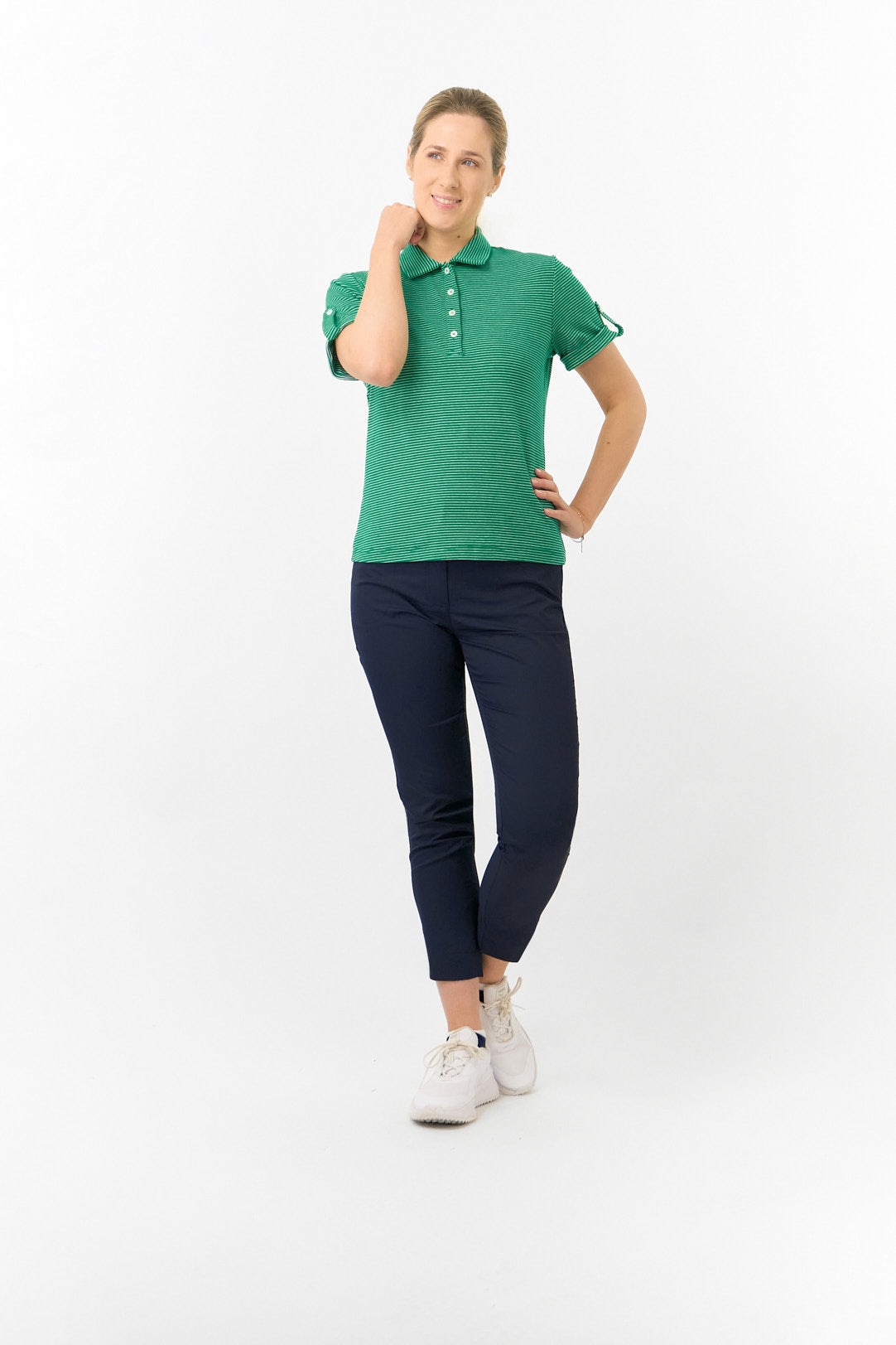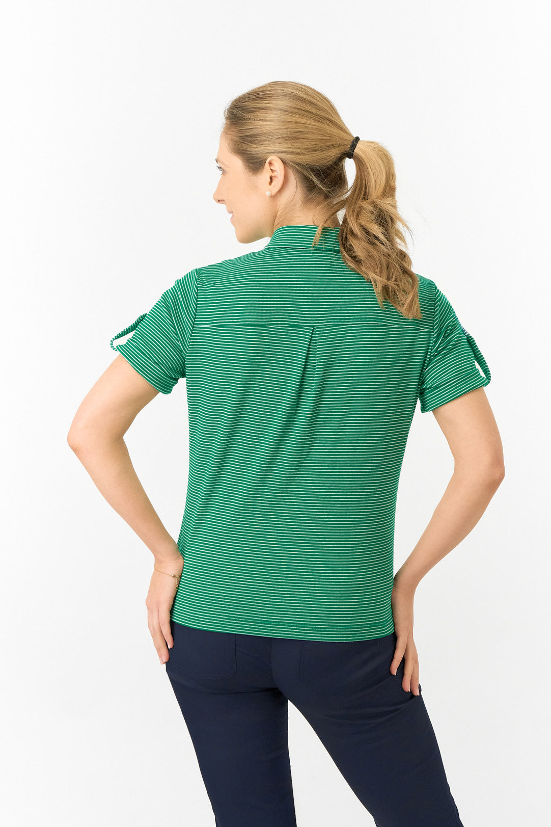 Indulge in exquisite refinement with our Imy Buttoned Short Sleeve Polo Shirt for women, featuring a classic Emerald Green and White stripe design. A beautiful statement piece from our Kensington Garden collection, this elegant shirt boasts a reverse box pleat and rolled-up sleeves adorned with delicate buttons. Elevate your fashion game with this opulent addition now.