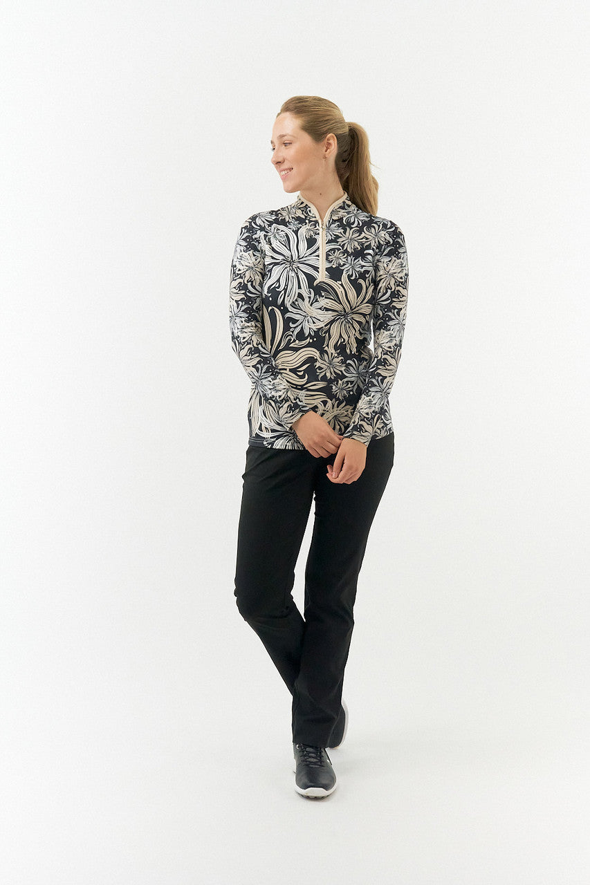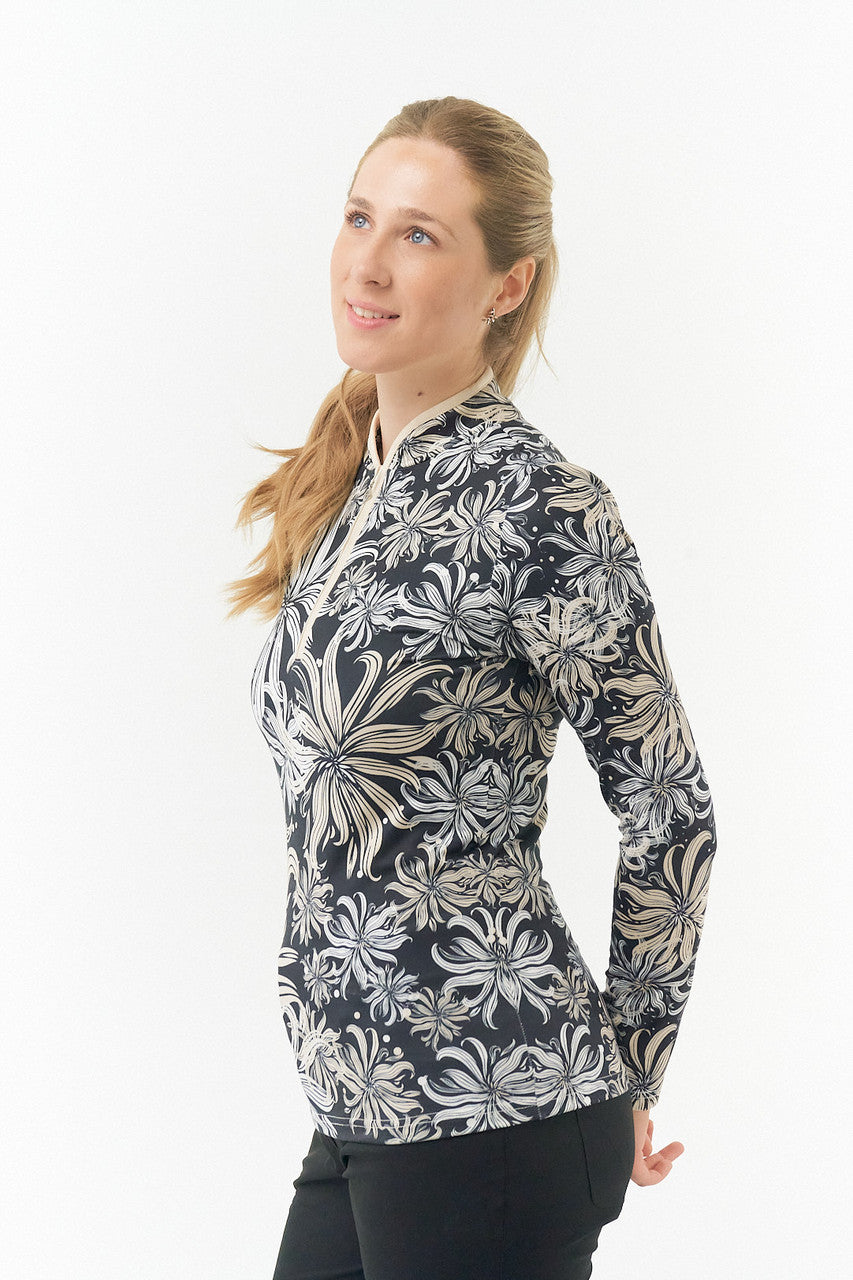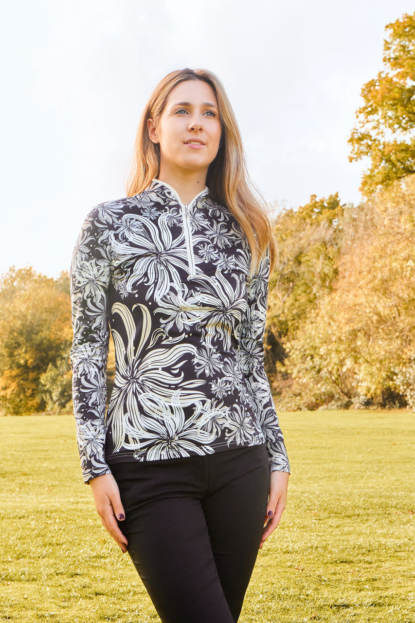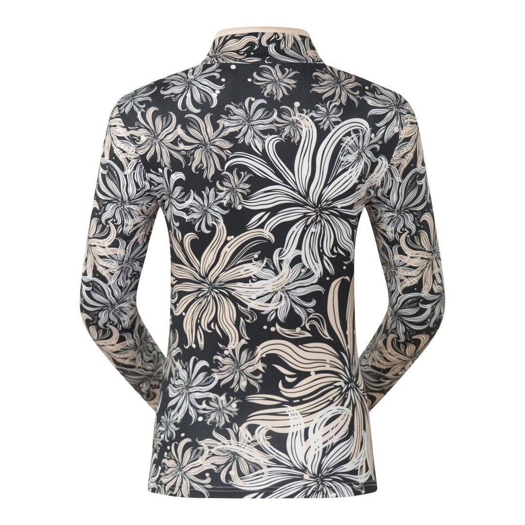 Auria is a long-sleeved ladies' golf zip top made from brushed, winterweight fabric. Auria has a full print design featuring varied print scales for extra originality and a complimenting champagne colour trim. Mandarin collar, contrasting zip, and diamond logo zipper puller. Made from UPF35, 4-way stretch, anti-crease fabric for ultimate comfort and performance on the course.