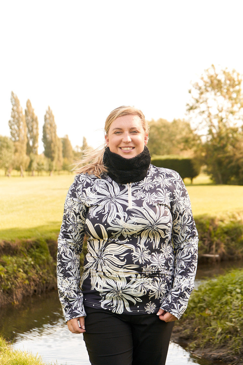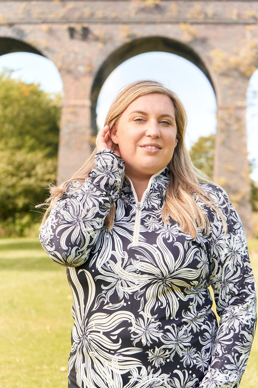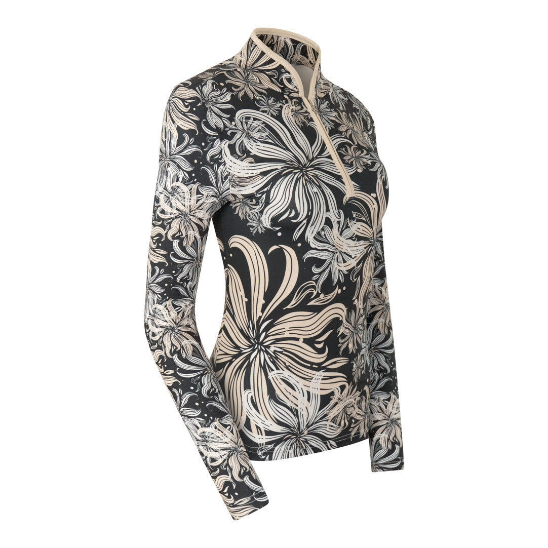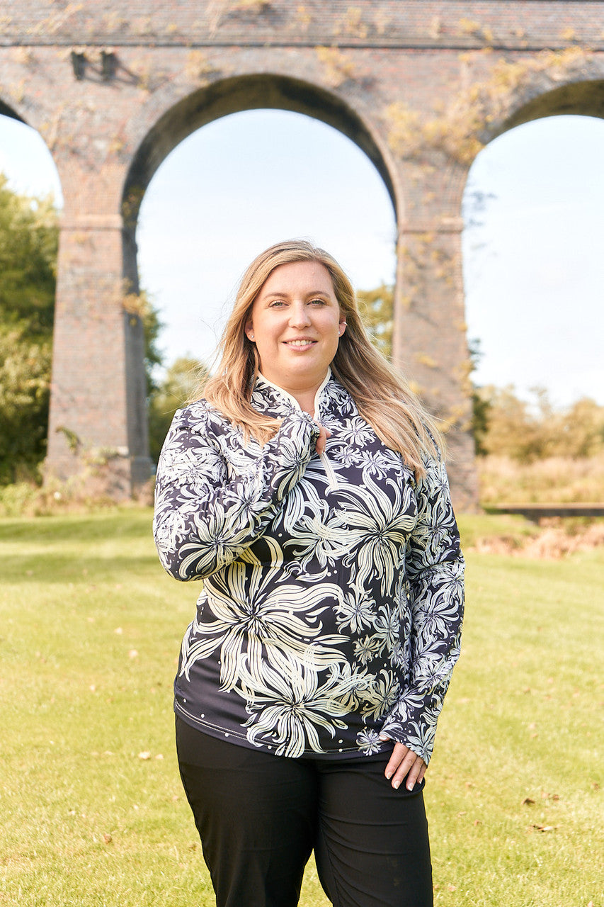 Auria is a long-sleeved ladies' golf zip top made from brushed, winterweight fabric. Auria has a full print design featuring varied print scales for extra originality and a complimenting champagne colour trim. Mandarin collar, contrasting zip, and diamond logo zipper puller. Made from UPF35, 4-way stretch, anti-crease fabric for ultimate comfort and performance on the course.