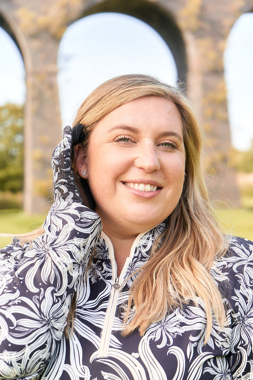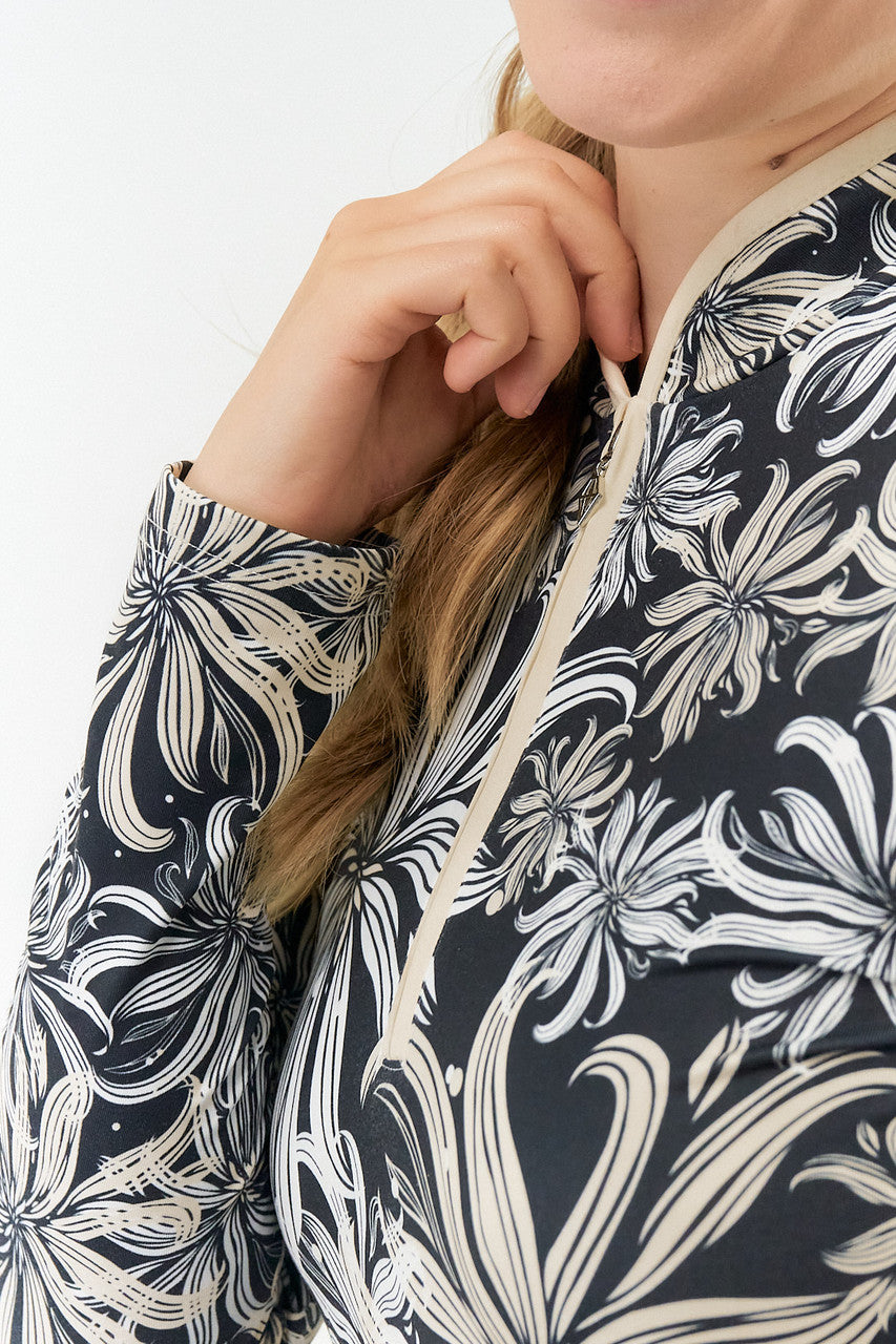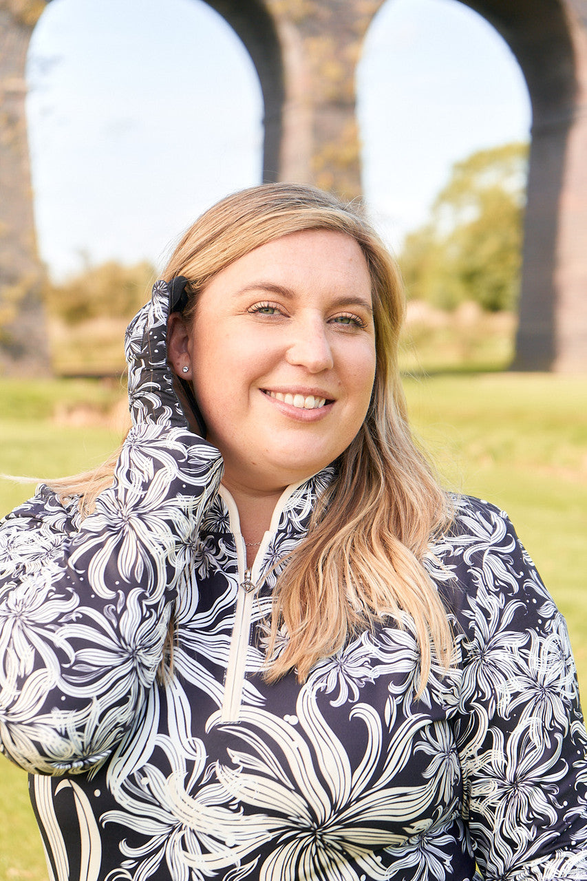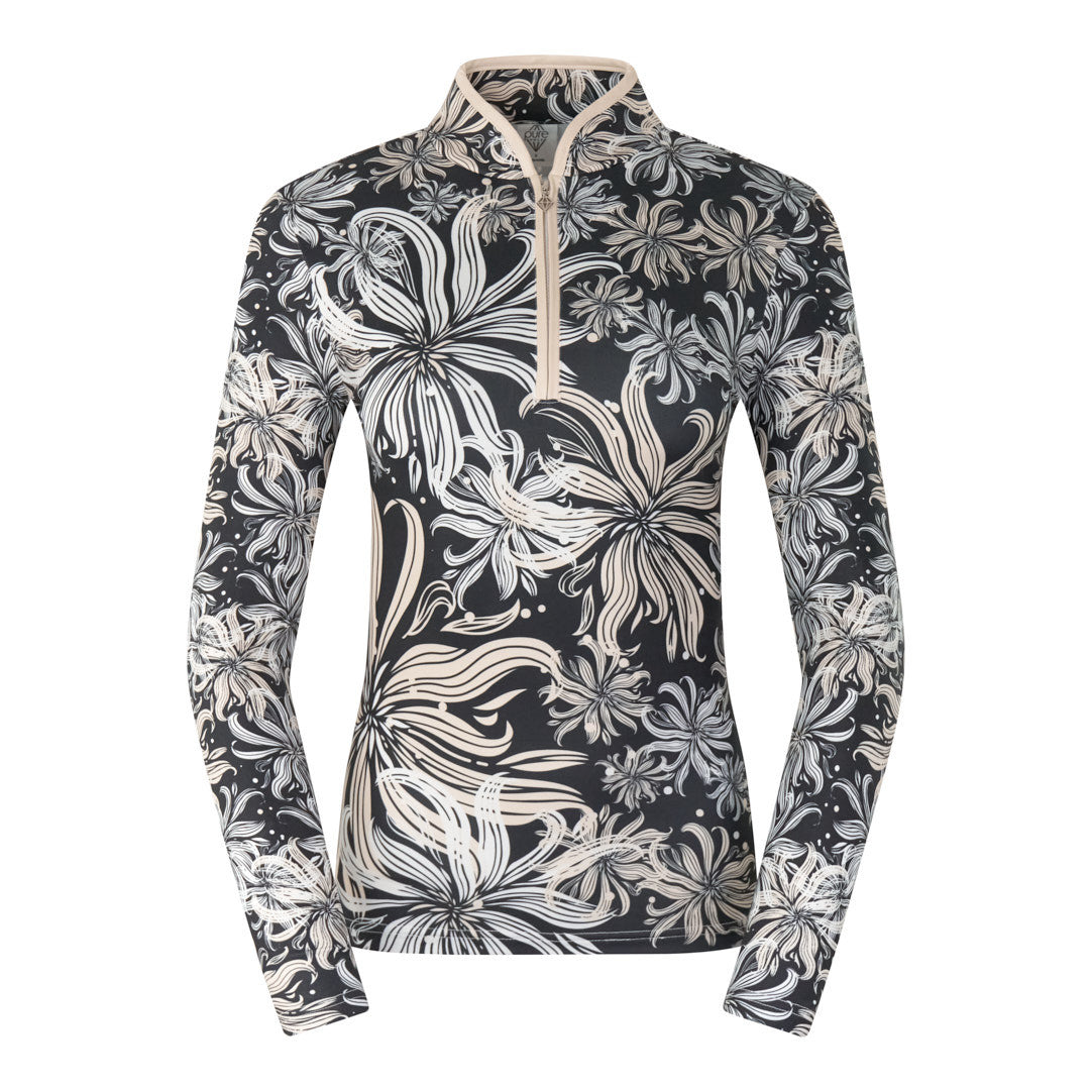 Auria is a long-sleeved ladies' golf zip top made from brushed, winterweight fabric. Auria has a full print design featuring varied print scales for extra originality and a complimenting champagne colour trim. Mandarin collar, contrasting zip, and diamond logo zipper puller. Made from UPF35, 4-way stretch, anti-crease fabric for ultimate comfort and performance on the course.