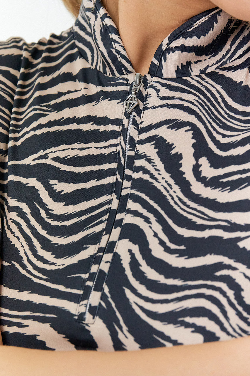 Bay is a stunning printed cap sleeve ladies' golf polo shirt with cappuccino side panels for a streamlining effect. Made from anti-static, anti-crease, 4-way stretch, and quick-drying fabric with built-in UVA+UVB sun protection with UPF 35 to block harmful rays on the course.