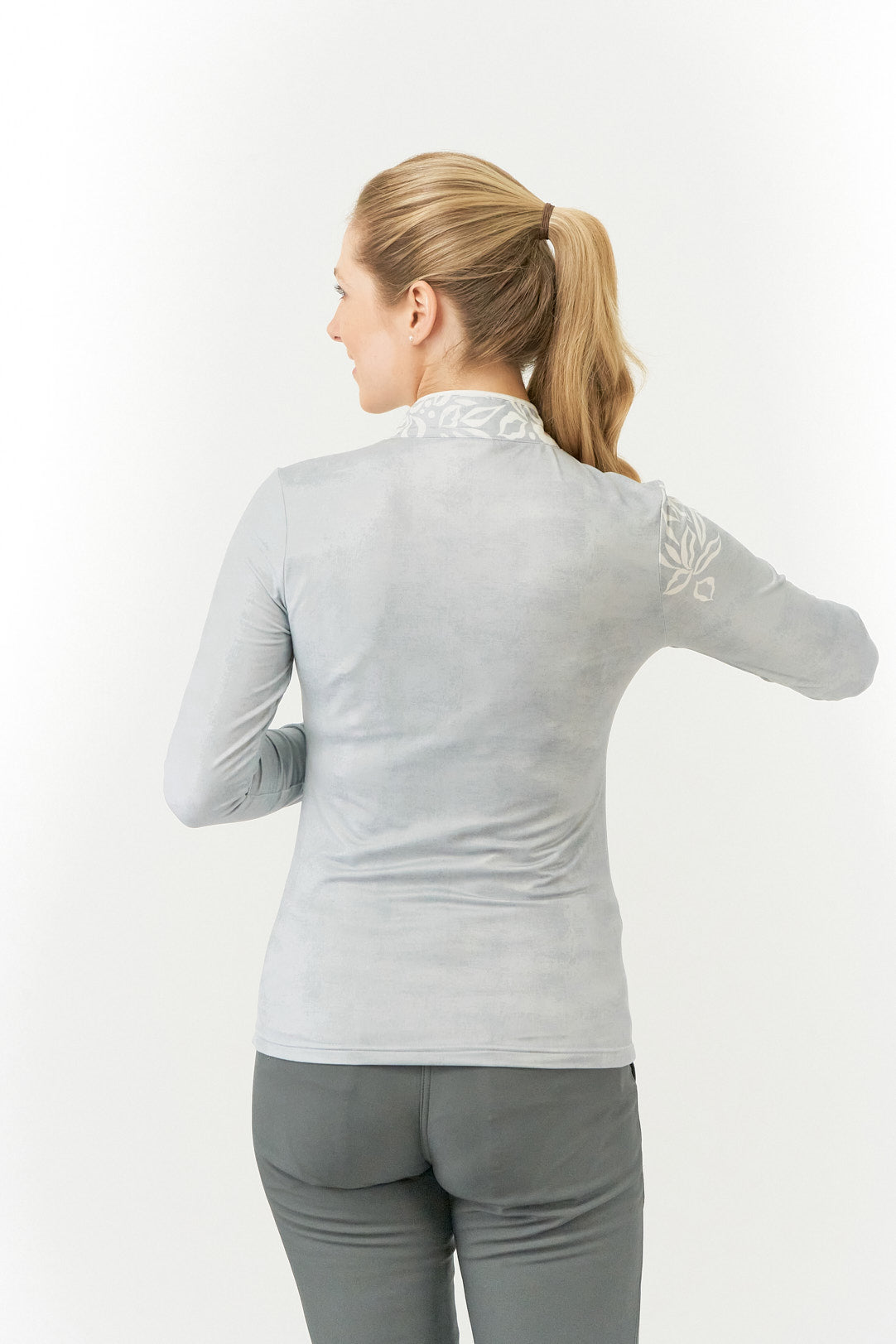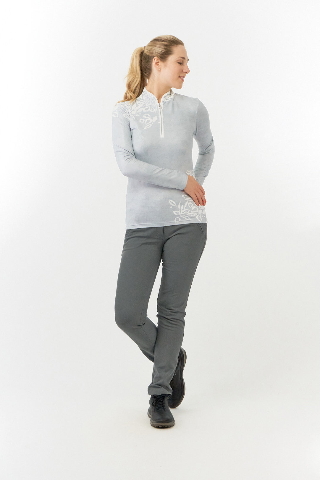 The Pure Golf Natalie  long sleeve golf top is made from brushed, winterweight fabric. The "Scattered Leaves" print is a refined and modern leaf pattern that combines simplicity with elegance. The design features leaves delicately arranged on a textured-look background, making it a stylish choice for both the course and everyday wear. Natalie  has a quarter zip with a diamond logo zipper puller. Made from UPF35, 4 way stretch, anti-crease fabric for ultimate comfort and performance on the course. Matching collection available.