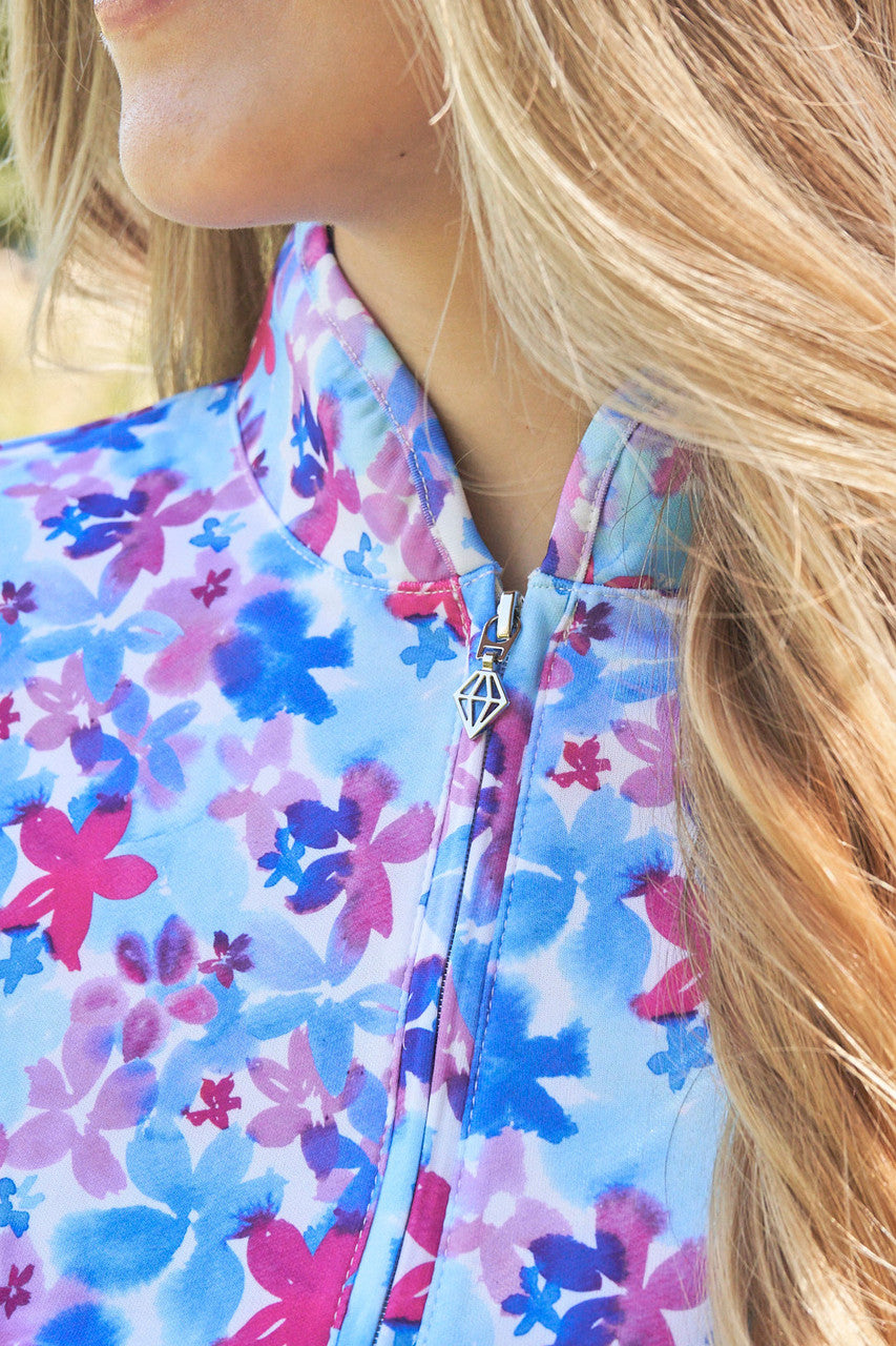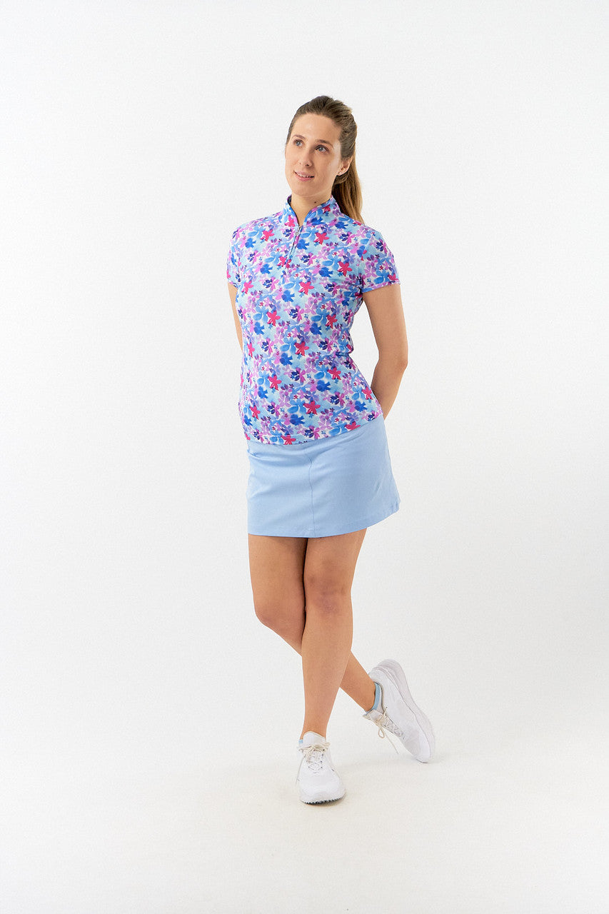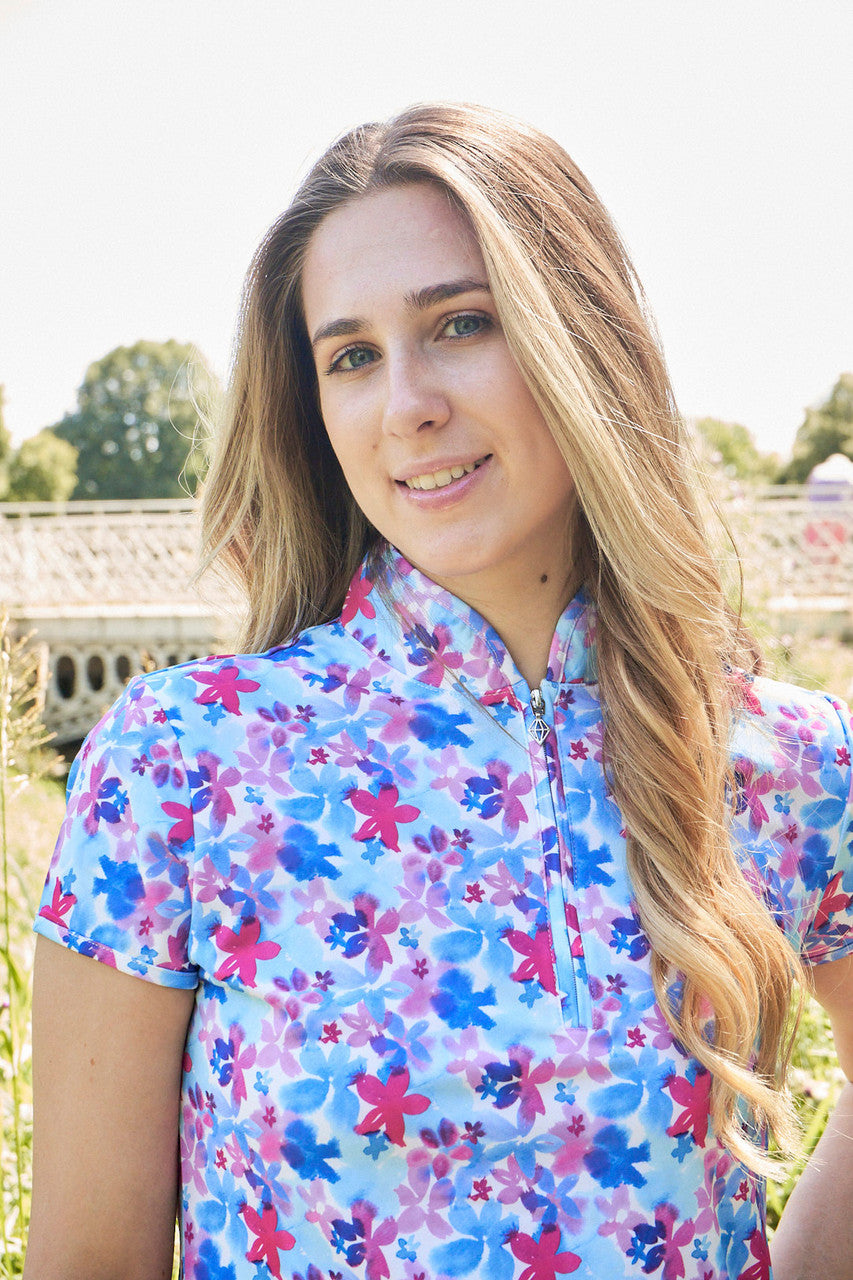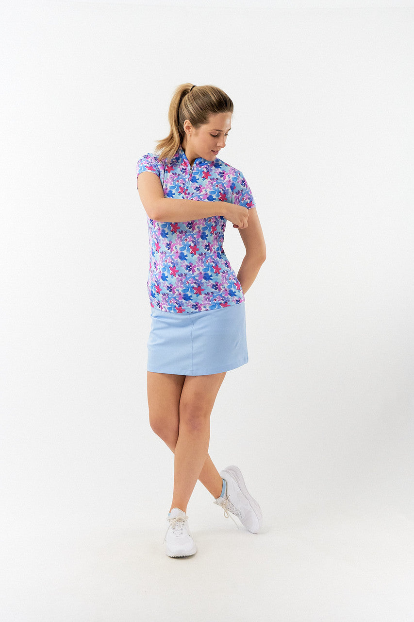 Rise is a versatile full print, cap sleeve zip top made from anti-static, anti-crease, 4 way stretch and quick drying fabric with built in UVA+UVB sun protection with UPF 35 to block harmful rays on the course. Looks great worn with either plain bottoms or a patterned skort subject to the wearer's taste. Deliberately designed to integrate seamlessly with the Watercolour Daydream fashion collection and up to 5 colours from our Essentials range - the outfit options are endless.