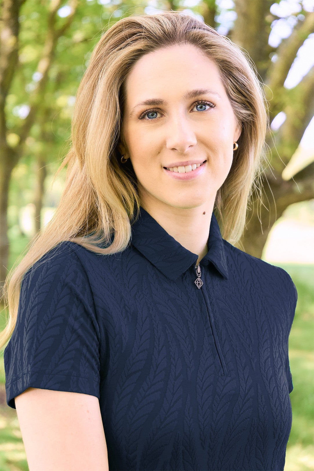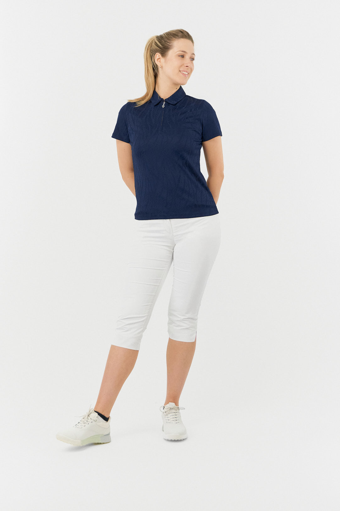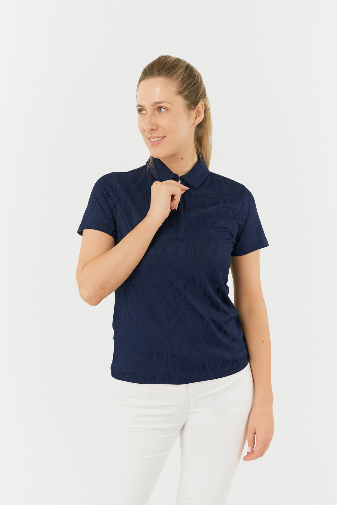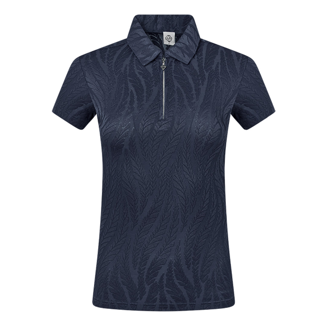 Elevate your look on the green with our Pure Golf Freya-Jacquard Navy Textured Ladies Golf Top. This short-sleeve polo in a classic navy hue from our Pure Golf With Personality Collection flawlessly fuses cutting-edge technology with chic design, ensuring a seamless, head-to-toe style. With its innovative, eye-catching details, this essential piece is ready to transform your wardrobe. Don't miss your chance to make it yours today!