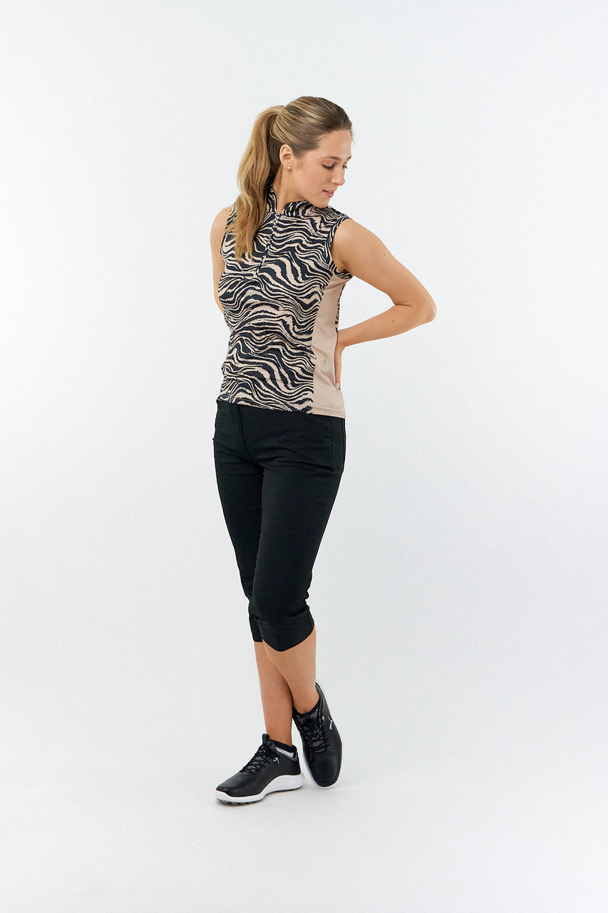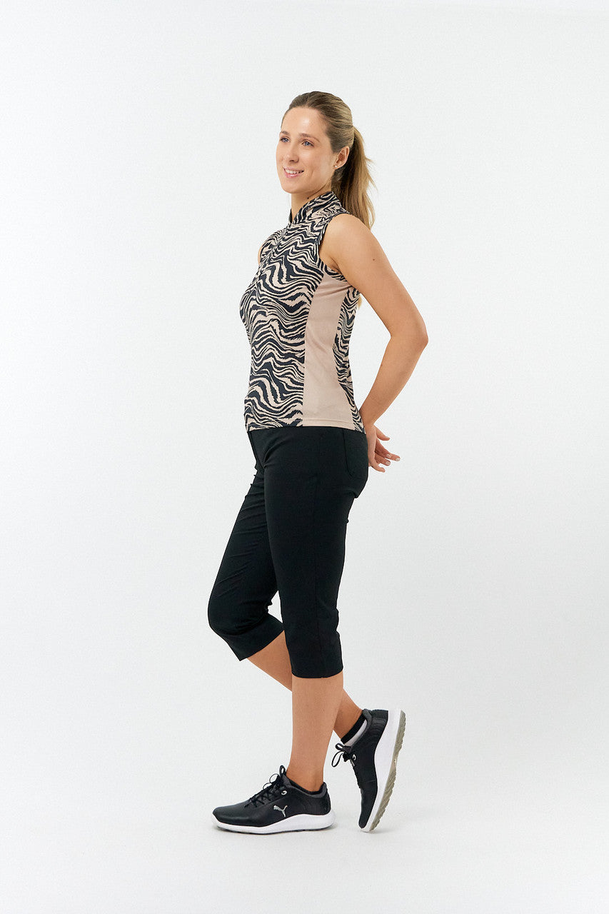 The Bay sleeveless ladies golf polo shirt has striking side panels for a streamlining and flattering effect. Made from anti-static, anti-crease, 4-way stretch, and quick-drying fabric with built-in UVA+UVB sun protection of UPF 35 to block harmful rays on the course. Beautiful worn with either plain black bottoms or a patterned skort. Co-ordinated range available.