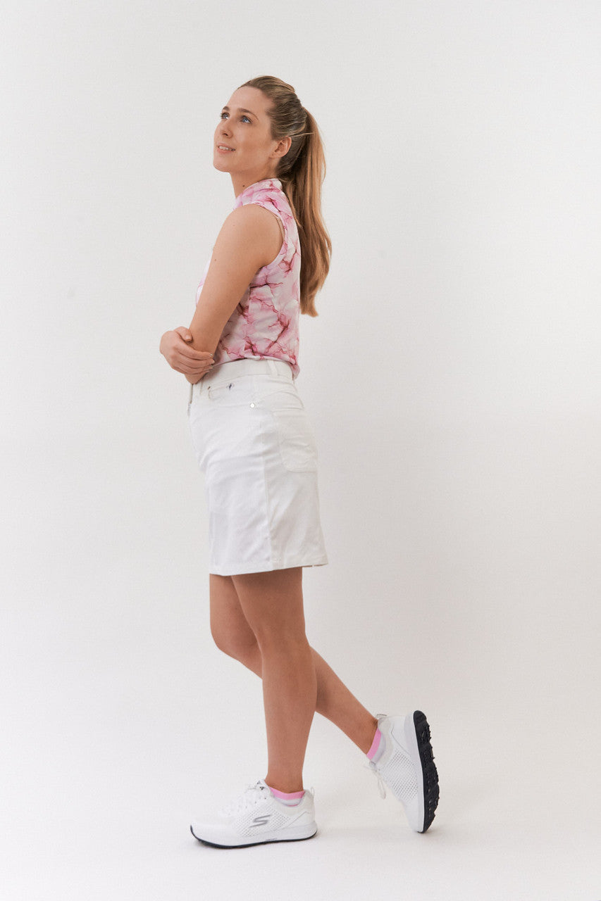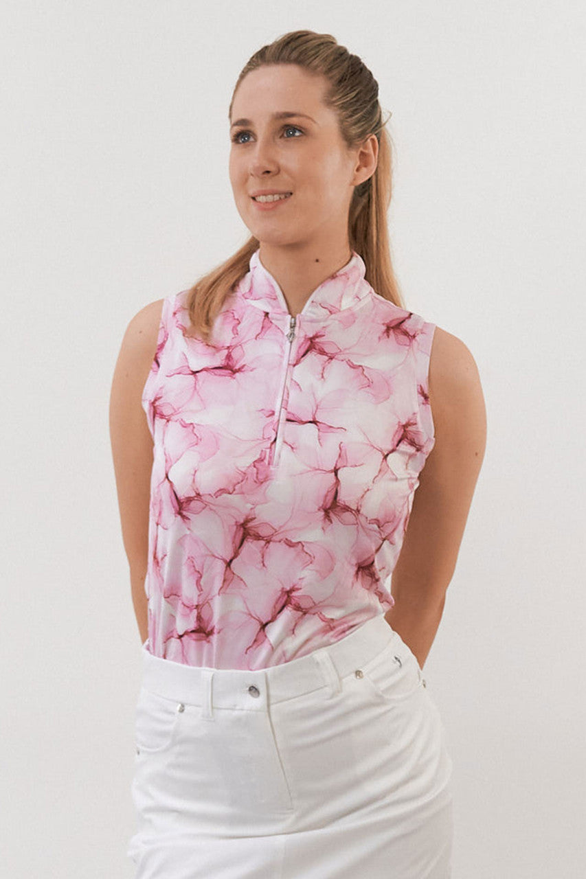 Lucia is a versatile all-over print sleeveless polo shirt made from anti-static, anti-crease, 4 way stretch and quick drying fabric with built in UVA+UVB sun protection with UPF 35 to block harmful rays on the course.