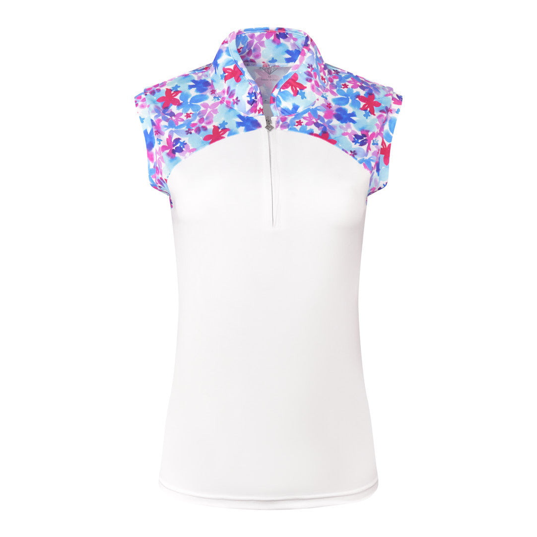 Spirit is a versatile partial print, sleeveless zip top made from anti-static, anti-crease, 4-way stretch, and quick-drying fabric with built-in UVA+UVB sun protection with UPF 35 to block harmful rays on the course. Looks great worn with either plain bottoms or a patterned skort subject to your preference.