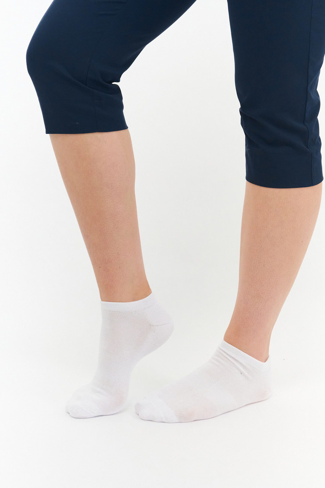 Aqua stripped ladies trainer golf sock. 3 pack with 2 stripped Aqua pairs and one plain white pair with a cushioned sole and compression fit. The lower cut around the ankle makes them less visible when worn with your golf shoes. In an attractive stripe design with the word golf on the sole. Made from a soft, stretchy cotton blend fabric that gives you improved support for your foot. This fabric blend also has great breathability, allowing air to circulate so your feet will feel dry and comfortable whilst not getting sweaty. These Golf Socks won't lose there shape even after many washes. They are suited to UK sizes between 4 and 7.