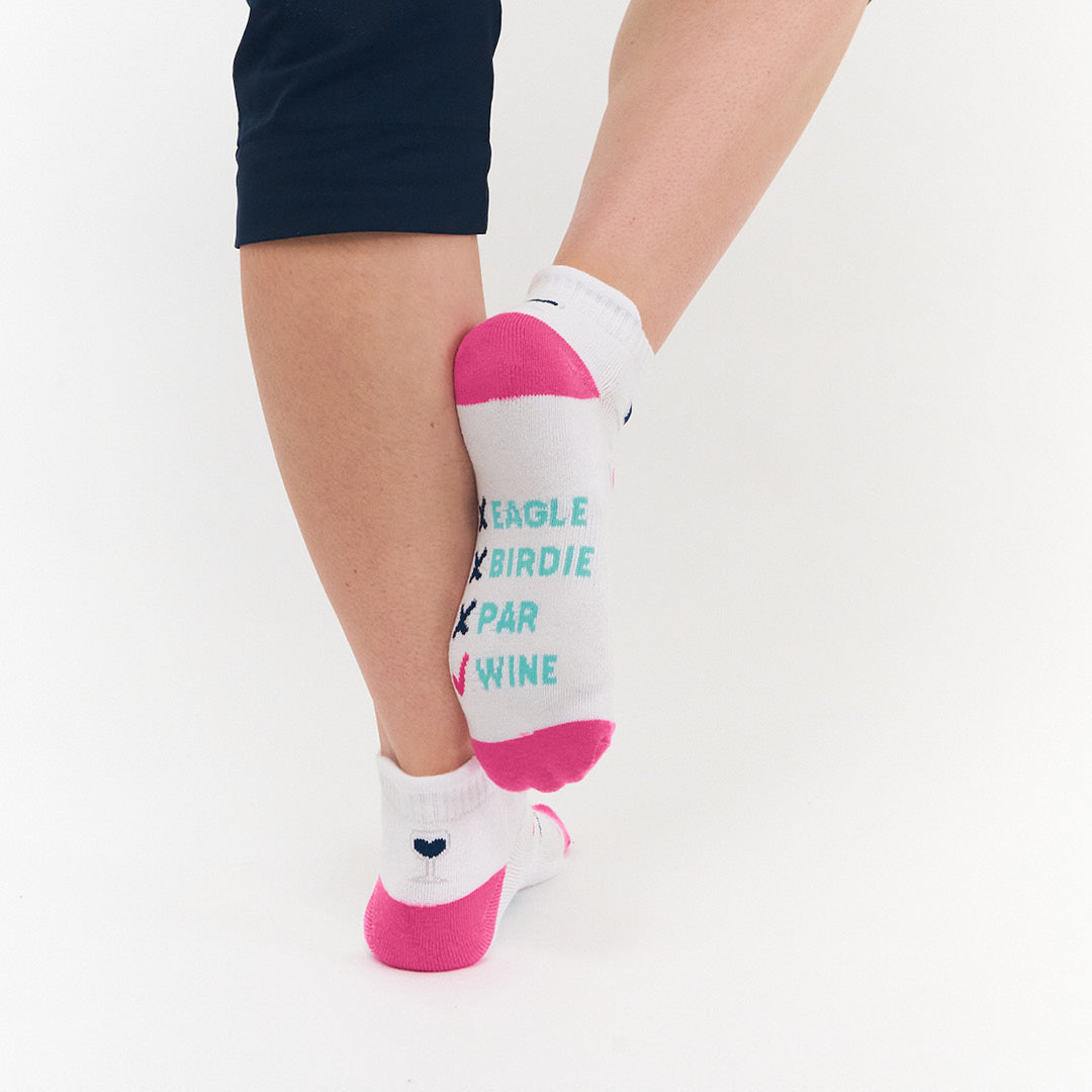 Pair of fun Ladies ankle Golf socks. They have a cushioned sole and compression fit, for maximum comfort as you play golf or around town! Made from a soft, stretchy cotton blend fabric that gives you improved support for your foot. This fabric blend also has great breathability, allowing air to circulate so your feet will feel dry and comfortable whilst not getting sweaty. These Golf Socks won't lose there shape even after many washes. Perfect for the summer months. The pair is suited to UK sizes between 4 and 7.
